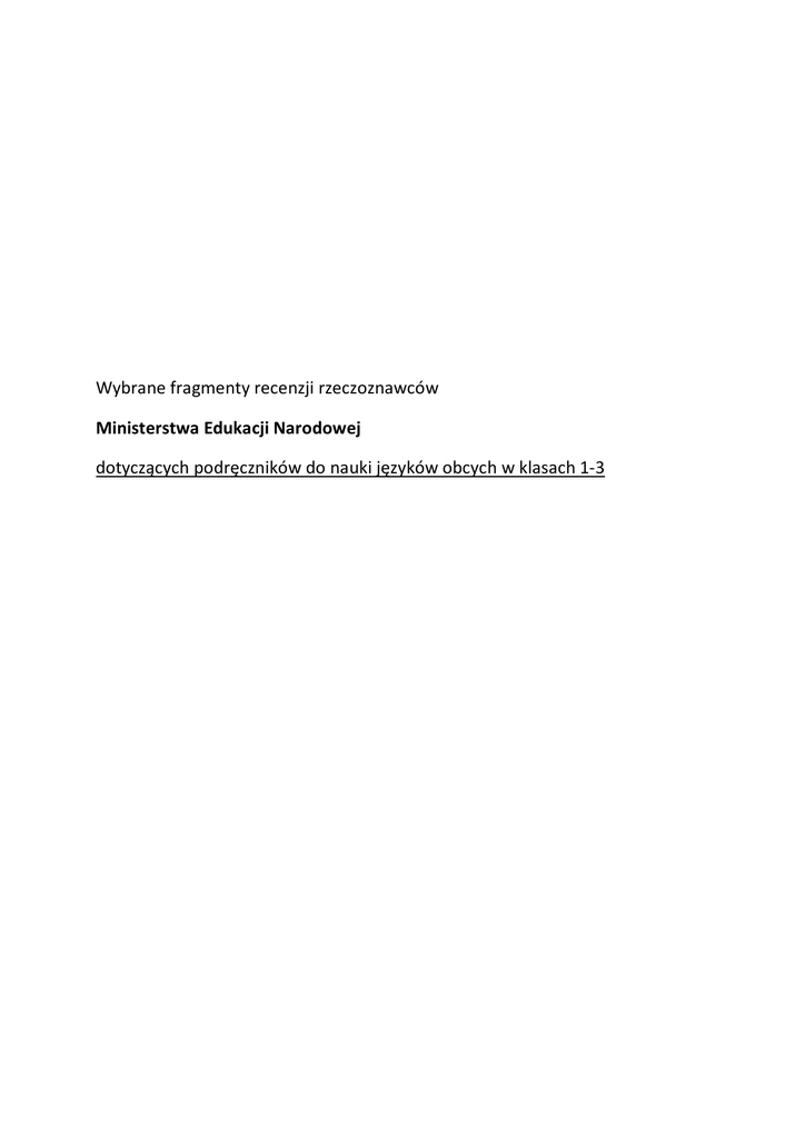 Wybrane fragmenty recenzji rzeczoznawców Ministerstwa Edukacji Narodowej dotyczących podręczników do nauki języków obcych w klasach 1-3 Wydawnictwo Macmillan Polska: Podręcznik Bugs World 1 Fragmenty opinii merytoryczno-dydaktycznej dr Haliny Majer z dnia 13.02.2009 (uwagi do pkt. 3 zawiera formy aktywizujące i motywujące uczniów; ocena: 6) Uczenie przez zabawę – piosenki, gry, rymowanki, kolorowanie, naklejanie, zadania plastyczne – np. dzieci wykonują mini-książeczki, postacie z papieru, karty do zabawy, aktywność ruchowa towarzysząca zabawom, zabawni bohaterowie (owady i ślimak), duże urozmaicenie ćwiczeń, ciekawe historyjki do słuchania, płyta CD ROM z bardzo atrakcyjnymi interaktywnymi zadaniami. (opis zalet podręcznika) Atrakcyjna formuła podręcznika, oparta na zabawie; tematyka dostoswana do poziomu dzieci z klasy 1 (6- i 7-letnich) i zintegrowana z edukacją wczesnoszkolną; różnorodne techniki prezentacji i ćwiczenia materiału językowego, oparte na piosenkach, grach, obrazkach, pracach plastycznych, zabawach ruchowych; (…) dołączenie 2 płyt CD – audio i interaktywnej CD ROM Fragmenty opinii merytoryczno-dydaktycznej dr Małgorzaty Adams –Tukiendorf z dnia 25.02.2009 (uwagi do pkt. II Ocena zgodności treści podręcznika z podstawa programowa kształcenia ogólnego) Pracując z podręcznikiem, uczniowie stopniowo zaznajamiają się z językiem angielskim przede wszystkim poprzez słuchanie i kojarzenie usłyszanych treści z materiałem ilustracyjnym. Materiał do słuchania to proste zdania w kontekście tematycznym czy sytuacyjnym, historyjki, wierszyki lub piosenki. Nacisk położony jest na wyksztalcenie w uczniach umiejętności rozumienia ze słuchu i właściwej reakcji najpierw niewerbalnej (poprzez wskazywanie na obrazku, kolorowanie, naklejanie naklejek, zaznaczanie, numerowanie wg kolejności , łączenie, rysowanie; a potem werbalnej. (uwagi do punktu: Stwierdzam, ze podręcznik jest poprawny pod względem merytorycznym i dydaktycznym) .. znajduję tu wpływ nowej teorii inteligencji wielorakiej Howarda Gardnera, według której każdy człowiek ma w sobie elementy różnych inteligencji, wystarczy je tylko uaktywnić. Pracując z dziećmi, nauczyciel może w nich uaktywniać ich wrodzone talenty i predyspozycje poprzez właściwy dobór zadań rożnego typu. W ostatnich latach obserwuje się duży wpływ tej teorii na materiały dydaktyczne do uczenia języków obcych i nie tylko. W tym kontekście, w Bugs World 1 autorzy proponują zadania typowo językowe, np. uczenie się nowych słówek (inteligencja językowa), zadania oparte o materiał ilustracyjny, czy wymagające rysowania, kolorowania, itp. (inteligencja wzrokowo-przestrzenna), zadania oparte o materiał do słuchania , piosenki czy wierszyki (inteligencja muzyczna), zadania wykorzystujące zdolności manualne i ruch, np. wycinanie, naklejanie, ruch podczas wykonywania piosenek (inteligencja kinestetyczna), zadania wykorzystujące znajomość cyfr, np. numerowanie wg kolejności (inteligencja matematyczno-logiczna) (uwagi do pkt. III.3 podręcznik zawiera formy aktywizujące i motywujące uczniów) Dzieci mogą pracować indywidulanie (rysować, kolorować, szukać szczegółów na obrazkach, wycinać) lub w grupie (śpiewać, reagować na polecenia nauczyciela, grać w gry językowe proponowane w podręczniku) (uwagi dotyczące pkt III.4 podręcznik umożliwia uczniom ze zróżnicowanymi możliwościami nabycie umiejętności określonych w podstawie programowej kształcenia ogólnego) Autorzy dołożyli starań, aby każdy uczeń znalazł w podręczniku coś ciekawego dla siebie. W dostosowaniu się do indywidualnych preferencji uczniów pomagają zróżnicowane pod względem typu zadania językowe, wykorzystujące także inne umiejętności uczniów – np.. zdolności manualne czy plastyczne – wycinanie, kolorowanie, rysowanie; słuchowe czy muzyczne – śpiewanie piosenek, powtarzanie wyrazów za głosem z płyty; matematyczne czy logiczne – numerowanie wg kolejności, znajdywanie i rozróżnianie szczegółów na obrazku, oraz techniczne – praca z komputerem z wykorzystaniem materiałów na CD ROMie Wydawnictwo Macmillan Polska Podręcznik Tiger Fragmenty opinii merytoryczno-dydaktycznej dr Mariusza Marczaka z dnia 12.11.2013 (uwagi do pkt I ocena koncepcji serii) Podręczniki z serii Tiger zostały zaplanowane tak, żeby spełnić wymogi podstawy programowej dla edukacji wczesnoszkolnej w zakresu języka obcego nowożytnego (klasy 1-3). Ćwiczenia przewidziane dla trzech części serii Tiger pozwalają młodszemu uczniowi rozumieć i reagować na proste polecenia, nazywać obiekty w najbliższym otoczeniu, recytować wierszyki i rymowanki (…) Jednocześnie, uczniowi starszemu podręczniki z serii Tiger pozwalają rozróżniać wyrazy o podobnym brzmieniu, reagować na polecenia, rozwijać umiejętności rozumienia ze słuchu: zwrotów z życia codziennego, opowiadań i prostych dialogów wspieranych środkami audio-wizualnymi, czytać ze zrozumieniem wyrazy i proste zdania, zadawać pytania i udzielać odpowiedzi, recytować wiersze, korzystać ze słowników obrazkowych, książeczek oraz materiałów multimedialnych, dołączonych do podręcznika (szablony postaci, mini karty, mini książeczki, słownik obrazkowy w podręczniku, naklejki , płyta CD ROM z nagraniami audio oraz oprogramowanie do tablicy interaktywnej ) (uwagi do pkt IV.1 ) Materiały podręcznikowe pozwalają dziecku uczyć się poprzez zabawę, manipulacje obiektów, prace plastyczne, co uwzględnia sensoryczno-motoryczną charakterystykę ucznia. Ćwiczenia podręcznikowe pozwalają dziecku wykorzystać plastyczność mózgu i wykorzystać potencjał obu półkul mózgowych, które w wieku wczesnoszkolnym nie uległy jeszcze lateryzacji. (uwagi do pkt Iv.3) Kolejną formą aktywności jest umożliwienie uczniom pracy nad językiem angielskim na lekcji i w domu, z wykorzystanie