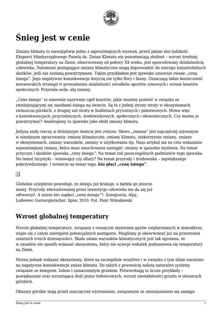 Śnieg jest w cenie Zmiany klimatu to niewątpliwie jedno z najważniejszych wyzwań, przed jakimi stoi ludzkość. Eksperci Międzyrządowego Panelu ds. Zmian Klimatu nie pozostawiają złudzeń – wzrost średniej globalnej temperatury na Ziemi, obserwowany od połowy XX wieku, jest spowodowany działalnością człowieka. Natomiast postępujące zmiany klimatyczne mogą doprowadzić do szeregu katastrofalnych skutków, jeśli nie zostaną powstrzymane. Takim przykładem jest zjawisko umownie zwane „ceną śniegu”. Jego negatywne konsekwencje dotyczą nie tylko flory i fauny. Oznaczają także konieczność nowatorskich strategii w prowadzeniu działalności ośrodków sportów zimowych i wzrost kosztów społecznych. Przyroda woła: idą zmiany. „Cena śniegu” to umownie nazywany ogół kosztów, jakie musimy ponieść w związku ze zmniejszającymi się zasobami śniegu na świecie. Są to z jednej strony straty w ekosystemach, zwłaszcza górskich, z drugiej zaś straty w budżetach prywatnych i państwowych. Mowa więc o konsekwencjach: przyrodniczych, środowiskowych, społecznych i ekonomicznych. Czy można je powstrzymać? Analizujemy to zjawisko jako efekt zmiany klimatu. Jedyną stałą rzeczą w dzisiejszym świecie jest zmiana. Słowo „zmiana” jest najczęściej używanym w niniejszym opracowaniu: zmiany klimatyczne, zmiany klimatu, niekorzystne zmiany, zmiany w ekosystemach, zmiany warunków, zmiany w użytkowaniu itp. Nasz artykuł ma na celu wskazanie najważniejszej zmiany, która musi nieuchronnie nastąpić: zmiany w sposobie myślenia. Na temat przyczyn i skutków zjawiska „ceny śniegu”. Na temat roli poszczególnych podmiotów tego zjawiska. Na temat turystyki – winowajcy czy ofiary? Na temat przyrody i środowiska – największego pokrzywdzonego. I wreszcie na temat tego, kto płaci „cenę śniegu”. Globalne ocieplenie powoduje, że śniegu już brakuje, a będzie go jeszcze mniej. Przyrody zdewastowanej przez inwestycje człowieka nie da się już odtworzyć. A zatem kto zapłaci „cenę śniegu”?. Szwajcaria, Alpy, Lodowiec Gornergletscher, lipiec 2010. Fot. Piotr Witosławski Wzrost globalnej temperatury Wzrost globalnej temperatury, związany z rosnącym stężeniem gazów cieplarnianych w atmosferze, wiąże się z całym szeregiem potencjalnych następstw. Mogliśmy je obserwować już na przestrzeni ostatnich trzech dziesięcioleci. Skala zmian warunków klimatycznych jest tak ogromna, że w zasadzie nie sposób wskazać ekosystemu, który nie ucierpi wskutek podnoszenia się temperatury na Ziemi. Można jednak wskazać ekosystemy, które są szczególnie wrażliwe i w związku z tym silnie narażone na negatywne konsekwencje zmian klimatu. Do takich z pewnością należą naturalne systemy związane ze śniegiem, lodem i zamarzniętym gruntem. Potwierdzają to liczne przykłady – powiększanie oraz wzrastająca ilość jezior lodowcowych, wzrost niestabilności gruntu w obszarach górskich. Obszary górskie stoją przed znaczącymi wyzwaniami, związanymi ze zmniejszaniem się zasięgu Śnieg jest w cenie 1 pokrywy śnieżnej. Zgodnie z prognozami, zmiany klimatyczne będą miały znaczący wpływ na utratę różnorodności biologicznej i stworzą zagrożenie dla funkcjonowania górskich ekosystemów. Bioróżnorodność regionów górskich jest wyjątkowo wrażliwa na zmiany klimatu. Nie zapominajmy jednak, że ekosystemy podlegają różnym czynnikom stresu. Zmiany klimatyczne są jednym z nich, ale często ważniejsze znaczenie mają inne przejawy antropopresji, takie jak zanieczyszczenie powietrza, wody i gleby, nadmierna eksploatacja, fragmentacja i degradacja środowiska. Zmiany klimatu mogą wzmacniać te niekorzystne zmiany. Zmiany w ekosystemach górskich Jednym z najbardziej charakterystycznych zjawisk, będących następstwem przeobrażeń warunków klimatycznych, są obserwowane zmiany zasięgów gatunków górskich. Większość regionów górskich charakteryzuje się obecnością wyraźnych stref roślinności, które zmieniają się wraz z wysokością. Na skutek zmian klimatycznych obserwujemy przesunięcie wielu europejskich gatunków roślin w górę zboczy. Prowadzić to będzie do spadku liczby dostępnych siedlisk, ponieważ wyższe partie gór charakteryzują się znacznie mniejszą powierzchnią. Co więcej, gatunki charakterystyczne dla niżej położonych partii gór, zmuszone do migracji w górę zboczy, wypierać będą gatunki wysokogórskie z ich naturalnych siedlisk. Wiele gatunków wysokogórskich może nie mieć możliwości migracji w poszukiwaniu nowych nisz, co skutkować będzie spadkiem ich udziału lub nawet wymarciem na skutek nasilonej konkurencji. Tylko małe połacie roślinności, związane z najbardziej niedostępnymi siedliskami, pozostaną nienaruszone. Zmiany w zbiorowiskach roślinnych ekosystemów górskich nie pozostaną bez wpływu na populacje zwierząt i innych elementów ekosystemu od nich zależnych. W wielu krajach granica występowania drzew przesuwa się w górę. W Alpach w ciągu ostatnich 60 lat różne gatunki świerka i sosny wyemigrowały na piętro wyższe, subalpejskie, a krzewy rosnące na piętrze subalpejskim przesunęły się na szczyty gór. Podobne zjawisko obserwujemy także w Polsce – przesuwanie się granicy lasów ku górze zagraża naszym słynnym, wysokogórskim halom, które mogą zostać w przyszłości zalesione. Zjawiskiem związanym ze zmieniającymi się warunkami klimatycznymi jest utrata objętości lodu i zmniejszanie się powierzchni zajmowanej przez śnieżniki, czyli trwałą pokrywę śnieżną w górach. Skracanie okresu z trwałą pokrywą śnieżną jest zjawiskiem prawdopodobnie nieodwracalnym i negatywnie wpływającym na wszystkie elementy środowiska. Najpoważniejszym rezultatem tych zmian jest odsłonięcie nagiego gruntu w sezonie pozawegetacyjnym, co czyni go bardziej podatnym na procesy masowe. Kolejnym istotnym zagrożeniem