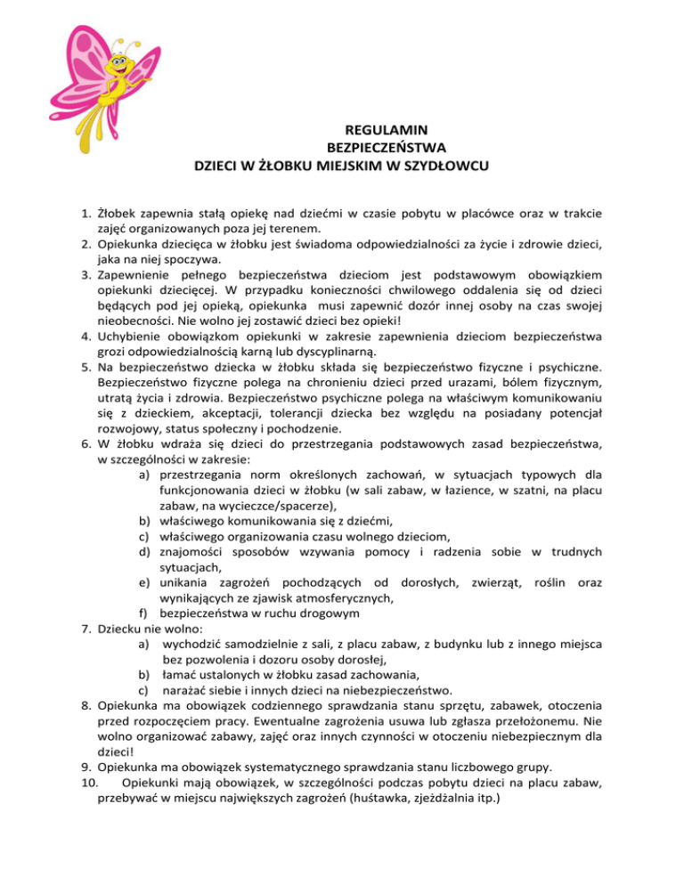 REGULAMIN BEZPIECZEŃSTWA DZIECI W ŻŁOBKU MIEJSKIM W SZYDŁOWCU 1. Żłobek zapewnia stałą opiekę nad dziećmi w czasie pobytu w placówce oraz w trakcie zajęć organizowanych poza jej terenem. 2. Opiekunka dziecięca w żłobku jest świadoma odpowiedzialności za życie i zdrowie dzieci, jaka na niej spoczywa. 3. Zapewnienie pełnego bezpieczeństwa dzieciom jest podstawowym obowiązkiem opiekunki dziecięcej. W przypadku konieczności chwilowego oddalenia się od dzieci będących pod jej opieką, opiekunka musi zapewnić dozór innej osoby na czas swojej nieobecności. Nie wolno jej zostawić dzieci bez opieki! 4. Uchybienie obowiązkom opiekunki w zakresie zapewnienia dzieciom bezpieczeństwa grozi odpowiedzialnością karną lub dyscyplinarną. 5. Na bezpieczeństwo dziecka w żłobku składa się bezpieczeństwo fizyczne i psychiczne. Bezpieczeństwo fizyczne polega na chronieniu dzieci przed urazami, bólem fizycznym, utratą życia i zdrowia. Bezpieczeństwo psychiczne polega na właściwym komunikowaniu się z dzieckiem, akceptacji, tolerancji dziecka bez względu na posiadany potencjał rozwojowy, status społeczny i pochodzenie. 6. W żłobku wdraża się dzieci do przestrzegania podstawowych zasad bezpieczeństwa, w szczególności w zakresie: a) przestrzegania norm określonych zachowań, w sytuacjach typowych dla funkcjonowania dzieci w żłobku (w sali zabaw, w łazience, w szatni, na placu zabaw, na wycieczce/spacerze), b) właściwego komunikowania się z dziećmi, c) właściwego organizowania czasu wolnego dzieciom, d) znajomości sposobów wzywania pomocy i radzenia sobie w trudnych sytuacjach, e) unikania zagrożeń pochodzących od dorosłych, zwierząt, roślin oraz wynikających ze zjawisk atmosferycznych, f) bezpieczeństwa w ruchu drogowym 7. Dziecku nie wolno: a) wychodzić samodzielnie z sali, z placu zabaw, z budynku lub z innego miejsca bez pozwolenia i dozoru osoby dorosłej, b) łamać ustalonych w żłobku zasad zachowania, c) narażać siebie i innych dzieci na niebezpieczeństwo. 8. Opiekunka ma obowiązek codziennego sprawdzania stanu sprzętu, zabawek, otoczenia przed rozpoczęciem pracy. Ewentualne zagrożenia usuwa lub zgłasza przełożonemu. Nie wolno organizować zabawy, zajęć oraz innych czynności w otoczeniu niebezpiecznym dla dzieci! 9. Opiekunka ma obowiązek systematycznego sprawdzania stanu liczbowego grupy. 10. Opiekunki mają obowiązek, w szczególności podczas pobytu dzieci na placu zabaw, przebywać w miejscu największych zagrożeń (huśtawka, zjeżdżalnia itp.) 11. Podczas zajęć organizowanych w salach zabaw lub innych pomieszczeń uwaga opiekunek powinna być skierowana na dzieci. 12. Opiekunka ma obowiązek organizowania zajęć w sposób przemyślany, tak aby przewidywać ewentualne zagrożenia i im przeciwdziałać. 13. Dzieci przemieszczają się parami lub gęsiego („pociąg”), np. do szatni i na wycieczki piesze. W szatni oraz w łazience dzieci podlegają szczególnej kontroli ze strony pracowników żłobka. Opiekunki i osoby im pomagające są zobowiązane do monitorowania tych pomieszczeń. 14. Każdy pracownik żłobka jest zobowiązany zareagować w przypadku zauważenia dziecka pozostającego bez opieki w żłobku lub na placu zabaw (w każdym miejscu poza salą). 15. Każdy pracownik przedszkola jest obowiązany do sprawdzania zabezpieczeń drzwi, okien w trakcie swojej pracy oraz zabezpieczenia dostępu dzieci do środków chemicznych. 16. Każde wyjście opiekunki z grupą poza teren żłobka wpisywane jest do zeszytu wyjść z podaniem miejsca, celu wyjścia, planowanego czasu pobytu. 17. Organizacja wycieczek przebiega na zasadach określonych w regulaminie wycieczek. 18. W razie wystąpienia wypadku dziecka na terenie żłobka lub poza nim opiekunka jest obowiązana do udzielenia pomocy oraz przestrzegania procedury postępowania w razie wypadku. 19. Rodzice mają obowiązek przyprowadzania i odbierania dzieci według zasad określonych w regulaminie organizacyjnym żłobka przyprowadzania i odbierania dzieci ze żłobka. 20. Obowiązkiem rodziców jest przyprowadzenie do żłobka dziecka zdrowego, czystego, ubranego w odzież adekwatną do pogody. 21. Rodzice przed oddaniem dziecka do grupy powinni kontrolować, czy dziecko nie posiada przedmiotów zagrażających jego bezpieczeństwu oraz bezpieczeństwu rówieśników. 22. Opiekunki nie mają uprawnień do podawania dzieciom żadnych leków. W przypadku gdy dziecko wymaga codziennej pomocy medycznej na terenie żłobka decyzję podejmuje dyrektor, który ustala zasady tej pomocy z rodzicami/prawnymi opiekunami. Dyrektor Żłobka Miejskiego w Szydłowcu Magdalena Nowacka
