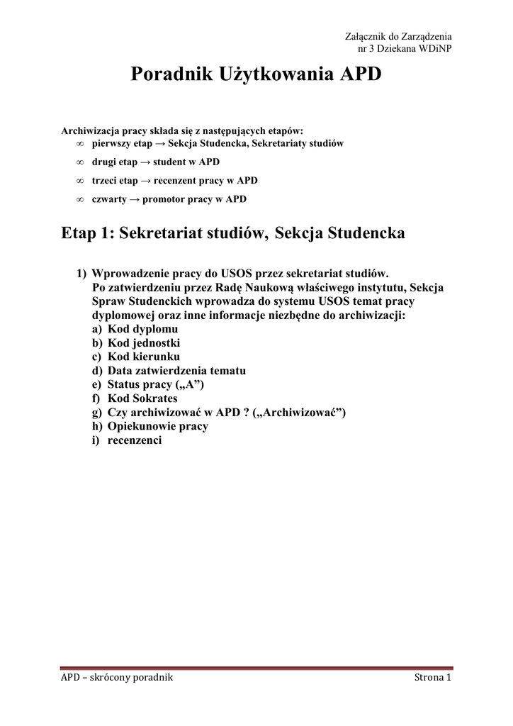 Załącznik do Zarządzenia nr 3 Dziekana WDiNP Poradnik Użytkowania APD Archiwizacja pracy składa się z następujących etapów: • pierwszy etap → Sekcja Studencka, Sekretariaty studiów • drugi etap → student w APD • trzeci etap → recenzent pracy w APD • czwarty → promotor pracy w APD Etap 1: Sekretariat studiów, Sekcja Studencka 1) Wprowadzenie pracy do USOS przez sekretariat studiów. Po zatwierdzeniu przez Radę Naukową właściwego instytutu, Sekcja Spraw Studenckich wprowadza do systemu USOS temat pracy dyplomowej oraz inne informacje niezbędne do archiwizacji: a) Kod dyplomu b) Kod jednostki c) Kod kierunku d) Data zatwierdzenia tematu e) Status pracy („A”) f) Kod Sokrates g) Czy archiwizować w APD ? („Archiwizować”) h) Opiekunowie pracy i) recenzenci APD – skrócony poradnik Strona 1 Załącznik do Zarządzenia nr 3 Dziekana WDiNP obraz:1 obraz:2 APD – skrócony poradnik Strona 2 Załącznik do Zarządzenia nr 3 Dziekana WDiNP Etap 2: Student 1) Przygotowanie pracy do archiwizacji Po zdefiniowaniu w USOS pracy przez sekretariat studiów student ma możliwość wgrania pracy w systemie APD. Student ma obowiązek odpowiednio nazwać plik pracy aby system APD zarchiwizował go bez błędów (plik musi być w formacie PDF, inne formaty nie są ). Nazwa pracy składa się z 2 członów: Kodu Dyplomu oraz PESEL-u Przykład: 2101-MGR-DK-00000000000 (po wgraniu pracy PESEL jest konwertowany przez system na unikatowy numer) Kody Dyplomu są dostępne na stronie wdinp.uw.edu.pl w zakładce „Studenci”. 2) Logowanie, wprowadzanie danych oraz pracy do systemu. Student loguje się na adres strony https://apd.uw.edu.pl → zakładka MOJE PRACE za pomocą numeru PESEL oraz hasła CUS, czyli takiego jak do usosweba. obraz:3 Student → wybiera swoją pracę APD – skrócony poradnik Strona 3 Załącznik do Zarządzenia nr 3 Dziekana WDiNP obraz:4 Po przejściu (obraz:4) Student → wybiera język pracy, umieszcza streszczenie, słowa kluczowe. Zatwierdza wpisane dane poprzez kliknięcie „ZAPISZ DANE PRACY” Następnie student przechodzi do dodania pracy (obraz:5) obraz:5 Po umieszczeniu pracy należy kliknąć → „Edytuj pliki” (obraz:6) APD – skrócony poradnik Strona 4 Załącznik do Zarządzenia nr 3 Dziekana WDiNP obraz:6 obraz:7 Student tworzy nowy zestaw z plikami (obraz:7) APD – skrócony poradnik Strona 5 Załącznik do Zarządzenia nr 3 Dziekana WDiNP obraz:8 → Student wybiera swoją pracę klikając „Przeglądaj” Wybrany dokument (pdf) dodaje do zestawu plików danej obrony „DODAJ DO ZESTAWU” → Elementem kończącym wprowadzanie pracy jest zatwierdzenie zestawu plików pracy „ZATWIERDŹ OSTATNI ZESTAW”(obraz:8) APD – skrócony poradnik Strona 6 Załącznik do Zarządzenia nr 3 Dziekana WDiNP Etap 3: Recenzent 1) Logowanie Recenzent loguje się na adres strony https://apd.uw.edu.pl → zakładka MOJE PRACE za pomocą numeru PESEL oraz hasła CUS, czyli takiego jak do usosweba. obraz:9 Pojawiają się opcje: → w zakładce „kierujący pracą „ możemy podejrzeć wszystkie prace, w których jesteśmy kierującym.; → w zakładce „recenzent” możemy podejrzeć prace, w których umieściliśmy recenzje → zakładka „członek komisji” pozwoli podejrzeć prace gdzie zasiadamy w komisji egzaminacyjnej → „wpisz recenzje” → tu mamy możliwość wprowadzenia recenzji dla prac studentów. 2)Wpisywanie recenzji Po wybraniu odpowiedniej pracy z zakładki „wpisz recenzje” APD – skrócony poradnik Strona 7 Załącznik do Zarządzenia nr 3 Dziekana WDiNP obraz:10 →Przechodzimy do poniższej strony, musimy przewinąć na sam dół strony obraz:11 → (obraz:11) →opcja wpisania recenzji, „czerwona kartka z A” klikamy na znaczek → mamy możliwość wpisania recenzji. APD – skrócony poradnik Strona 8 Załącznik do Zarządzenia nr 3 Dziekana WDiNP obraz:12 → Pierwsza cześć strony, wypełniamy dane recenzji obraz:13 W dolnej części (obraz:13) → Wpisywanie recenzji „edytuj odpowiedzi” - (zaznaczone kwadratem) → wypełniamy wszystkie podpunkty; APD – skrócony poradnik Strona 9 Załącznik do Zarządzenia nr 3 Dziekana WDiNP → Zapisanie recenzji „zatwierdź recenzję”- (zaznaczone na powyższym obrazku okrągłym zaznaczeniem) → recenzja została wprowadzona do systemu. Modyfikacja recenzji wykonuje się tak samo jak samo wpisanie recenzji → punkt 2. Etap 4:Promotor APD – skrócony poradnik Strona 10 Załącznik do Zarządzenia nr 3 Dziekana WDiNP 1)Logowanie Promotor loguje się pod adresem: https://apd.uw.edu.pl → zakładka MOJE PRACE za pomocą numeru PESEL oraz hasła CUS, czyli takiego jak do usosweba. obraz:14 Prowadzący wyszukuje prace, która powinna zatwierdzić: obraz:15 Zatwierdzanie pracy →,,PRACA GOTOWA DO OBRONY – ZAKOŃCZ PROCES OBSŁUGI” (powoduje) zapisanie i zakończenie całego procesu archiwizacji). UWAGA!!! APD – skrócony poradnik Strona 11 Załącznik do Zarządzenia nr 3 Dziekana WDiNP Promotor może zatwierdzić pracę dopiero po wpisaniu przez recenzentów recenzji. Po zatwierdzeniu pracy nie jest już możliwe wpisanie recenzji. Po zatwierdzeniu pracy przez promotora student jest zobowiązany do złożenia wymaganych dokumentów w odpowiednim sekretariacie studiów najpóźniej 14 dni przed wyznaczonym terminem obrony. Bez sprawdzenia i zatwierdzenia pracy przez promotora nie jest możliwe wygenerowanie z systemu USOS niezbędnych dokumentów do obrony. APD – skrócony poradnik Strona 12