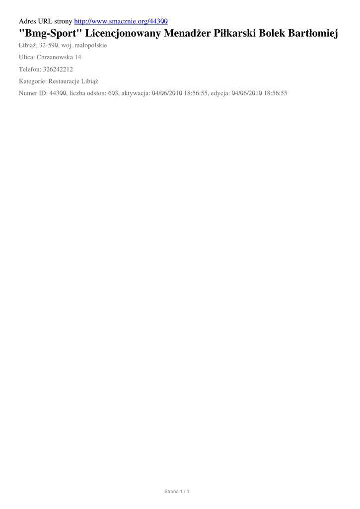 Adres URL strony http://www.smacznie.org/44300 "Bmg-Sport" Licencjonowany Menadżer Piłkarski Bolek Bartłomiej Libiąż, 32-590, woj. małopolskie Ulica: Chrzanowska 14 Telefon: 326242212 Kategorie: Restauracje Libiąż Numer ID: 44300, liczba odsłon: 603, aktywacja: 04/06/2010 18:56:55, edycja: 04/06/2010 18:56:55 Strona 1 / 1