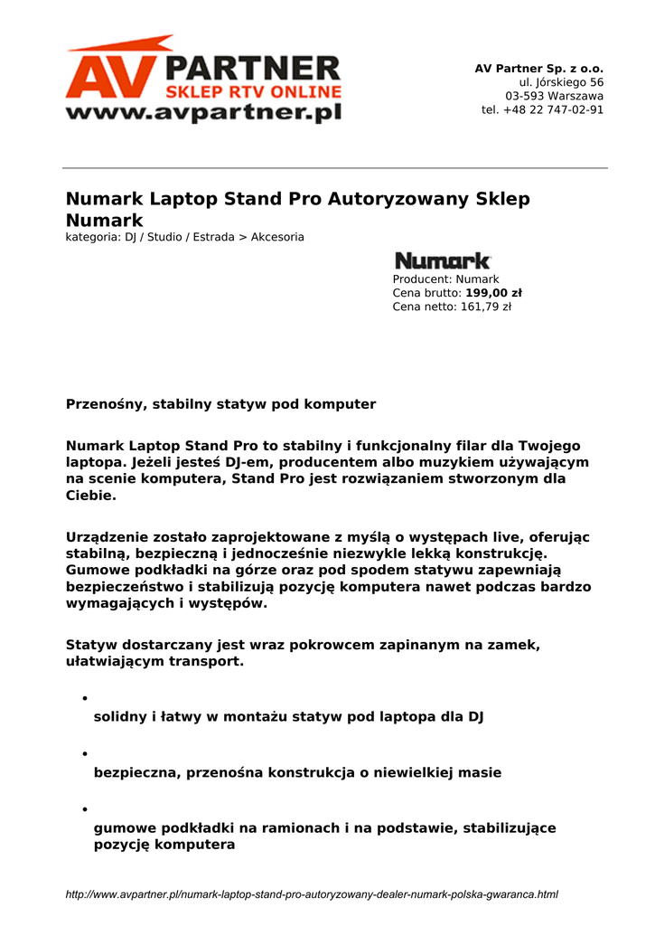 AV Partner Sp. z o.o. ul. Jórskiego 56 03-593 Warszawa tel. +48 22 747-02-91 Numark Laptop Stand Pro Autoryzowany Sklep Numark kategoria: DJ / Studio / Estrada > Akcesoria Producent: Numark Cena brutto: 199,00 zł Cena netto: 161,79 zł Przenośny, stabilny statyw pod komputer Numark Laptop Stand Pro to stabilny i funkcjonalny filar dla Twojego laptopa. Jeżeli jesteś DJ-em, producentem albo muzykiem używającym na scenie komputera, Stand Pro jest rozwiązaniem stworzonym dla Ciebie. Urządzenie zostało zaprojektowane z myślą o występach live, oferując stabilną, bezpieczną i jednocześnie niezwykle lekką konstrukcję. Gumowe podkładki na górze oraz pod spodem statywu zapewniają bezpieczeństwo i stabilizują pozycję komputera nawet podczas bardzo wymagających i występów. Statyw dostarczany jest wraz pokrowcem zapinanym na zamek, ułatwiającym transport. solidny i łatwy w montażu statyw pod laptopa dla DJ bezpieczna, przenośna konstrukcja o niewielkiej masie gumowe podkładki na ramionach i na podstawie, stabilizujące pozycję komputera http://www.avpartner.pl/numark-laptop-stand-pro-autoryzowany-dealer-numark-polska-gwaranca.html możliwość przykręcenia do ściany w studio nagraniowym w zestawie pokrowiec na zamek ułatwiający przenoszenie http://www.avpartner.pl/numark-laptop-stand-pro-autoryzowany-dealer-numark-polska-gwaranca.html