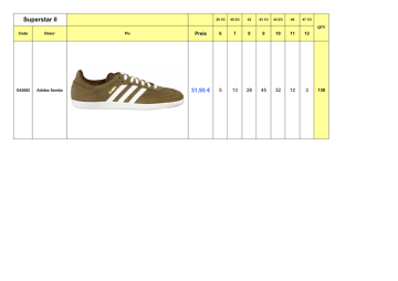 Superstar II 39 1/3 40 2/3 42 43 1/3 44 2/3 46 47 1/3 Preis 6 7 8 9 10 11 12 31,95 € 5 13 28 45 32 12 3 QTY Code Descr G42692 Adidas Samba Pic 138