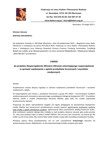 Federacja na rzecz Kobiet i Planowania Rodziny ul. Nowolipie 13/15; 00-150 Warszawa tel./fax: 022 635 93 95; 022 887 81 40 www.federa.org.pl ; [email protected] Warszawa, 19 lutego 2015 r. Minister Zdrowia BARTOSZ ARŁUKOWICZ Na podstawie Uchwały nr 190 Rady Ministrów z dnia 29 października 2013 – Regulamin pracy Rady Ministrów w nawiązaniu do pisma PLO.462.4.2015, Federacja na rzecz Kobiet i Planowania Rodziny (wraz z działającym przy Federacji Zespołem Pomocy Prawnej, Fundacją Feminoteka, Fundacją Rodzić po Ludzku oraz Stowarzyszeniem na rzecz Leczenia Niepłodności i Wspierania Adopcji „Nasz Bocian”) przedstawia: UWAGI do projektu Rozporządzenia Ministra Zdrowia zmieniającego rozporządzenie w sprawie wydawania z apteki produktów leczniczych i wyrobów medycznych. WSTĘP Projektowana zmiana dotyczy regulacji w zakresie wydawania produktów leczniczych i wyrobów medycznych z apteki. W rozporządzeniu jest mowa o „produkcie leczniczym z grupy ATC G03A – hormonalnych środkach antykoncepcyjnych stosowania wewnętrznego, posiadającym kategorię dostępności OTC”. W praktyce obecnie chodzi o środek antykoncepcji doraźnej EllaOne, gdyż tylko ten środek odpowiada przytoczonemu opisowi. Proponuje się zatem wprowadzenie wyjątku od reguły polegającej na powszechnej dostępności środka EllaOne bez konieczności przedstawiania recepty poprzez ograniczenie możliwości wydania tego środka z apteki określonym osobom. Ograniczenie takie ustanowiono według kryterium wieku. Brak możliwości wydania takiego leku miałaby w myśl projektu dotyczyć sytuacji, gdy osoba poniżej 15. roku życia próbuje kupić w aptece środek EllaOne. Nie ma przy tym znaczenia, czy kupuje go dla siebie czy dla innej osoby. Aby można było wydać środek, osoba taka musiałaby przedstawić receptę. Niniejsza opinia, którą przedstawiamy, ma na celu uzasadnienie krytycznego stosunku do proponowanej zmiany. Wątpliwości, co do proponowanego kształtu przepisu jest wiele. CEL REGULACJI I JEJ FAKTYCZNE ODDZIAŁYWANIE Deklarowanym celem jest ograniczenie dostępności środka EllaOne bez recepty dla osób, które nie osiągnęły wieku 15 lat. W uzasadnieniu do projektowanej zmiany podawana jest argumentacja świadcząca jednak o tym, że faktycznym celem tego przepisu jest chęć ograniczenia zażywania środka EllaOne przez osoby małoletnie przed ukończeniem 15. roku życia . Warto przy tym zwrócić uwagę, że przedmiotowe rozporządzenie w związku z zakresem obowiązywania (skierowane jest do aptekarzy i reguluje zasady wykonywania przez nich zawodu) nie jest w stanie uregulować tego, że osoby poniżej określonego wieku nie będą zażywać tego środka. NADZÓR LEKARZA W uzasadnieniu jest mowa o tym, że dostępność tych środków dla osób poniżej 15. roku życia ma się odbywać pod nadzorem lekarza. W sposób faktyczny jednak sprowadza się to do nadzoru rodziców lub opiekunów. Osoba poniżej lat 15 nie może co do zasady w świetle obowiązujących przepisów (Ustawa o prawach pacjenta oraz Ustawa o zawodach lekarza i lekarza dentysty) samodzielnie uzyskać żadnego świadczenia zdrowotnego (w tym porady, badania lekarskiego czy też wypisania recepty). W praktyce zaś oznacza to najczęściej konieczność odbycia wizyty lekarskiej w obecności rodzica lub opiekuna. Kwestią podstawową nie jest zatem to, czy – przy założeniu przyjęcia proponowanych rozwiązań – małoletnia dziewczyna poniżej 15. roku życia będzie ten środek zażywać, ale to, że nie będzie mogła go bez recepty kupić. Od osób, które nie mają wsparcia rodziców lub opiekunów, ten przepis wymagać zatem będzie w praktyce znalezienia osoby, która osiągnęła wiek 15 lat i zgodzi się na zakup środka w aptece. Deklarowana chęć zapewnienia nadzoru lekarza jest iluzoryczna i stanowi o braku odniesienia do sytuacji występujących w realnym świecie. GRANICA WIEKU 15 LAT W uzasadnieniu ustalenie granicy na wiek 15 lat usprawiedliwia się dwiema okolicznościami – osiągnięciem dojrzałości płciowej i wieku rozrodczego – które są przez autorów w zasadzie, w sposób błędny, zrównywane. Podaje się, że leki antykoncepcyjne powinny zażywać osoby, które są w wieku rozrodczym. Jest to stwierdzenie słuszne o tyle, że środki antykoncepcyjne mają na celu zapobiec ciąży, zaś zajście w ciążę możliwe jest tylko w wieku rozrodczym (reprodukcyjnym). Początek tego wieku nie może być jednak określony jako moment osiągnięcia wieku 15 lat, ponieważ zaczyna się on wraz z pierwszą owulacją. Pierwsza miesiączka jest zakończeniem pierwszego cyklu menstruacyjnego, w którym do owulacji doszło. Wiek, w którym to następuje to u niektórych dziewczynek nawet 12. rok życia. Wraz z tym momentem wchodzą one zatem w wiek rozrodczy. Nie należy go utożsamiać z osiągnięciem dojrzałości płciowej, która również jest kwestią indywidualną. W uzasadnieniu błędnie podaje się natomiast, że osiągnięcie wieku rozrodczego następuje wraz z osiągnięciem dojrzałości płciowej i ma miejsce średnio 2 lata po pierwszej miesiączce i średnio po 15. roku życia. Jest to rozumowanie z medycznego punktu widzenia fałszywe. Dodatkowo, taka logika, oznacza w istocie przekonanie o tym, że dziewczynki, które mają kontakty seksualne przed 15. rokiem życia w zasadzie nie mogą zajść w ciążę, nawet jeśli zaczęły już miesiączkować. Postawić można zatem pytanie pod adresem autorów uzasadnienia, dlaczego w obliczu takiego przekonania, stoją oni na stanowisku, że taka dziewczynka w ogóle miałyby zażywać środki antykoncepcyjne, czy to pod nadzorem lekarza czy bez tego nadzoru, skoro według przekonania widocznego w uzasadnieniu w ogóle nie znajduje się w wieku rozrodczym. WZGLĘDY MEDYCZNE W uzasadnieniu jest mowa także o tym, że stosowanie środków antykoncepcyjnych uzasadnione powinno być wyłącznie względami medycznymi. Nie spos