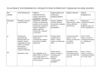 PLAN PRACY WYCHOWAWCZO- DYDAKTYCZNEJ W ŚWIETLICY SZKOLNEJ NA ROK 2010/2011 M-c tydzień Cykl tematyczny Imprezy okolicznościowe; zajęcia umysłowe; pogadanki; dyskusje Zajęcia plastyczno techniczne; projekcje filmów Zajęcia ruchowe Zajęcia komputerowe Wrzesień Poznajmy zwyczaje naszej świetlicy. Zapoznanie z tematami świetlicy. Kształtowanie podstawowych nawyków społecznego współżycia (zgodne współżycie w grupie, poprawne zachowanie, wzajemna życzliwość). Piszemy regulamin świetlicy szkolnej. Jak powinien wyglądać prawdziwy gimnazjalista? Gry i zabawy sportowe (gra w piłkę nożną, siatkówkę, koszykówkę). Zapoznanie z zasadami korzystania ze sprzętu komputerowego, TV, DVD i magnetofonu. Wychowanie komunikacyjne. Bezpieczeństwo na drogach i ulicach (pogadanka na temat szkód wywołanych kierowaniem pojazdami pod wpływem alkoholu). Nauka przepisów ruchu drogowego i rozpoznawanie znaków przy pomocy kodeksu drogowego. Projekcja filmu: „bezpiecznie na drodze”- relacje uczniów po obejrzeniu filmu. „Na skrzyżowaniu” – zabawy w ruch uliczny, po nauczeniu się znaków drogowych. Praca w Power Poincie, uczniowie wykonują prezentacje pt.: „Bezpieczne ulice”. Jak wyglądałby świat, gdyby ludzie nie śmiecili? Co ja mogę zrobić a co mogą zrobić inni by świat był czyściejszy?. Ziemia naszym domem- uczniowie wykonują prace plastyczne techniką ”wysypywanki i układanki”. Sprzątanie świata-, czyli zbiórka śmieci na terenie szkoły lub poza nią. Praca, w Power Poincie, uczniowie wykonują prezentacje pt.”Czysty świat”. I II III Sprzątanie świata Pomagajmy słabszym w nauce. Rozwijanie umiejętności samodzielnej nauki. Pomoc w nauce, w odrabianiu prac domowych. Wpajanie pomocy koleżeńskiej i życzliwości do uczniów mniej zdolnych. Projekcja filmu DVDćwiczenie płynnego czytania tekstu podczas oglądania. Prowadzenie gier i zabaw dydaktycznych rozwijających pamięć, spostrzegawczość myślenie. Praca w Wordziećwiczymy pisanie tekstu. Październik I Złota Polska Jesień Uczniowie przygotowują, piszą zagadki i wiersze o tematyce jesiennej. Przygotowujemy scenariusz bajki w celu wystawienia jej dla uczniów szkoły podstawowej. Uczniowie wykonują prace plastyczne techniką stemplowania liści. Gry i zabawy sportowe (gra w piłkę nożna, siatkówkę, koszykówkę). Praca, w Power Poincie, uczniowie przepisują wcześniej ułożone wiersze o tematyce jesiennej. II Nasi wychowawcy. Rozmowy na temat pracy różnych pracowników oświaty. Uczniowie wykonują prace plastyczne techniką „witraż układanka”. Gry i zabawy na boisku szkolnym: zabawy rzutne do celu na odległość. Praca w Wordziepisanie, kopiowanie, wklejanie i wycinanie tekstu. III Używki i ich szkodliwość. Dlaczego palenie papierosów, picie alkoholu i branie narkotyków źle wpływa na nasz organizm, ukazanie skutków zażywania używek? Zbieramy pomysły na wystawienie przedstawienia o środkach Uczniowie wykonują plakat pt. „Używki i ich szkodliwość na życie i zdrowie człowieka”. Koncentracja uwagizabawy stolikowe, uczniowie grają w warcaby i szachy. Próba wykonania na komputerze ulotek o środkach uzależniających np. papierosach, alkoholu, narkotykach itp. IV uzależniających- piszemy scenariusz. IV Zdrowie i higiena osobista. Rozwijanie prawidłowej postawy i sprawności fizycznej. Przestrzeganie zasad higieny w domu- dyskusje pogadanki. Zachęć wszystkich do przestrzegania higieny osobistej- prace plastyczne. Projekcja filmu „Higiena ciała i zębów”. Gry i zabawy „Przestrzeganie sportowe: gra w dwa zasad higieny w ognie. Przypomnienie domu”- uczniowie zasad gry. wykonują prezentacje- Praca, w Power Poincie Listopad I Święto Zmarłych Uczniowie odwiedzają bibliotekę w celu wyjaśnienia symboliki Grobu Nieznanego Żołnierza. Czytają głośno wiersze poświęcone temu tematowi. „Witraż malowany”uczniowie za pomocą folii, farb i wybranego przez siebie widoku wykonują prace plastyczne. Wizyta na cmentarzu i zapalenie zniczy na grobach opuszczonych. Uczniowie zdolniejsi pomagają uczniom słabszym gra w gry komputerowezawody. II Święto Niepodległości Uczniowie odwiedzają bibliotekę w celu wyjaśnienia symboliki Święta Niepodległości. Czytają głośno wiersze poświęcone temu tematowi. „Zmocz i zgnieć”uczniowie za pomocą kartki, wody i farb wykonują prace plastyczne. Gry i zabawy sportowe (gra w piłkę nożna, siatkówkę, koszykówkę). Kształtowanie prawidłowej budowy ciała przy grze, nauce, oglądaniu filmów video i DVD. Podróże po Polsce Opowiadania uczniów o swoich podróżach popartych widokówkami. Znajomość mapy Polski. Zabawy andrzejkowe- Zaznaczanie na mapie konturowej większych miast i rzek Polski. Zabawy integracyjne. Praca, w Power Poincie uczniowie wykonują prezentację pt. ”Kraj, który chcę zwiedzić?”. III Andrzejki zwyczaje ludowe. lanie wosku, wróżby i konkursy. „Wycinanka witrażowa”- uczniowie za pomocą papieru, nożyczek i farb wykonują prace plastyczne. Ćwiczenia relaksacyjne przy muzyce. Praca w Wordziepisanie, kopiowanie, wklejanie i wycinanie tekstu. Zima tuż, tuż… Dlaczego jesteśmy mało tolerancyjni?- gry dramowe, dyskusje, pogadanki. Wykonanie ozdób choinkowych, pocztówek świątecznych dekoracji przez uczniów min. jeżyki, słoneczniki, wiszące gwiazdki itd. Zwiedzamy okolice, obserwacja zmian zachodzących w przyrodzie. Kształtowanie umiejętności obdarowywania bliskich, czerpania radości z dawania. II Nałogi czy silna wola jesteśmy zdrowi? Uczniowie odwiedzają bibliotekę w celu wyjaśnienia tematu: „Profilaktyka HIV/AIDS”dyskusje po zapoznaniu z tematem. Prawdziwy przyjaciel nie namówi cię na zażywanie środków uzależniających. Projekcja filmu HIVrelacje uczniów po obejrzeniu filmu. Uczniowie wykonują plakat pt. ”Papieros niszczy zdrowie”. W zdrowym ciele zdrowy duch- gry i zabawy na świeżym powietrzu h