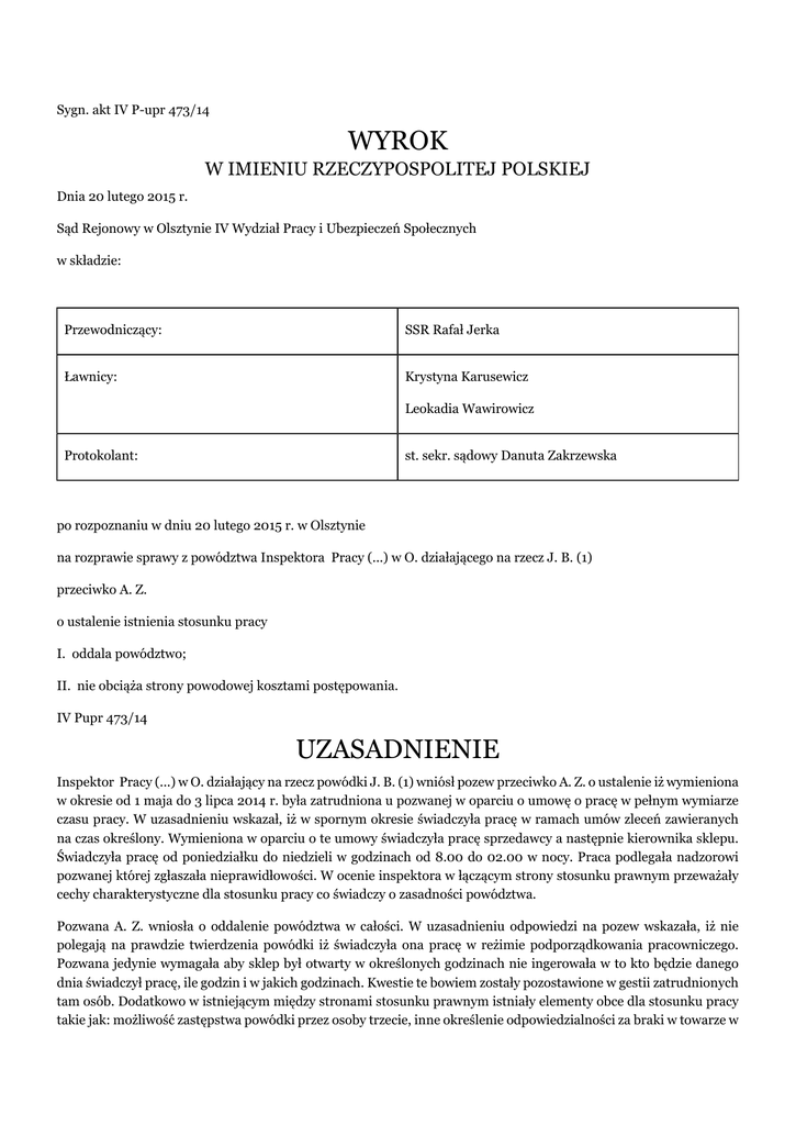 Sygn. akt IV P-upr 473/14 WYROK W IMIENIU RZECZYPOSPOLITEJ POLSKIEJ Dnia 20 lutego 2015 r. Sąd Rejonowy w Olsztynie IV Wydział Pracy i Ubezpieczeń Społecznych w składzie: Przewodniczący: SSR Rafał Jerka Ławnicy: Krystyna Karusewicz Leokadia Wawirowicz Protokolant: st. sekr. sądowy Danuta Zakrzewska po rozpoznaniu w dniu 20 lutego 2015 r. w Olsztynie na rozprawie sprawy z powództwa Inspektora Pracy (...) w O. działającego na rzecz J. B. (1) przeciwko A. Z. o ustalenie istnienia stosunku pracy I. oddala powództwo; II. nie obciąża strony powodowej kosztami postępowania. IV Pupr 473/14 UZASADNIENIE Inspektor Pracy (...) w O. działający na rzecz powódki J. B. (1) wniósł pozew przeciwko A. Z. o ustalenie iż wymieniona w okresie od 1 maja do 3 lipca 2014 r. była zatrudniona u pozwanej w oparciu o umowę o pracę w pełnym wymiarze czasu pracy. W uzasadnieniu wskazał, iż w spornym okresie świadczyła pracę w ramach umów zleceń zawieranych na czas określony. Wymieniona w oparciu o te umowy świadczyła pracę sprzedawcy a następnie kierownika sklepu. Świadczyła pracę od poniedziałku do niedzieli w godzinach od 8.00 do 02.00 w nocy. Praca podlegała nadzorowi pozwanej której zgłaszała nieprawidłowości. W ocenie inspektora w łączącym strony stosunku prawnym przeważały cechy charakterystyczne dla stosunku pracy co świadczy o zasadności powództwa. Pozwana A. Z. wniosła o oddalenie powództwa w całości. W uzasadnieniu odpowiedzi na pozew wskazała, iż nie polegają na prawdzie twierdzenia powódki iż świadczyła ona pracę w reżimie podporządkowania pracowniczego. Pozwana jedynie wymagała aby sklep był otwarty w określonych godzinach nie ingerowała w to kto będzie danego dnia świadczył pracę, ile godzin i w jakich godzinach. Kwestie te bowiem zostały pozostawione w gestii zatrudnionych tam osób. Dodatkowo w istniejącym między stronami stosunku prawnym istniały elementy obce dla stosunku pracy takie jak: możliwość zastępstwa powódki przez osoby trzecie, inne określenie odpowiedzialności za braki w towarze w stosunku do reżimu pracowniczego, inna forma wypłaty wynagrodzenia ( nieregularne zaliczki pobierane z utargu ). Nadto niebagatelne znaczenie ma wola stron, która została wyrażona przez strony w zawartej umowie zlecenia. Sąd ustalił następujący stan faktyczny: Powódka A. Z. zawarła z pozwaną A. Z. kolejne umowy zlecenia opiewające na okresy miesięczne od dnia 1 maja 2014 r. do dnia 3 lipca 2014 r. w ramach których wymieniona zobowiązała się do wykonania czynności polegających na usługach w postaci: rozkładania – układania towarów w sklepach, obsługi kasy fiskalnej oraz wykonywania innych zleconych prac. W tychże umowach zawarto zapis, iż powierzenie wykonywania objętych zleceniem czynności wymaga zgody zleceniodawcy. Aneksem z dnia 16 maja 2014 r. zmodyfikowano to uregulowanie w tym zakresie w miejsce zgody na powierzenie czynności osoby trzeciej wprowadzono wymóg notyfikacji zleceniodawcy tego faktu. Zleceniobiorca ( powódka ) zgodnie z dalszymi regulacjami tego aneksu odpowiadała za wykonanie prac przez te przybrane osoby a ponosiła pełną odpowiedzialność za sprawy „ organizacyjno – kadrowe związane z ich zatrudnieniem. Powódka w ramach świadczonej pracy prowadziła sklep (...) „przy ul (...). Sklep był czynny codziennie od poniedziałku do niedzieli od 8.00 do 2.00. Dni pracy ( jako sprzedawcy ), godziny pracy i jej długość były ustalane samodzielnie pomiędzy zatrudnionymi w tym sklepie pracownikami. Generalnie osoba która chciała więcej zarobić świadczyła pracę dłużej i częściej. Powódka oprócz pracy sprzedawcy pełniła też funkcje zarządzającego sklepikiem w związku z tym miał stawkę godzinowa o 1 zł wyższą niż szeregowy sprzedawca tj. 7 zł za dzień i 9 zł w nocy. Za zarządzanie sklepu wymieniona dostawała miesięczny dodatek 400 zł związany z dodatkowymi obowiązkami ( czynności fakturowania, rozliczenia gotówki itp. .) Powódka i inni pracownicy byli obciążani brakami w towarach, które były składowane „ za ladą „ . Braki były stwierdzane remanentami, które były przeprowadzane co 3 lub 4 tygodnie. Wynagrodzenie było rozliczanie dopiero po przeprowadzonym remanencie z którego potrącano stwierdzone manko. Pracownicy pobierali wynagrodzenia niejednokrotnie w formie zaliczkowej za zgodą pozwanej. Powódka co miesiąc wystawiała do podpisanej umowy zlecenia rachunki. ( Dowód: zeznania powódki k. 63, 67v, pozwanej k. 64,68, J. G. k. 64v , T . G. k. 66 , M. R. k. 66v – 67 , dokumenty k. 4-4v, 8-10, 19-32, 50-60v. ) Sąd zważył, co następuje: Należy podkreślić, iż stan faktyczny Sąd ustalił w oparciu o zeznania powódki ( k. 63, 67v ) pozwanej ( k. 64,68 ) J. G. ( k. 64v ), T . G. ( k. 66 ) M R. ( k. 66v – 67 ) oraz dokumentów zebranych w aktach sprawy. Strony i świadkowie byli zgodni co do przebiegu i charakteru pracy powódki, a ich zeznania znalazły potwierdzenie w zebranym materiale dowodowym. W tej sytuacji ocenie Sąd podlegała kwestia czy ustalony stan faktyczny dawał podstawy do podzielenia twierdzeń strony powodowej iż strony łączył stosunek pracy. W pierwszej kolejności należy podkreślić, iż cecha najistotniejszą stosunku pracy jest tzw. podporządkowanie pracownicze. Jest to jego cecha konstytutywna, konstrukcyjna ( por. wyrok SN z dnia Sądu Najwyższego z dnia 25 listopada 2005 r. I UK 68/05 Wokanda 2006/4/26 ) w tym znaczeniu iż jej brak stanowi przesłankę negatywną do ustalenia stosunku pracy. Dla stwierdzenia, że podporządkowanie pracownika pracodawcy występuje w treści stosunku prawnego z reguły wskazuje się na takie elementy jak: określony czas pracy i miejsce wykonywania czynności, podpisywanie listy obecności, podporządkowanie pracownika regulaminowi pracy oraz poleceniom kierownictwa co do miejsca, czasu i sposobu wykonywania pracy oraz obowiązek przestrzeg