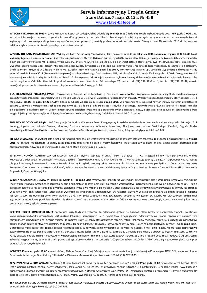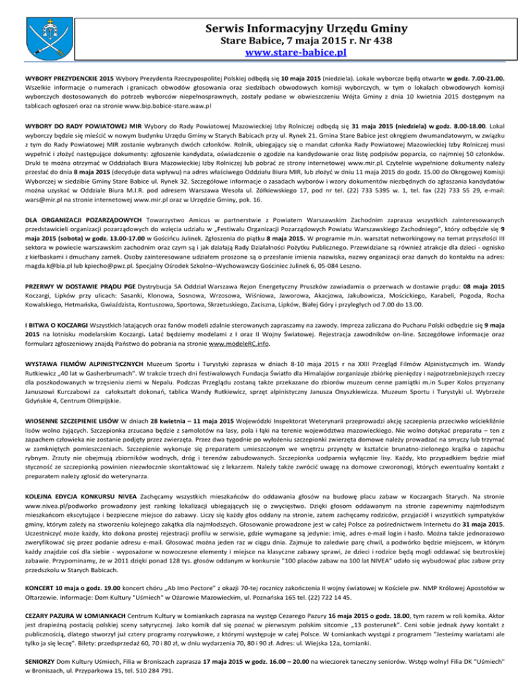 Serwis Informacyjny Urzędu Gminy Stare Babice, 7 maja 2015 r. Nr 438 www.stare-babice.pl WYBORY PREZYDENCKIE 2015 Wybory Prezydenta Rzeczypospolitej Polskiej odbędą się 10 maja 2015 (niedziela). Lokale wyborcze będą otwarte w godz. 7.00-21.00. Wszelkie informacje o numerach i granicach obwodów głosowania oraz siedzibach obwodowych komisji wyborczych, w tym o lokalach obwodowych komisji wyborczych dostosowanych do potrzeb wyborców niepełnosprawnych, zostały podane w obwieszczeniu Wójta Gminy z dnia 10 kwietnia 2015 dostępnym na tablicach ogłoszeń oraz na stronie www.bip.babice-stare.waw.pl WYBORY DO RADY POWIATOWEJ MIR Wybory do Rady Powiatowej Mazowieckiej Izby Rolniczej odbędą się 31 maja 2015 (niedziela) w godz. 8.00-18.00. Lokal wyborczy będzie się mieścić w nowym budynku Urzędu Gminy w Starych Babicach przy ul. Rynek 21. Gmina Stare Babice jest okręgiem dwumandatowym, w związku z tym do Rady Powiatowej MIR zostanie wybranych dwóch członków. Rolnik, ubiegający się o mandat członka Rady Powiatowej Mazowieckiej Izby Rolniczej musi wypełnić i złożyć następujące dokumenty: zgłoszenie kandydata, oświadczenie o zgodzie na kandydowanie oraz listę podpisów poparcia, co najmniej 50 członków. Druki te można otrzymać w Oddziałach Biura Mazowieckiej Izby Rolniczej lub pobrać ze strony internetowej www.mir.pl. Czytelnie wypełnione dokumenty należy przesłać do dnia 8 maja 2015 (decyduje data wpływu) na adres właściwego Oddziału Biura MIR, lub złożyć w dniu 11 maja 2015 do godz. 15.00 do Okręgowej Komisji Wyborczej w siedzibie Gminy Stare Babice ul. Rynek 32. Szczegółowe informacje o zasadach wyborów i wzory dokumentów niezbędnych do zgłaszania kandydatów można uzyskać w Oddziale Biura M.I.R. pod adresem Warszawa Wesoła ul. Zółkiewskiego 17, pod nr tel. (22) 733 5395 w. 1, tel. fax (22) 733 55 29, e-mail: [email protected] na stronie internetowej www.mir.pl oraz w Urzędzie Gminy, pok. 16. DLA ORGANIZACJI POZARZĄDOWYCH Towarzystwo Amicus w partnerstwie z Powiatem Warszawskim Zachodnim zaprasza wszystkich zainteresowanych przedstawicieli organizacji pozarządowych do wzięcia udziału w „Festiwalu Organizacji Pozarządowych Powiatu Warszawskiego Zachodniego”, który odbędzie się 9 maja 2015 (sobota) w godz. 13.00-17.00 w Gościńcu Julinek. Zgłoszenia do piątku 8 maja 2015. W programie m.in. warsztat networkingowy na temat przyszłości III sektora w powiecie warszawskim zachodnim oraz czym są i jak działają Rady Działalności Pożytku Publicznego. Przewidziane są również atrakcje dla dzieci - ognisko z kiełbaskami i dmuchany zamek. Osoby zainteresowane udziałem proszone są o przesłanie imienia nazwiska, nazwy organizacji oraz danych do kontaktu na adres: [email protected] lub [email protected]. Specjalny Ośrodek Szkolno–Wychowawczy Gościniec Julinek 6, 05-084 Leszno. PRZERWY W DOSTAWIE PRĄDU PGE Dystrybucja SA Oddział Warszawa Rejon Energetyczny Pruszków zawiadamia o przerwach w dostawie prądu: 08 maja 2015 Koczargi, Lipków przy ulicach: Sasanki, Klonowa, Sosnowa, Wrzosowa, Wiśniowa, Jaworowa, Akacjowa, Jakubowicza, Mościckiego, Karabeli, Pogoda, Rocha Kowalskiego, Hetmańska, Gwiaździsta, Kontuszowa, Sportowa, Skrzetuskiego, Zaciszna, Lipków, Białej Góry i przyległych od 7.00 do 13.00. I BITWA O KOCZARGI Wszystkich latających oraz fanów modeli zdalnie sterowanych zapraszamy na zawody. Impreza zaliczana do Pucharu Polski odbędzie się 9 maja 2015 na lotnisku modelarskim Koczargi. Latać będziemy modelami z I oraz II Wojny Światowej. Rejestracja zawodników on-line. Szczegółowe informacje oraz formularz zgłoszeniowy znajdą Państwo do pobrania na stronie www.modeleRC.info. WYSTAWA FILMÓW ALPINISTYCZNYCH Muzeum Sportu i Turystyki zaprasza w dniach 8-10 maja 2015 r na XXII Przegląd Filmów Alpinistycznych im. Wandy Rutkiewicz „40 lat w Gasherbrumach”. W trakcie trzech dni festiwalowych Fundacja Światło dla Himalajów zorganizuje zbiórkę pieniędzy i najpotrzebniejszych rzeczy dla poszkodowanych w trzęsieniu ziemi w Nepalu. Podczas Przeglądu zostaną także przekazane do zbiorów muzeum cenne pamiątki m.in Super Kolos przyznany Januszowi Kurczabowi za całokształt dokonań, tablica Wandy Rutkiewicz, sprzęt alpinistyczny Janusza Onyszkiewicza. Muzeum Sportu i Turystyki ul. Wybrzeże Gdyńskie 4, Centrum Olimpijskie. WIOSENNE SZCZEPIENIE LISÓW W dniach 28 kwietnia – 11 maja 2015 Wojewódzki Inspektorat Weterynarii przeprowadzi akcję szczepienia przeciwko wściekliźnie lisów wolno żyjących. Szczepionka zrzucana będzie z samolotów na lasy, pola i łąki na terenie województwa mazowieckiego. Nie wolno dotykać preparatu – ten z zapachem człowieka nie zostanie podjęty przez zwierzęta. Przez dwa tygodnie po wyłożeniu szczepionki zwierzęta domowe należy prowadzać na smyczy lub trzymać w zamkniętych pomieszczeniach. Szczepienie wykonuje się preparatem umieszczonym we wnętrzu przynęty w kształcie brunatno-zielonego krążka o zapachu rybnym. Zrzuty nie obejmują zbiorników wodnych, dróg i terenów zabudowanych. Szczepionka uodparnia wyłącznie lisy. Każdy, kto przypadkiem będzie miał styczność ze szczepionką powinien niezwłocznie skontaktować się z lekarzem. Należy także zwrócić uwagę na domowe czworonogi, których ewentualny kontakt z preparatem należy zgłosić do weterynarza. KOLEJNA EDYCJA KONKURSU NIVEA Zachęcamy wszystkich mieszkańców do oddawania głosów na budowę placu zabaw w Koczargach Starych. Na stronie www.nivea.pl/podworko prowadzony jest ranking lokalizacji ubiegających się o zwycięstwo. Dzięki głosom oddawanym na stronie zapewnimy najmłodszym mieszkańcom ekscytujące i bezpieczne miejsce do zabawy. Liczy się każdy głos oddany na stronie, zatem zachęcamy rodziców, przyjaciół i wszystkich sympatyków gminy, którym zależy na stworzeniu kolejnego zakątka dla najmłodszych. Głosowanie prowadzone jest w ca
