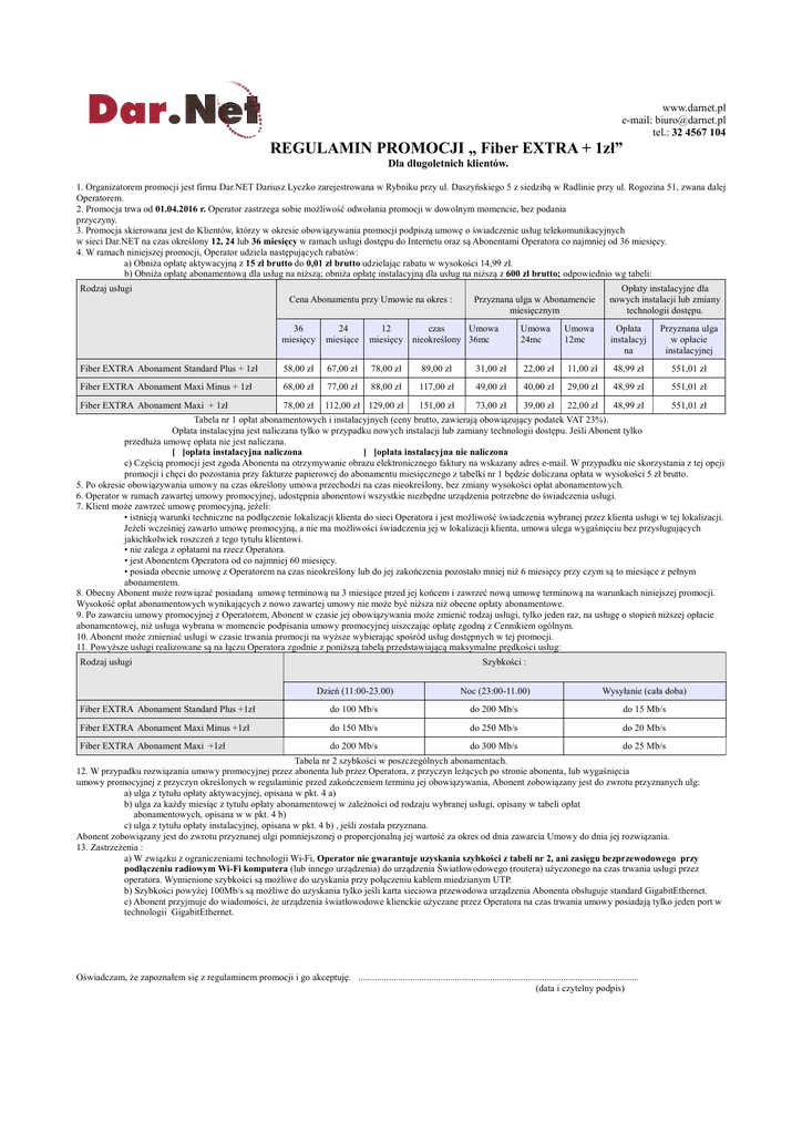 www.darnet.pl e-mail: [email protected] tel.: 32 4567 104 REGULAMIN PROMOCJI „ Fiber EXTRA + 1zł” Dla długoletnich klientów. 1. Organizatorem promocji jest firma Dar.NET Dariusz Lyczko zarejestrowana w Rybniku przy ul. Daszyńskiego 5 z siedzibą w Radlinie przy ul. Rogozina 51, zwana dalej Operatorem. 2. Promocja trwa od 01.04.2016 r. Operator zastrzega sobie możliwość odwołania promocji w dowolnym momencie, bez podania przyczyny. 3. Promocja skierowana jest do Klientów, którzy w okresie obowiązywania promocji podpiszą umowę o świadczenie usług telekomunikacyjnych w sieci Dar.NET na czas określony 12, 24 lub 36 miesięcy w ramach usługi dostępu do Internetu oraz są Abonentami Operatora co najmniej od 36 miesięcy. 4. W ramach niniejszej promocji, Operator udziela następujących rabatów: a) Obniża opłatę aktywacyjną z 15 zł brutto do 0,01 zł brutto udzielając rabatu w wysokości 14,99 zł. b) Obniża opłatę abonamentową dla usług na niższą; obniża opłatę instalacyjną dla usług na niższą z 600 zł brutto; odpowiednio wg tabeli: Rodzaj usługi Cena Abonamentu przy Umowie na okres : Przyznana ulga w Abonamencie miesięcznym czas Umowa nieokreślony 36mc Umowa 24mc Umowa 12mc Opłaty instalacyjne dla nowych instalacji lub zmiany technologii dostępu. 36 miesięcy 24 miesiące 12 miesięcy Opłata instalacyj na Przyznana ulga w opłacie instalacyjnej Fiber EXTRA Abonament Standard Plus + 1zł 58,00 zł 67,00 zł 78,00 zł 89,00 zł 31,00 zł 22,00 zł 11,00 zł 48,99 zł 551,01 zł Fiber EXTRA Abonament Maxi Minus + 1zł 68,00 zł 77,00 zł 88,00 zł 117,00 zł 49,00 zł 40,00 zł 29,00 zł 48,99 zł 551,01 zł Fiber EXTRA Abonament Maxi + 1zł 78,00 zł 112,00 zł 129,00 zł 151,00 zł 73,00 zł 39,00 zł 22,00 zł 48,99 zł 551,01 zł Tabela nr 1 opłat abonamentowych i instalacyjnych (ceny brutto, zawierają obowiązujący podatek VAT 23%). Opłata instalacyjna jest naliczana tylko w przypadku nowych instalacji lub zamiany technologii dostępu. Jeśli Abonent tylko przedłuża umowę opłata nie jest naliczana. [ ]opłata instalacyjna naliczona [ ]opłata instalacyjna nie naliczona c) Częścią promocji jest zgoda Abonenta na otrzymywanie obrazu elektronicznego faktury na wskazany adres e-mail. W przypadku nie skorzystania z tej opcji promocji i chęci do pozostania przy fakturze papierowej do abonamentu miesięcznego z tabelki nr 1 będzie doliczana opłata w wysokości 5 zł brutto. 5. Po okresie obowiązywania umowy na czas określony umowa przechodzi na czas nieokreślony, bez zmiany wysokości opłat abonamentowych. 6. Operator w ramach zawartej umowy promocyjnej, udostępnia abonentowi wszystkie niezbędne urządzenia potrzebne do świadczenia usługi. 7. Klient może zawrzeć umowę promocyjną, jeżeli: • istnieją warunki techniczne na podłączenie lokalizacji klienta do sieci Operatora i jest możliwość świadczenia wybranej przez klienta usługi w tej lokalizacji. Jeżeli wcześniej zawarto umowę promocyjną, a nie ma możliwości świadczenia jej w lokalizacji klienta, umowa ulega wygaśnięciu bez przysługujących jakichkolwiek roszczeń z tego tytułu klientowi. • nie zalega z opłatami na rzecz Operatora. • jest Abonentem Operatora od co najmniej 60 miesięcy. • posiada obecnie umowę z Operatorem na czas nieokreślony lub do jej zakończenia pozostało mniej niż 6 miesięcy przy czym są to miesiące z pełnym abonamentem. 8. Obecny Abonent może rozwiązać posiadaną umowę terminową na 3 miesiące przed jej końcem i zawrzeć nową umowę terminową na warunkach niniejszej promocji. Wysokość opłat abonamentowych wynikających z nowo zawartej umowy nie może być niższa niż obecne opłaty abonamentowe. 9. Po zawarciu umowy promocyjnej z Operatorem, Abonent w czasie jej obowiązywania może zmienić rodzaj usługi, tylko jeden raz, na usługę o stopień niższej opłacie abonamentowej, niż usługa wybrana w momencie podpisania umowy promocyjnej uiszczając opłatę zgodną z Cennikiem ogólnym. 10. Abonent może zmieniać usługi w czasie trwania promocji na wyższe wybierając spośród usług dostępnych w tej promocji. 11. Powyższe usługi realizowane są na łączu Operatora zgodnie z poniższą tabelą przedstawiającą maksymalne prędkości usług: Rodzaj usługi Szybkości : Dzień (11:00-23.00) Noc (23:00-11.00) Wysyłanie (cała doba) Fiber EXTRA Abonament Standard Plus +1zł do 100 Mb/s do 200 Mb/s do 15 Mb/s Fiber EXTRA Abonament Maxi Minus +1zł do 150 Mb/s do 250 Mb/s do 20 Mb/s Fiber EXTRA Abonament Maxi +1zł do 200 Mb/s do 300 Mb/s do 25 Mb/s Tabela nr 2 szybkości w poszczególnych abonamentach. 12. W przypadku rozwiązania umowy promocyjnej przez abonenta lub przez Operatora, z przyczyn leżących po stronie abonenta, lub wygaśnięcia umowy promocyjnej z przyczyn określonych w regulaminie przed zakończeniem terminu jej obowiązywania, Abonent zobowiązany jest do zwrotu przyznanych ulg: a) ulga z tytułu opłaty aktywacyjnej, opisana w pkt. 4 a) b) ulga za każdy miesiąc z tytułu opłaty abonamentowej w zależności od rodzaju wybranej usługi, opisany w tabeli opłat abonamentowych, opisana w w pkt. 4 b) c) ulga z tytułu opłaty instalacyjnej, opisana w pkt. 4 b) , jeśli została przyznana. Abonent zobowiązany jest do zwrotu przyznanej ulgi pomniejszonej o proporcjonalną jej wartość za okres od dnia zawarcia Umowy do dnia jej rozwiązania. 13. Zastrzeżenia : a) W związku z ograniczeniami technologii Wi-Fi, Operator nie gwarantuje uzyskania szybkości z tabeli nr 2, ani zasięgu bezprzewodowego przy podłączeniu radiowym Wi-Fi komputera (lub innego urządzenia) do urządzenia Światłowodowego (routera) użyczonego na czas trwania usługi przez operatora. Wymienione szybkości są możliwe do uzyskania przy połączeniu kablem miedzianym UTP. b) Szybkości powyżej 100Mb/s są możliwe do uzyskania tylko jeśli karta sieciowa przewodowa urządzenia Abonenta obsługuje stand