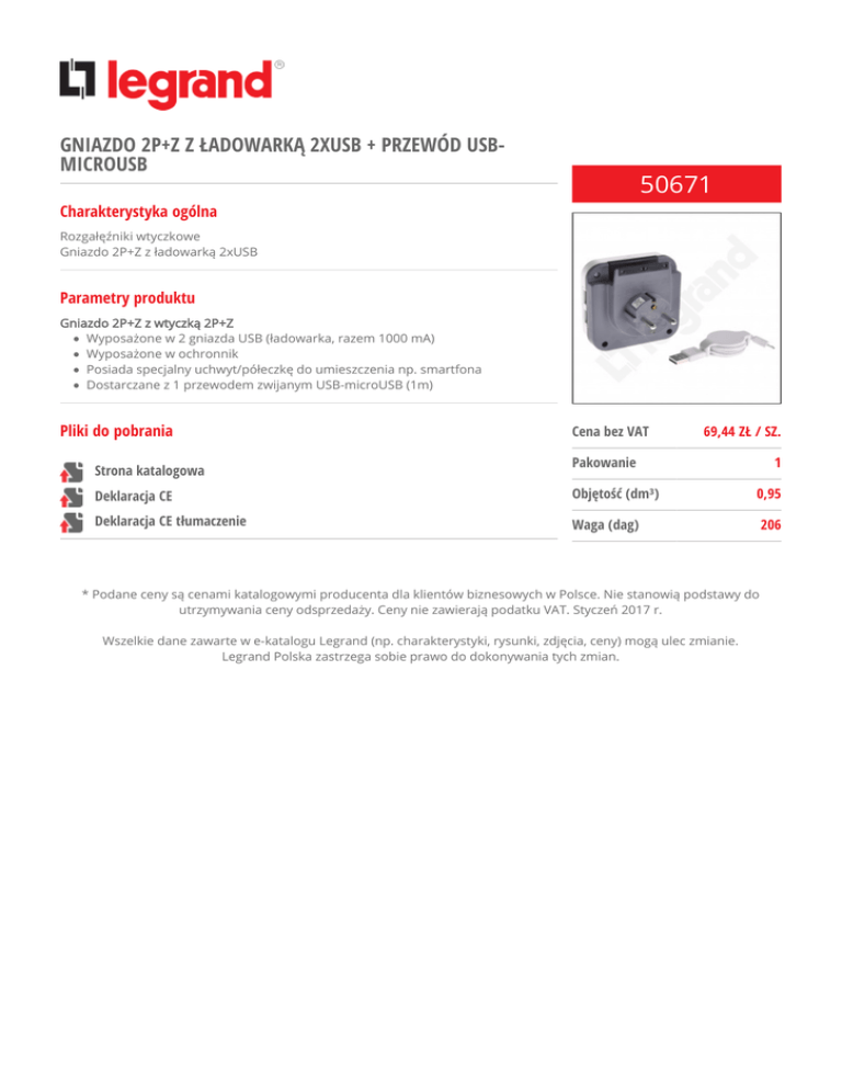 GNIAZDO 2P+Z Z ŁADOWARKĄ 2XUSB + PRZEWÓD USBMICROUSB 50671 Charakterystyka ogólna Rozgałęźniki wtyczkowe Gniazdo 2P+Z z ładowarką 2xUSB Parametry produktu Gniazdo 2P+Z z wtyczką 2P+Z Wyposażone w 2 gniazda USB (ładowarka, razem 1000 mA) Wyposażone w ochronnik Posiada specjalny uchwyt/półeczkę do umieszczenia np. smartfona Dostarczane z 1 przewodem zwijanym USB-microUSB (1m) Pliki do pobrania Strona katalogowa Cena bez VAT 69,44 ZŁ / SZ. 1 Pakowanie Deklaracja CE Objętość (dm³) 0,95 Deklaracja CE tłumaczenie Waga (dag) 206 * Podane ceny są cenami katalogowymi producenta dla klientów biznesowych w Polsce. Nie stanowią podstawy do utrzymywania ceny odsprzedaży. Ceny nie zawierają podatku VAT. Styczeń 2017 r. Wszelkie dane zawarte w e-katalogu Legrand (np. charakterystyki, rysunki, zdjęcia, ceny) mogą ulec zmianie. Legrand Polska zastrzega sobie prawo do dokonywania tych zmian.