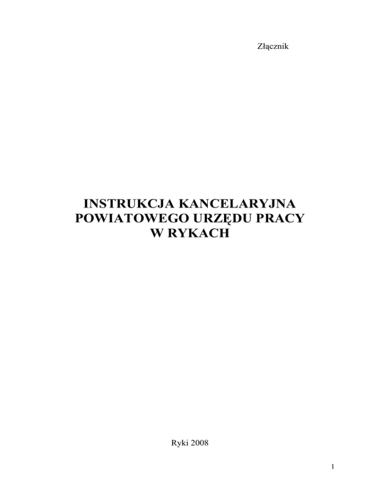 Złącznik INSTRUKCJA KANCELARYJNA POWIATOWEGO URZĘDU PRACY W RYKACH Ryki 2008 1 SPIS TREŚCI W Rykach ......................................................................................................................... 1 Rozdział 1 .................................................................................................................................. 3 POSTANOWIENIA WSTĘPNE I OGÓLNE ....................................................................... 3 1.Przedmiot i cel .................................................................................................................... 3 2.Znaczenie pojęć użytych w instrukcji ................................................................................. 3 Rozdział 2 .................................................................................................................................. 5 SYSTEM KANCELARYJNY ................................................................................................. 5 1.System kancelaryjny. Rzeczowy wykaz akt. Podział dokumentacji na kategorie archiwalne. ............................................................................................................................. 5 2.Podział prac kancelaryjnych w Urzędzie. ........................................................................... 7 Rozdział 3 .................................................................................................................................. 8 SZCZEGÓŁOWE USTALENIA DOTYCZĄCE WYKONYWANIA WAŻNIEJSZYCH CZYNNOŚCI KANCELARYJNYCH ................................................................................... 8 1.Przyjmowanie przesyłek. .................................................................................................... 8 2.Otwieranie i sprawdzanie przesyłek. ................................................................................... 9 3.Rozdzielenie i przydzielenie pism..................................................................................... 11 4.Rejestrowanie i znakowanie spraw. .................................................................................. 11 5.Załatwianie spraw. ............................................................................................................ 13 6.Terminy załatwiania spraw i ponaglenia. .......................................................................... 14 7.Popisywanie pism. ............................................................................................................. 15 8.Wysyłanie pism. ................................................................................................................ 15 9.Zakładanie teczek aktowych. Przechowywanie akt. ......................................................... 16 10.Przekazywanie akt do składnicy akt. ............................................................................... 17 11.Postępowanie z aktami poufnymi. .................................................................................. 18 Rozdział 4 ................................................................................................................................ 19 POSTANOWIENIA KONCOWE ........................................................................................ 19 1.Postępowanie z dokumentacją w przypadku reorganizacji lub likwidacji komórki organizacyjnej. ..................................................................................................................... 19 2.Kontrola prac kancelaryjnych. .......................................................................................... 19 2 Rozdział 1 POSTANOWIENIA WSTĘPNE I OGÓLNE 1. Przedmiot i cel 1.1. Instrukcja kancelaryjna, zwana dalej „instrukcją”, ustala zasady postępowania w zakresie: obiegu dokumentów, ich powstawania, przesyłania, ewidencjonowania, przechowywania w komórkach organizacyjnych oraz przekazywania do składnicy akt w urzędzie pracy. 1.2. Ustalone w instrukcji zasady postępowania dążą do zapewnienia jednolitego sposobu tworzenia, ewidencjonowania i przechowywania oraz ochrony przed utratą, uszkodzeniem bądź zniszczeniem akt w urzędzie pracy. 1.3. Postępowanie z aktami zawierającymi tajemnicę państwową regulują odrębne przepisy. 2. Znaczenie pojęć użytych w instrukcji 1) akta sprawy – cała dokumentacja dotycząca danej sprawy (obejmująca: dokumenty, pisma, notatki, formularze, plany, rysunki, fotokopie, kserokopie, itp.), zawierająca dane i informacje niezbędne (które były, są i mogą być istotne) przy jej rozpatrywaniu, 2) aprobata – wyrażenie zgody na treść i sposób załatwienia sprawy, 3) dekretacja – skierowanie sprawy do referenta sprawy w celu jej realizacji, 4) dokument – akt mający znaczenie dowodu, ustanawiający uprawnienia lub stwierdzający prawdziwość określonych w nim zdarzeń bądź danych , 5) dokumentacja niearchiwalna – część dokumentacji nie stanowiąca materiałów archiwalnych ( określana jako kat. „B”), 6) dyrektor – Dyrektor Powiatowego Urzędu Pracy lub jego Zastępcy, 7) starosta – Starosta Powiatu, 8) komórka organizacyjna – dział, referat, samodzielne stanowisko pracy, 3 9) kontrolka wpływu, kontrolka wysyłanej korespondencji – pomoce kancelaryjne (księgi kancelaryjne, dzienniki korespondencyjne, książki ewidencyjne), służące do ewidencjonowania wpływów i wysyłanej korespondencji w celu kontroli ich obiegu, 10) korespondencja – każde pismo wpływające do Urzędu lub wysyłane przez Urząd, 11) parafa – skrócony podpis osoby wyrażającej zgodę na treść i sposób załatwienia sprawy, 12) pomocnicze urządzenie ewidencyjne – np. terminarz, 13) przesyłka – każdy oddzielnie zabezpieczony list, paczka, także w formie elektronicznej, 14) punkt zatrzymania – każde stanowisko pracy przez które przechodzą akta sprawy w trakcie wykonywania czynności związanych z jej załatwieniem, 15) referent spra