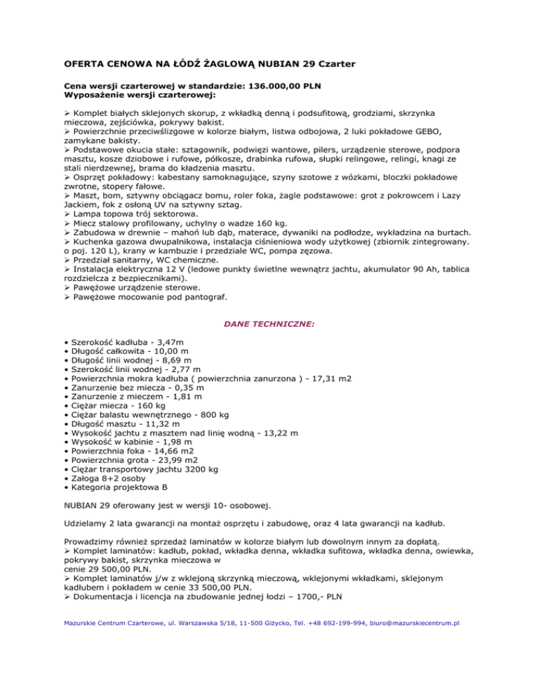 OFERTA CENOWA NA ŁÓDŹ ŻAGLOWĄ NUBIAN 29 Czarter
