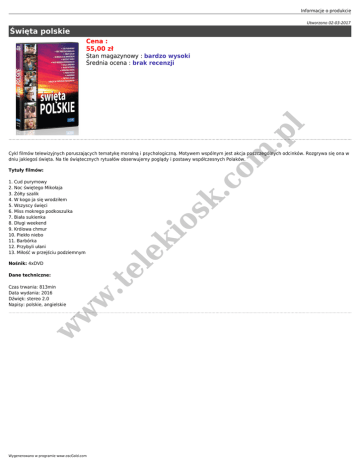 Informacje o produkcie Utworzono 02-03-2017 Święta polskie Cena : 55,00 zł m .p l Stan magazynowy : bardzo wysoki Średnia ocena : brak recenzji Cykl filmów telewizyjnych poruszających tematykę moralną i psychologiczną. Motywem wspólnym jest akcja poszczególnych odcinków. Rozgrywa się ona w dniu jakiegoś święta. Na tle świątecznych rytuałów obserwujemy poglądy i postawy współczesnych Polaków. .c o Tytuły filmów: w io w w Dane techniczne: Czas trwania: 813min Data wydania: 2016 Dźwięk: stereo 2.0 Napisy: polskie, angielskie ek .t el Nośnik: 4xDVD sk 1. Cud purymowy 2. Noc świętego Mikołaja 3. Żółty szalik 4. W kogo ja się wrodziłem 5. Wszyscy święci 6. Miss mokrego podkoszulka 7. Biała sukienka 8. Długi weekend 9. Królowa chmur 10. Piekło niebo 11. Barbórka 12. Przybyli ułani 13. Miłość w przejściu podziemnym Wygenerowano w programie www.oscGold.com