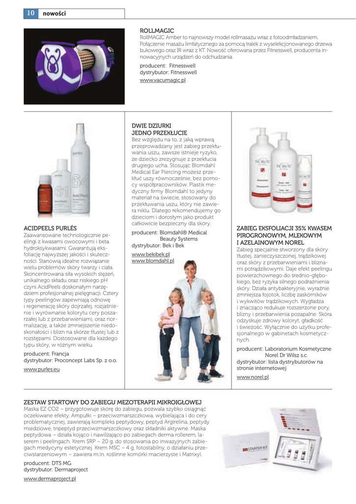 10 nowosci ROLLMAGIC RollMAGIC Amber to najnowszy model rollmasażu wraz z fotoodmładzaniem. Połączenie masażu limfatycznego za pomocą tralek z wyselekcjonowanego drzewa bukowego oraz IR wraz z KT. Nowość oferowana przez Fitnesswell, producenta innowacyjnych urządzeń do odchudzania. producent: Fitnesswell dystrybutor: Fitnesswell www.vacumagic.pl DWIE DZIURKI JEDNO PRZEKŁUCIE ACIDPEELS PURLÉS Zaawansowane technologicznie peelingi z kwasami owocowymi i beta hydroksykwasami. Gwarantują eksfoliację najwyższej jakości i skuteczności. Stanowią idealne rozwiązanie wielu problemów skóry twarzy i ciała. Skoncentrowana siła wysokich stężeń, unikalnego składu oraz niskiego pH czyni AcidPeels doskonałym narzędziem profesjonalnej pielęgnacji. Cztery typy peelingów zapewniają odnowę i regenerację skóry dojrzałej, rozjaśnienie i wyrównanie kolorytu cery poszarzałej lub z przebarwieniami, oraz normalizację, a także zmniejszenie niedoskonałości i blizn na skórze tłustej lub z rozstępami. Dostosowane dla każdego typu skóry, w różnym wieku. Bez względu na to, z jaką wprawą przeprowadzany jest zabieg przekłuwania uszu, zawsze istnieje ryzyko, że dziecko zrezygnuje z przekłucia drugiego ucha. Stosując Blomdahl Medical Ear Piercing możesz przekłuć uszy równocześnie, bez pomocy współpracowników. Plastik medyczny firmy Blomdahl to jedyny materiał na świecie, stosowany do przekłuwania uszu, który nie zawiera niklu. Dlatego rekomendujemy go dzieciom i dorosłym jako produkt całkowicie bezpieczny dla skóry. producent: Blomdahl® Medical Beauty Systems dystrybutor: Bek i Bek www.bekibek.pl www.blomdahl.pl producent: Francja dystrybutor: Proconcept Labs Sp. z o.o. www.purles.eu ZABIEG EKSFOLIACJI 35% KWASEM PIROGRONOWYM, MLEKOWYM I AZELAINOWYM NOREL Zabieg specjalnie stworzony dla skóry tłustej, zanieczyszczonej, trądzikowej oraz skóry z przebarwieniami i bliznami potrądzikowymi. Daje efekt peelingu powierzchownego do średnio-głębokiego, bez ryzyka silnego podrażnienia skóry. Działa antybakteryjnie, wyraźnie zmniejsza łojotok, liczbę zaskórników i wykwitów trądzikowych. Wygładza i znacząco redukuje rozszerzone pory, blizny i przebarwienia pozapalne. Skóra odzyskuje zdrowy koloryt, gładkość i świeżość. Wyłącznie do użytku profesjonalnego w gabinetach kosmetycznych. producent: Laboratorium Kosmetyczne Norel Dr Wilsz s.c. dystrybutor: lista dystrybutorów na stronie internetowej www.norel.pl ZESTAW STARTOWY DO ZABIEGU MEZOTERAPII MIKROIGŁOWEJ Maska EZ CO2 – przygotowuje skórę do zabiegu, pozwala szybko osiągnąć oczekiwane efekty. Ampułki – przeciwzmarszczkowa, wybielająca i do cery problematycznej, zawierają kompleks peptydowy, peptyd Argirelina, peptydy miedziowe, tripeptyd przeciwzmarszczkowy oraz składniki aktywne. Maska peptydowa – działa kojąco i nawilżająco po zabiegach derma rollerem, laserem i peelingach. Krem SRP – 20 g, do stosowania po inwazyjnych zabiegach medycyny estetycznej. Krem MSC – 4 g, fotostabilny, o działaniu przeciwstarzeniowym – zawiera m.in. roślinne komórki macierzyste i Matrixyl. producent: DTS MG dystrybutor: Dermaproject www.dermaproject.pl