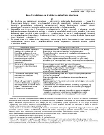 Załącznik do Zarządzenia nr 5 Rektora PK z dnia 7 lutego 2012 r. Zasady wydatkowania środków na działalność statutową §1 Ze środków na działalność statutową – utrzymanie potencjału badawczego – mogą być finansowane jedynie koszty przedsięwzięć mających bezpośredni związek z realizowanym tematem, warunkujące wykonanie zatwierdzonych zadań badawczych objętych planem zadaniowo-finansowym jednostki, zgłoszone we wniosku o dofinansowanie. Wszystkie merytoryczne i finansowe przedsięwzięcia, w tym: wniosek o otwarcie tematu, kalkulacja wstępna i wynikowa, wnioski o udzielenie zamówień publicznych, wszelkie dokumenty księgowe oraz protokół zdawczo-odbiorczy, podejmowane w ramach realizowanych tematów, wymagają akceptacji właściwego dziekana wydziału, który jest dysponentem środków finansowych (bezpośrednich i pośrednich). Za prawidłowy opis dokumentu księgowego, wskazujący źródło finansowania oraz zawierający uzasadnienie zakupu wraz z przeznaczeniem kosztu, odpowiada kierownik tematu, zgodnie z poniższą tabelą. 1. 2. 3. Lp. 1. 2. 1 PRZEZNACZENIE Działania niezbędne do rozwoju specjalności naukowych lub kierunków badawczych oraz rozwoju kadry naukowej, w tym badania naukowe lub prace rozwojowe ujęte w planie finansowym jednostek naukowych. Utrzymanie infrastruktury 3 badawczej , w tym bibliotek i archiwów. 3. Zatrudnienie niezbędnej kadry naukowej i inżynieryjnotechnicznej. 4. Zakup lub wytworzenie aparatury naukowo-badawczej, związanej z realizacją zadań, o których mowa w pkt 1, niestanowiącej dużej infrastruktury badawczej. KOSZTY BEZPOŚREDNIE 1) literatura naukowa krajowa i zagraniczna, e-booki, normy, 2) szkolenia dotyczące obsługi sprzętu badawczego, 3) opłaty licencyjne, abonamenty za użytkowanie programów komputerowych, 1 4) usługi obce (świadczone przez podmioty zewnętrzne) , 2 5) krajowe i zagraniczne podróże służbowe (w tym: opłaty konferencyjne, koszty podróży, diety i inne związane z wyjazdem). 1) import czasopism (100% wszystkich kosztów), 2) łączność komputerowa (30% wszystkich kosztów), 3) materiały eksploatacyjne i laboratoryjne, odczynniki oraz inne materiały niezbędne do realizacji tematu, 4 4) amortyzacja środków trwałych . 1) wynagrodzenia osobowe wraz z pochodnymi (maksymalnie 5 30% wynagrodzenia) , 2) wynagrodzenia z bezosobowego funduszu płac wraz z 6 pochodnymi . 1) zakup aparatury naukowo-badawczej, warunkującej wykonanie zadań objętych planem, 2) doposażenie, części zamienne do aparatury znajdującej się w jednostce, wykorzystywanej do zadań badawczych objętych planem, 3) zakup komputerów wraz z niezbędnym oprogramowaniem i sprzętem peryferyjnym, jeśli stanowią część stanowiska badawczego służącego do realizacji zadań badawczych wyłącznie po uzyskaniu zgody właściwego dziekana w przypadku prac pomocniczych, które ze względu na specyfikę nie mogą być wykonane przez pracowników zatrudnionych w jednostce w ramach ich zakresu obowiązków, np. tłumaczenie tekstów w językach obcych, wykonanie specjalistycznych prac koniecznych dla zrealizowania zadania badawczego, w tym koszty wynikające z odpłatnego korzystania z aparatury naukowo-badawczej i innych urządzeń służących do wykonywania badań w zakresie niezbędnym i przez okres niezbędny do realizacji tematu. 2 koszty związane z udziałem w konferencjach naukowo-badawczych krajowych i zagranicznych mogą być finansowane pod warunkiem czynnego udziału – przedstawienia referatu lub posteru związanego z zakresem realizowanych badań statutowych. Publikacje winny mieć umieszczoną wzmiankę: Prezentowane wyniki badań, zrealizowane w ramach tematu nr ……………………., zostały sfinansowane z dotacji na naukę przyznanej przez Ministerstwo Nauki i Szkolnictwa Wyższego. 3 nie obejmuje napraw i konserwacji aparatury oraz remontów. 4 w zakresie niezbędnym i przez okres niezbędny do realizacji tematu. 5 100% wynagrodzenia osobowego jedynie w przypadku pracowników zatrudnionych wyłącznie do realizacji danego tematu. 6 wyłącznie po uzyskaniu zgody właściwego dziekana w przypadku prac pomocniczych wykonywanych przez pracowników inżynieryjno-technicznych, rozliczanych na podstawie umowy cywilnoprawnej. 5. 6. Współpraca naukowa krajowa i zagraniczna, niezbędna do 7 realizacji zadań , o których mowa w pkt 1. Upowszechnianie nauki. przedstawionych we wniosku o dofinansowanie. 1) finansowanie wymiany osobowej: podróże i krótkie pobyty naukowców polskich za granicą oraz podróże i krótkie pobyty naukowców zagranicznych w Polsce. 1) spotkania robocze i konsultacje naukowe, 8 2) dofinansowanie organizacji konferencji , 3) wydanie publikacji naukowych/konferencyjnych, w tym tłumaczenia, korekty językowe i recenzje, 4) uczestnictwo w targach promujących wyniki badań, 5) zgłoszenie patentowe wyników badań uzyskanych w ramach realizowanego tematu. Przyjmuje się wskaźnik kosztów pośrednich w wysokości 30% sumy wszystkich kosztów bezpośrednich pomniejszonych o koszt zakupu aparatury (poz. 4 tabeli). W raporcie z wykorzystania środków przeznaczonych na utrzymanie potencjału badawczego koszty pośrednie należy uwzględnić w poz. 2 – utrzymanie infrastruktury badawczej. §2 Z kosztów bezpośrednich dotacji na utrzymanie potencjału badawczego nie można finansować: 1) zakupów inwestycyjnych i środków trwałych, które nie mają statusu aparatury naukowobadawczej, w tym typowego biurowego wyposażenia jednostek (meble, kserokopiarki, sprzęt audiowizualny i inne wyposażenie biurowe itp.), 2) zakupu aparatury naukowo-badawczej, jeżeli nie jest to uzasadnione wykonaniem zadań objętych planem, 3) remontów bieżących maszyn, urządzeń i pomieszczeń, 4) kosztów dostawy energii elektrycznej i innych mediów, 5) kosztów najmu lub czynszu, kosztów utrzymania czystości i dozoru pomieszczeń i urządzeń, 6) kosztów budowy lokalnych sieci i
