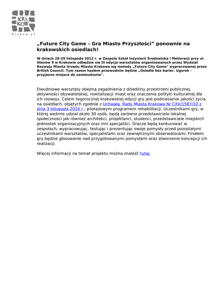 „Future City Game – Gra Miasto Przyszłości” ponownie na krakowskich osiedlach! W dniach 28-29 listopada 2012 r. w Zespole Szkół Inżynierii Środowiska i Melioracji przy ul. Ułanów 9 w Krakowie odbędzie się III edycja warsztatów organizowanych przez Wydział Rozwoju Miasta Urzędu Miasta Krakowa wg metody „Future City Game" wypracowanej przez British Council. Tym razem hasłem przewodnim będzie „Osiedle bez barier. Ugorek przyjazne miejsce do zamieszkania". Dwudniowe warsztaty obejmą zagadnienia z dziedziny przestrzeni publicznej, aktywności obywatelskiej, rewitalizacji miast oraz znaczenia polityki kulturalnej dla ich rozwoju. Celem tegorocznej krakowskiej edycji gry jest podniesienie jakości życia na osiedlach, objętych zgodnie z Uchwałą Rady Miasta Krakowa Nr CXV/1587/10 z dnia 3 listopada 2010 r., pilotażowym programem rehabilitacji. Uczestnikami gry, w której weźmie udział około 30 osób, będą zarówno przedstawiciele lokalnej społeczności jak również architekci, projektanci, studenci, przedstawiciele miejskich jednostek organizacyjnych oraz inni specjaliści. Gracze będą konkurować w zespołach, wypracowując, testując i prezentując swoje pomysły przed pozostałymi uczestnikami warsztatów, specjalistami oraz zewnętrznymi obserwatorami. Finałem gry będzie głosowanie nad przygotowanymi pomysłami oraz stworzenie koncepcji ich realizacji. Więcej informacji na temat projektu można znaleźć tutaj. Powered by TCPDF (www.tcpdf.org)