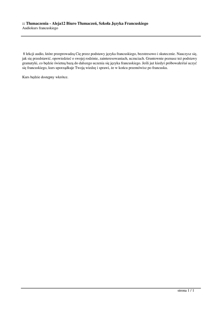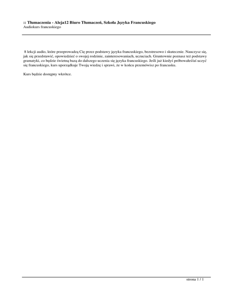 :: Tłumaczenia - Aleja12 Biuro Tłumaczeń, Szkoła Języka Francuskiego Audiokurs francuskiego 8 lekcji audio, które przeprowadzą Cię przez podstawy języka francuskiego, bezstresowo i skutecznie. Nauczysz się, jak się przedstawić, opowiedzieć o swojej rodzinie, zainteresowaniach, uczuciach. Gruntownie poznasz też podstawy gramatyki, co będzie świetną bazą do dalszego uczenia się języka francuskiego. Jeśli już kiedyś próbowałeś/aś uczyć się francuskiego, kurs uporządkuje Twoją wiedzę i sprawi, że w końcu przemówisz po francusku. Kurs będzie dostępny wkrótce. strona 1 / 1