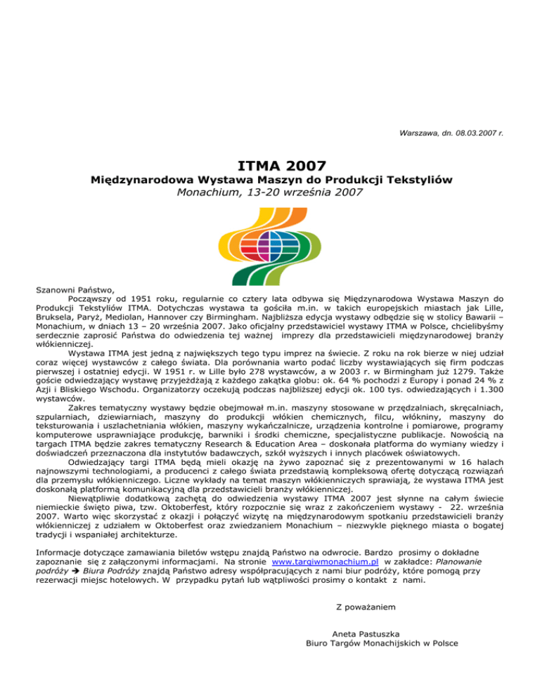 Warszawa, dn. 08.03.2007 r. ITMA 2007 Międzynarodowa Wystawa Maszyn do Produkcji Tekstyliów Monachium, 13-20 września 2007 Szanowni Państwo, Począwszy od 1951 roku, regularnie co cztery lata odbywa się Międzynarodowa Wystawa Maszyn do Produkcji Tekstyliów ITMA. Dotychczas wystawa ta gościła m.in. w takich europejskich miastach jak Lille, Bruksela, Paryż, Mediolan, Hannover czy Birmingham. Najbliższa edycja wystawy odbędzie się w stolicy Bawarii – Monachium, w dniach 13 – 20 września 2007. Jako oficjalny przedstawiciel wystawy ITMA w Polsce, chcielibyśmy serdecznie zaprosić Państwa do odwiedzenia tej ważnej imprezy dla przedstawicieli międzynarodowej branży włókienniczej. Wystawa ITMA jest jedną z największych tego typu imprez na świecie. Z roku na rok bierze w niej udział coraz więcej wystawców z całego świata. Dla porównania warto podać liczby wystawiających się firm podczas pierwszej i ostatniej edycji. W 1951 r. w Lille było 278 wystawców, a w 2003 r. w Birmingham już 1279. Także goście odwiedzający wystawę przyjeżdżają z każdego zakątka globu: ok. 64 % pochodzi z Europy i ponad 24 % z Azji i Bliskiego Wschodu. Organizatorzy oczekują podczas najbliższej edycji ok. 100 tys. odwiedzających i 1.300 wystawców. Zakres tematyczny wystawy będzie obejmował m.in. maszyny stosowane w przędzalniach, skręcalniach, szpularniach, dziewiarniach, maszyny do produkcji włókien chemicznych, filcu, włókniny, maszyny do teksturowania i uszlachetniania włókien, maszyny wykańczalnicze, urządzenia kontrolne i pomiarowe, programy komputerowe usprawniające produkcję, barwniki i środki chemiczne, specjalistyczne publikacje. Nowością na targach ITMA będzie zakres tematyczny Research & Education Area – doskonała platforma do wymiany wiedzy i doświadczeń przeznaczona dla instytutów badawczych, szkół wyższych i innych placówek oświatowych. Odwiedzający targi ITMA będą mieli okazję na żywo zapoznać się z prezentowanymi w 16 halach najnowszymi technologiami, a producenci z całego świata przedstawią kompleksową ofertę dotyczącą rozwiązań dla przemysłu włókienniczego. Liczne wykłady na temat maszyn włókienniczych sprawiają, że wystawa ITMA jest doskonałą platformą komunikacyjną dla przedstawicieli branży włókienniczej. Niewątpliwie dodatkową zachętą do odwiedzenia wystawy ITMA 2007 jest słynne na całym świecie niemieckie święto piwa, tzw. Oktoberfest, który rozpocznie się wraz z zakończeniem wystawy - 22. września 2007. Warto więc skorzystać z okazji i połączyć wizytę na międzynarodowym spotkaniu przedstawicieli branży włókienniczej z udziałem w Oktoberfest oraz zwiedzaniem Monachium – niezwykle pięknego miasta o bogatej tradycji i wspaniałej architekturze. Informacje dotyczące zamawiania biletów wstępu znajdą Państwo na odwrocie. Bardzo prosimy o dokładne zapoznanie się z załączonymi informacjami. Na stronie www.targiwmonachium.pl w zakładce: Planowanie podróży Î Biura Podróży znajdą Państwo adresy współpracujących z nami biur podróży, które pomogą przy rezerwacji miejsc hotelowych. W przypadku pytań lub wątpliwości prosimy o kontakt z nami. Z poważaniem Aneta Pastuszka Biuro Targów Monachijskich w Polsce Międzynarodowa Wystawa Maszyn do Produkcji Tekstyliów ITMA 2007 INFORMACJE DOTYCZĄCE OBOWIĄZKOWEJ REJESTRACJI ODWIEDZAJĄCYCH WYSTAWĘ ITMA 2007,ZAMAWIANIA BILETÓW WSTĘPU W PRZEDSPRZEDAŻY ORAZ REJESTRACJI ZAPROSZEŃ NA TARGI (Gast-Ticket) Ze względu na obowiązek rejestracji odwiedzających wystawę ITMA 2007 online, bilety w przedsprzedaży w atrakcyjnych cenach będzie można zamówić wyłącznie drogą elektroniczną na stronie: www.itma.com (zakładka: Visitors/ Besucher i dalej: Prices & registration/ Preise & Registrierung). Dotyczy to również rejestracji zaproszeń na targi i wystawy (Gast-Ticket)! Korzyści wynikające z wcześniejszej rejestracji: • • • • Ceny biletów zamówionych w przedsprzedaży są niższe od biletów zakupionych bezpośrednio w trakcie targów Rejestrując się wcześniej online, oszczędzają Państwo czas i unikają kolejek do rejestracji w czasie trwania targów Wszyscy, którzy zamówią bilety wstępu w przedsprzedaży, otrzymają mailem specjalny voucher w pliku PDF, umożliwiający odbiór biletu wstępu na miejscu w Monachium bez konieczności ponownej rejestracji Voucher ten uprawnia do bezpłatnego korzystania z komunikacji miejskiej w Monachium w drodze na targi. Ceny biletów wstępu na wystawę ITMA 2007 * CENY W PRZEDSPRZEDAŻY DO 12.04.2007 BILET 1 -DNIOWY BILET NA CAŁE TARGI KATALOG 38 EUR 68 EUR - 49 EUR 89 EUR - 69 EUR 98 EUR - (PRZY REJESTRACJI ONLINE) CENY W PRZEDSPRZEDAŻY OD 13.04.2007 DO 20.09.2007 (PRZY REJESTRACJI ONLINE) CENY BILETÓW NA TARGACH (REJESTRACJA NA MIEJSCU) * Za zamówione w przedsprzedaży bilety wstępu Biuro Targów Monachijskich wystawia fakturę proforma w PLN, według średniego kursu NBP obowiązującego w dniu jej wystawienia. Tak wygląda procedura zamawiania i odbioru biletów: • • • • • • • Rejestrują się Państwo na stronie targów www.itma.com odpowiadając na kilka pytań i składają Państwo zamówienie na bilety wstępu Złożone przez Państwa drogą elektroniczną zamówienie automatycznie trafia do Biura Targów Monachijskich w Polsce, które jest odpowiedzialne za jego realizację Biuro wystawia Państwu fakturę proforma i przesyła ją mailem Państwo dokonują płatności i przesyłają potwierdzenie jej faksem do Biura na numer: 022/ 624 94 78 Po otrzymaniu potwierdzenia przelewu Biuro wysyła do Państwa e-mailem elektroniczne vouchery na bilet (plik PDF), które prosimy wydrukować i koniecznie zabrać ze sobą na targi Przy wejściu na targi w specjalnych okienkach zamieniacie Państwo vouchery na fizyczne bilety wstępu Biuro wystawia fakturę VAT za zakupione bilety Więcej informacji na temat procedury rejestracy