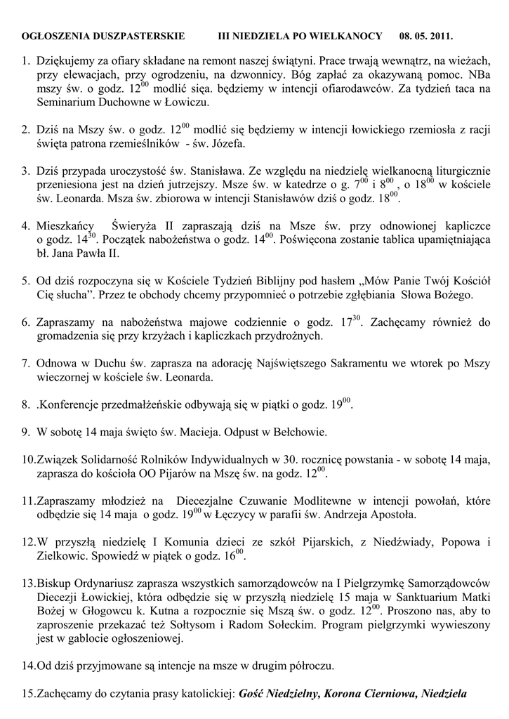 OGŁOSZENIA DUSZPASTERSKIE III NIEDZIELA PO WIELKANOCY 08. 05. 2011. 1. Dziękujemy za ofiary składane na remont naszej świątyni. Prace trwają wewnątrz, na wieżach, przy elewacjach, przy ogrodzeniu, na dzwonnicy. Bóg zapłać za okazywaną pomoc. NBa mszy św. o godz. 1200 modlić sięa. będziemy w intencji ofiarodawców. Za tydzień taca na Seminarium Duchowne w Łowiczu. 2. Dziś na Mszy św. o godz. 1200 modlić się będziemy w intencji łowickiego rzemiosła z racji święta patrona rzemieślników - św. Józefa. 3. Dziś przypada uroczystość św. Stanisława. Ze względu na niedzielę wielkanocną liturgicznie przeniesiona jest na dzień jutrzejszy. Msze św. w katedrze o g. 700 i 800 , o 1800 w kościele św. Leonarda. Msza św. zbiorowa w intencji Stanisławów dziś o godz. 1800. 4. Mieszkańcy Świeryża II zapraszają dziś na Msze św. przy odnowionej kapliczce o godz. 1430. Początek nabożeństwa o godz. 1400. Poświęcona zostanie tablica upamiętniająca bł. Jana Pawła II. 5. Od dziś rozpoczyna się w Kościele Tydzień Biblijny pod hasłem „Mów Panie Twój Kościół Cię słucha”. Przez te obchody chcemy przypomnieć o potrzebie zgłębiania Słowa Bożego. 6. Zapraszamy na nabożeństwa majowe codziennie o godz. 1730. Zachęcamy również do gromadzenia się przy krzyżach i kapliczkach przydrożnych. 7. Odnowa w Duchu św. zaprasza na adorację Najświętszego Sakramentu we wtorek po Mszy wieczornej w kościele św. Leonarda. 8. .Konferencje przedmałżeńskie odbywają się w piątki o godz. 1900. 9. W sobotę 14 maja święto św. Macieja. Odpust w Bełchowie. 10.Związek Solidarność Rolników Indywidualnych w 30. rocznicę powstania - w sobotę 14 maja, zaprasza do kościoła OO Pijarów na Mszę św. na godz. 1200. 11.Zapraszamy młodzież na Diecezjalne Czuwanie Modlitewne w intencji powołań, które odbędzie się 14 maja o godz. 1900 w Łęczycy w parafii św. Andrzeja Apostoła. 12.W przyszłą niedzielę I Komunia dzieci ze szkół Pijarskich, z Niedźwiady, Popowa i Zielkowic. Spowiedź w piątek o godz. 1600. 13.Biskup Ordynariusz zaprasza wszystkich samorządowców na I Pielgrzymkę Samorządowców Diecezji Łowickiej, która odbędzie się w przyszłą niedzielę 15 maja w Sanktuarium Matki Bożej w Głogowcu k. Kutna a rozpocznie się Mszą św. o godz. 1200. Proszono nas, aby to zaproszenie przekazać też Sołtysom i Radom Sołeckim. Program pielgrzymki wywieszony jest w gablocie ogłoszeniowej. 14.Od dziś przyjmowane są intencje na msze w drugim półroczu. 15.Zachęcamy do czytania prasy katolickiej: Gość Niedzielny, Korona Cierniowa, Niedziela