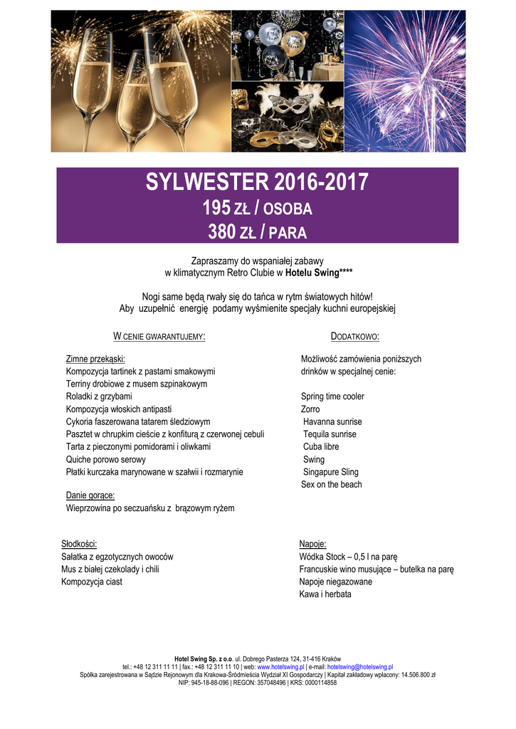 SYLWESTER 2016-2017 195 ZŁ / OSOBA 380 ZŁ / PARA Zapraszamy do wspaniałej zabawy w klimatycznym Retro Clubie w Hotelu Swing**** Nogi same będą rwały się do tańca w rytm światowych hitów! Aby uzupełnić energię podamy wyśmienite specjały kuchni europejskiej W CENIE GWARANTUJEMY: Zimne przekąski: Kompozycja tartinek z pastami smakowymi Terriny drobiowe z musem szpinakowym Roladki z grzybami Kompozycja włoskich antipasti Cykoria faszerowana tatarem śledziowym Pasztet w chrupkim cieście z konfiturą z czerwonej cebuli Tarta z pieczonymi pomidorami i oliwkami Quiche porowo serowy Płatki kurczaka marynowane w szałwii i rozmarynie Danie gorące: Wieprzowina po seczuańsku z brązowym ryżem Słodkości: Sałatka z egzotycznych owoców Mus z białej czekolady i chili Kompozycja ciast DODATKOWO: Możliwość zamówienia poniższych drinków w specjalnej cenie: Spring time cooler Zorro Havanna sunrise Tequila sunrise Cuba libre Swing Singapure Sling Sex on the beach Napoje: Wódka Stock – 0,5 l na parę Francuskie wino musujące – butelka na parę Napoje niegazowane Kawa i herbata Hotel Swing Sp. z o.o. ul. Dobrego Pasterza 124, 31-416 Kraków tel.: +48 12 311 11 11 | fax.: +48 12 311 11 10 | web: www.hotelswing.pl | e-mail: [email protected] Spółka zarejestrowana w Sądzie Rejonowym dla Krakowa-Śródmieścia Wydział XI Gospodarczy | Kapitał zakładowy wpłacony: 14.506.800 zł NIP: 945-18-88-096 | REGON: 357048496 | KRS: 0000114858