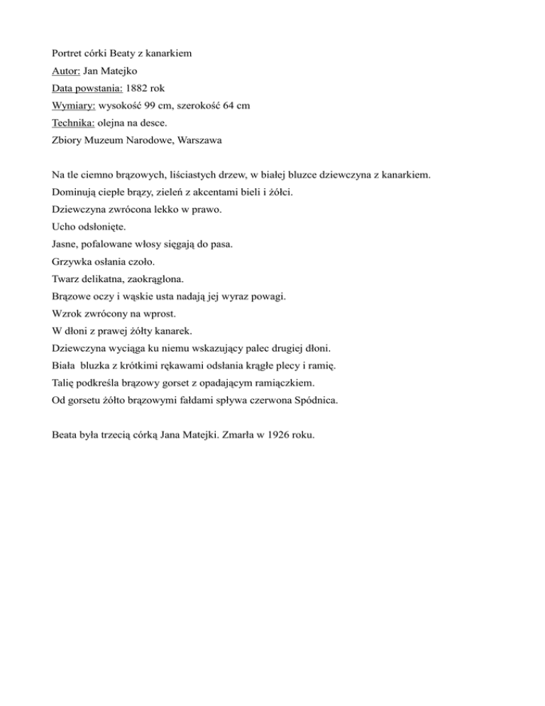 Portret córki Beaty z kanarkiem Autor: Jan Matejko Data powstania: 1882 rok Wymiary: wysokość 99 cm, szerokość 64 cm Technika: olejna na desce. Zbiory Muzeum Narodowe, Warszawa Na tle ciemno brązowych, liściastych drzew, w białej bluzce dziewczyna z kanarkiem. Dominują ciepłe brązy, zieleń z akcentami bieli i żółci. Dziewczyna zwrócona lekko w prawo. Ucho odsłonięte. Jasne, pofalowane włosy sięgają do pasa. Grzywka osłania czoło. Twarz delikatna, zaokrąglona. Brązowe oczy i wąskie usta nadają jej wyraz powagi. Wzrok zwrócony na wprost. W dłoni z prawej żółty kanarek. Dziewczyna wyciąga ku niemu wskazujący palec drugiej dłoni. Biała bluzka z krótkimi rękawami odsłania krągłe plecy i ramię. Talię podkreśla brązowy gorset z opadającym ramiączkiem. Od gorsetu żółto brązowymi fałdami spływa czerwona Spódnica. Beata była trzecią córką Jana Matejki. Zmarła w 1926 roku.