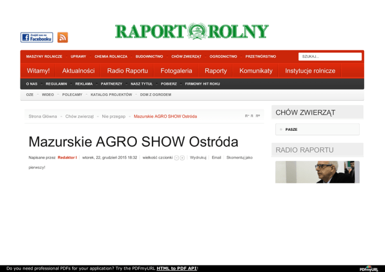 MASZYNY MASZYNY ROLNICZE ROLNICZE Witamy! O NAS OZE OZE UPRAWY UPRAWY Aktualności REGULAMIN WIDEO WIDEO Strona Główna CHEMIA CHEMIA ROLNICZA ROLNICZA REKLAMA POLECAMY POLECAMY BUDOWNICTWO BUDOWNICTWO Radio Raportu PARTNERZY NASZ TYTUŁ KATALOG KATALOG PROJEKTÓW PROJEKTÓW Chów zwierząt Nie przegap CHÓW CHÓW ZWIERZĄT ZWIERZĄT Fotogaleria POBIERZ OGRODNICTWO OGRODNICTWO Raporty PRZETWÓRSTWO PRZETWÓRSTWO Komunikaty SZUKAJ... Instytucje rolnicze FIRMOWY HIT ROKU DOM DOM Z Z OGRODEM OGRODEM CHÓW ZWIERZĄT Mazurskie AGRO SHOW Ostróda PASZE Mazurskie AGRO SHOW Ostróda Napisane przez Redaktor I wtorek, 22, grudzień 2015 18:32 wielkość czcionki Wydrukuj pierwszy! Do you need professional PDFs for your application? Try the PDFmyURL HTML to PDF API! Email Skomentuj jako RADIO RAPORTU Czy ziemniak jest rośliną przyszłości? O O doświadcze Tajfunie, odmianie wyhodowanej w Centrum Dora Pomorsko-Mazurskiej Hodowl... Modzurowie f NIE PRZEGAP UWAGA! Ten serwis używa cookies i podobnych technologii. Brak zmiany ustawienia przeglądarki oznacza zgodę na to. Czytaj więcej… Zrozumiałem Pomorskie Forum Nasienne Spotkanie Pomorski Ośrodek interesari Doradztwa Rolniczego w Gdańsku zaprasza Mazurskie AGRO SHOW Ostróda 2016 to pierwsza halowa wystawa rolnicza w północno-wschodniej Polsce i pierwsza tak kompleksowa wystawa rolnicza w województwie warmińsko-mazurskim. Zapraszamy do Ostródy w dniach: 13-14 lutego 2016 roku. na III POMORSKIE FORUM NASIENNE które odbędzie się 22 lutego... PROTEIN2FO III Pomorskie Forum Mleczarskie Doradztwa Jest to niepowtarzalna okazja, by bezpośrednio spotkać się z przedstawicielami firm z branży maszyn i urządzeń Rolniczego w rolniczych, zapoznać się, jeszcze przed sezonem, z najnowszą ofertą sprzętu rolniczego. Dla rolników to Pierwsza edycja wystawy okazała się niesamowitym sukcesem. Przez dwa dni ponad 100 wystawców gościło łącznie 18 394 zwiedzających. Wystawa okazała się doskonałym miejscem nie tylko do zapoznania się z ofertą maszyn, ale również do dokonania zakupów, tuż przed rozpoczęciem nowego sezonu, co uczyniło wielu rolników, którzy na wystawę przybyli. AGRO-PA Pomorski Ośrodek Mazurskie AGRO SHOW Ostróda 2016 powstała z myślą o wszystkich rolnikach Polski północno – wschodniej. również szansa, by skorzystać z porad i uzyskać informację na stoiskach instytucji i agend rządowych. konsorcjum i Gdańsku zaprasza na III Pomorskie Forum Mleczarskie pod rolników w Po patronatem honorowym Mieczysława Wschodniej... Struka... Eksport do Ameryki Południowej Ferma 20 Zaproszenie do udziału w misji W 2015 roku, kalendarz wystaw rolniczych wzbogacił się o kolejną profesjonalną imprezę branżową. Nowa wystawa - ARENA AGRO i odbyła się w Ostródzie w dniach od 14 do 15 lutego 2015 roku, w nowoczesnym obiekcie Centrum Targowo-Konferencyjn Warmii i Mazur Arena Ostróda. Do you need professional PDFs for your application? Try the PDFmyURL HTML to PDF API! wysokiego szczebla sąsiadującej. organizowanej przez KE w Kolumbii i Meksyku. Przy przygotowywaniu pierwszej edycji ARENY AGRO, korzystaliśmy ze swojej wieloletniej praktyki w realizacji tego typu wydarzeń. Jesteśmy bowiem doświadczonym organizatorem Międzynarodowych Wystaw Rolniczych AGRO SHOW, czyli największych w Europie plenerowych imprez o tematyce rolniczej, które co roku gromadzą rekordowe liczby wystawców i zwiedzających z kraju i zagranicy. Naszym zamierzeniem jest, aby odbywająca się w Ostródzie ARENA AGRO stała się najważniejszym wydarzeniem branżowym dedykowanym rolnikom z północno-wschodniej Polski. Podczas pierwszej edycji ARENA AGRO, w przede dniu kolejnego sezonu, została zaprezentowana najnowsza oferta czołowych marek z branży maszyn i urządzeń rolniczych. Na Wystawie obecni byli wszyscy czołowi dystrybutorzy z regionu, którzy prezentowali czołowe krajowe i zagraniczne marki maszyn i urządzeń. ARENA AGRO odbyła się w nowoczesnym kompleksie wystawienniczym Arena Ostróda, zlokalizowanym przy ul. Grunwaldzkiej 55 w Ostródzie. To jedno z najnowocześniejszych centrów targowych w tej części Europy i zarazem doskonałe miejsce prezentacji dla: producentów i dystrybutorów maszyn, firm nasiennych, przedsiębiorstw nawozowych, prasy branżowej, organizacji rolniczych oraz innych podmiotów i instytucji związanych z rolnictwem. Po sukcesie pierwszej edycji w 2016 roku wystawa odbędzie się po raz drugi, ale tym razem pod nazwą Mazurskie AGRO SHOW. Nazwa wystawy nawiązywać będzie do naszych dwóch pozostałych imprez: AGRO SHOW oraz Zielone AGRO SHOW. Ostatnio zmieniany czwartek, 28 styczeń 2016 13:08 Czytany 2123 razy Opublikowano w Etykiety targi Nie przegap pigmiur Like Sign Up to see what your friends like. Do you need professional PDFs for your application? Try the PDFmyURL HTML to PDF API! WAŻNE STRONY Redaktor I Najnowsze od Redaktor I Badania techniczne pojazdów - ponowny wniosek samorządu rolniczego Artykuły powiązane Mazurskie AGRO SHOW już wkrótce! Huczne otwarcie sezonu rolniczego na polskim Przemysław Urbaniak (Syngenta) Łukasz Bojkowski (Syngenta) Rozmowy ze związkowcami rynku! POLAGRA-PREMIERY - najlepszy grunt pod nowe kontakty W Zielonym Tygodniu Polska smakuje Dr Włodzimierz Kita Wkrótce Mazurskie Agro Show! Więcej w tej kategorii: « Konferencje zimowe Ferma 2016 » Skomentuj Upewnij się, że pola oznaczone wymagane gwiazdką (*) zostały wypełnione. Kod HTML nie jest dozwolony. Treść komentarza * wpisz swój komentarz tutaj... Do you need professional PDFs for your application? Try the PDFmyURL HTML to PDF API! Imię/Nazwa użytkownika * wpisz swoją nazwę... Email * wpisz swój adres e-mail... URL strony wpisz adres swojej strony... Wpisz dwa słowa widoczne poniżej Dodaj komentarz powrót na górę Social Security Sucks Born before 1969? You can get an extra $4,098 monthly with this Portal internetowy raportrolny.pl jest własnością Wydawnictwa