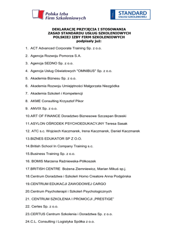 DEKLARACJĘ PRZYJĘCIA I STOSOWANIA ZASAD STANDARDU USŁUG SZKOLENIOWYCH POLSKIEJ IZBY FIRM SZKOLENIOWYCH podpisały już: 1. ACT Advanced Corporate Training Sp. z o.o. 2. Agencja Rozwoju Pomorza S.A. 3. Agencja SEDNO Sp. z o.o. 4. Agencja Usług Oświatowych "OMNIBUS" Sp. z o.o. 5. Akademia Biznesu Sp. z o.o. 6. Akademia Rozwoju Umiejętności Małgorzata Niezgódka 7. Akademia Szkoleń i Kompetencji 8. AKME Consulting Krzysztof Pikor 9. ANVIX Sp. z o.o. 10.ART OF FINANCE Doradztwo Biznesowe Szczepan Brzeski 11.ASYLON OŚRODEK PSYCHOEDUKACYJNY Teresa Sasak 12. ATC s.c. Wojciech Kaczmarek, Irena Kaczmarek, Daniel Kaczmarek 13.BIZNES EDUKATOR SP Z O.O. 14.British School In Company Training s.c. 15.Business Training Sp. z o.o. 16. BOMIS Marzena Raźniewska-Półkoszek 17.BRITISH CENTRE Bożena Ziemniewicz, Marian Mikuś sp.j. 18.Centrum Doradztwa i Szkoleń Homo Creatore Anna Podgórska 19.CENTRUM EDUKACJI ZAWODOWEJ CARGO 20.Centrum Psychoterapii i Szkoleń Psychologicznych 21. CENTRUM SZKOLENIA I PROMOCJI „PRESTIGE” 22. Certes Sp. z o.o. 23.CERTUS Centrum Szkolenia i Doradztwa Sp. z o.o. 24.C.L. Consulting i Logistyka Spółka z o.o. 25. CONART SP. Z O.O. 26. Doskam Sp. z o.o. 27. ECDDP Szkolenia Sp. z o.o. 28.Edustacja.pl Sp. z o.o. 29.„EGO” Centrum Edukacji i Doradztwa - Adam Sikora 30.ENGLISH UNLIMITED Sp. z o.o. 31. ETTA Doradztwo i Treningi dla Biznesu 32.EUREKA Sp. z o.o. 33.Europejski Instytut Edukacji Engram Sp. z o.o. 34.Europejskie Centrum Kształcenia „Eureka” Sp. z o.o. 35.EXBIS Eksperci Biznesmenom - Szopa i Szóstak Sp. J. 36. Firma Szkoleniowa TRAKT 37.Fundacja Nauki Języków Obcych „LINGUAE MUNDI” 38.Fundacja Promocji Edukacyjnej ORYLION 39.Fundacja Warszawski Instytut Bankowości 40.FUTURE CENTRE TRAINING CORPORATION Krawczyk i Lipczyński Sp. j. 41.GB Resources Polska Sp. z o.o. 42. GRUPA OSB s.c. 43.Grupa SET Sp. z o.o. 44. HUMAN PARTNER Sp. z o.o. 45.HUMANEO 46.IDES Consultants Polska Sp. z o.o. 47.INTEGRA CONSULTING Marek Małkowicz 48.INVENTI Consulting Marek Warejko 49.J.G. Training Jadwiga Gwóźdź 50. KONSTEKT HR Polska Sp. z o.o. 51. LP Products - Centrum Szkoleń i Kalibracji s.c. 52. Master Biznes Centrum Kształcenia Personalnego 53.MASTERS Centrum Szkolenia Biznesu A&A Polańska sp. j. 54.MDS Centrum Wsparcia Biznesowego Mirella Doluk - Świerczek 55.MindLab Sp. z o.o. 56. MODERATOR Sp. z o.o. 57.MPM Productivity Management Sp. z o.o. 58. MTD Marek Dziduszko 59. NEGOCJATOR Firma Konsultacyjno - Szkoleniowa 60.Nowe Motywacje Sp. z o.o. 61.Ośrodek Informacji Naukowej Oinpharma Sp. z o.o. 62.Ośrodek Kształcenia i Biznesu SOKRATES 63.Ośrodek Kształcenia Zawodowego „ELPRO” Sp. z o.o. 64.Ośrodek Kursów i Szkoleń przy ECEiT 65.Ośrodek Szkoleń i Informacji „EFFECT” Joanna Jarosz-Opolka 66. PAIZ Konsulting Sp. z o.o. 67. PHU "QT SYSTEM" inż. Kazimierz Adamaszek 68.PM Doradztwo Gospodarcze Sp. Z o.o. 69.POLKADR - Grupa Konsultingowa 70. Polska Izba Przemysłu Farmaceutycznego i Wyrobów Medycznych POLFARMED 71. PRO BUSINESS SOLUTIONS Adam Beniowski 72.PROFES Centrum Kształcenia i Doradztwa Ewa Karpińska-Bryke, Artur Olszewski, Mariusz Bryke Sp. jawna 73.Projekt Edukacja Sp. z o.o. 74. PROSPERO BUSINESS TRAINING S.C. Ewa Polańska, Prospero Business Training Sp. z o.o. 75.Prymus Sp. z o.o. 76.Przedsiębiorstwo Handlowo-Usługowe Apus Robert Meller 77.Regionalny Ośrodek Edukacji Andrzej Bratasz 78. RESPECT Sp. z o.o. 79.Stowarzyszenie Konsultantów i Trenerów Zarządzania MATRIK 80.Stowarzyszenie REFA Wielkopolska 81. Stowarzyszenie Rozwoju Kadr 82. SYNTEA S.A. 83. SYNTEZA [Szkolenia - Konsulting] Adam Pilarczyk 84.SZKOLENIA ŁÓDŹ Dagmara Szonert - Rzepecka 85.Szkoła Bankowa Stalowa Wola-Rzeszów Sp. z o.o. 86. TAXUS CENTRUM SZKOLEŃ 87. TECHPAL Sp. z o.o. 88.TOMORROW SP. z o.o. 89.Towarzystwo Oświatowo - Naukowe "Inter-Wiedza" Sp. z o.o. 90.TQM Training & Consulting Polska S.p z.o.o. 91.Training Team Doradztwo i Szkolenia Joanna Szczepńczyk 92.„WARSAW STUDY CENTRE Spółka z ograniczoną odpowiedzialnością” spółka komandytowa 93. WORLDWIDE SCHOOL SP. Z o.o. 94.Zachodniopomorskie Centrum Szkoleń i Wspierania Przedsiębiorczości Mirosław Szczeglik 95. Zakład Doskonalenia Zawodowego w Warszawie 96. ZESPÓŁ EKSPERTÓW MANAGER DEKLARACJA JEST WAŻNA DO 31.12.2012