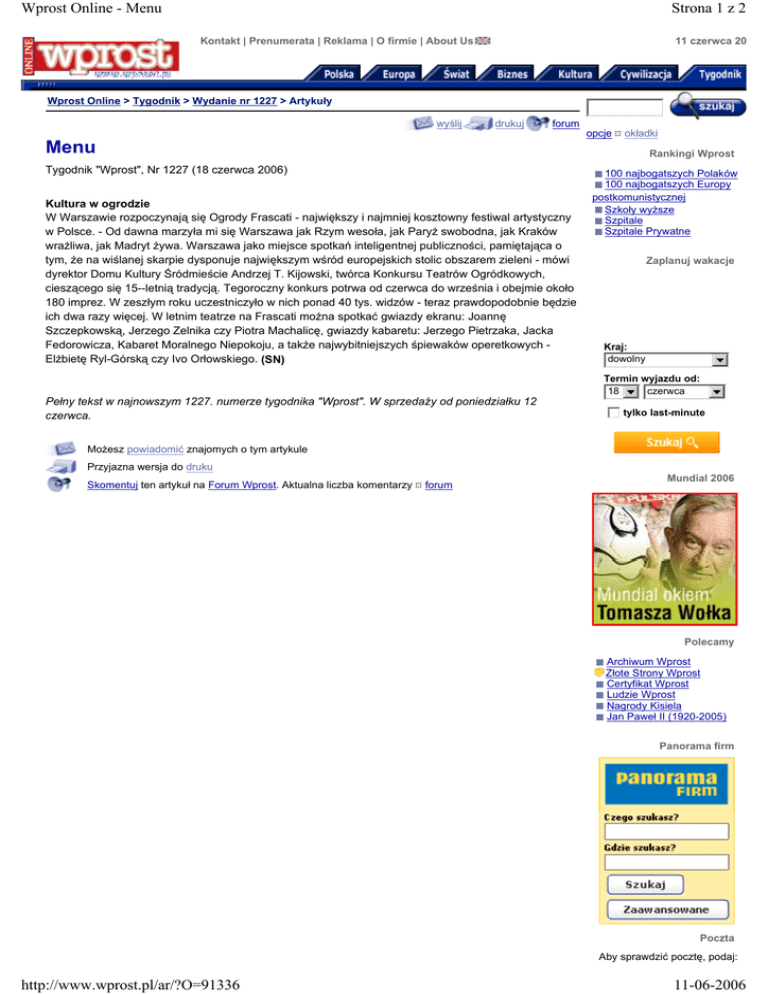 Wprost Online - Menu Strona 1 z 2 Kontakt | Prenumerata | Reklama | O firmie | About Us 11 czerwca 20 Wprost Online > Tygodnik > Wydanie nr 1227 > Artykuły wyślij drukuj forum Menu opcje okładki Rankingi Wprost Tygodnik "Wprost", Nr 1227 (18 czerwca 2006) Kultura w ogrodzie W Warszawie rozpoczynają się Ogrody Frascati - największy i najmniej kosztowny festiwal artystyczny w Polsce. - Od dawna marzyła mi się Warszawa jak Rzym wesoła, jak Paryż swobodna, jak Kraków wrażliwa, jak Madryt żywa. Warszawa jako miejsce spotkań inteligentnej publiczności, pamiętająca o tym, że na wiślanej skarpie dysponuje największym wśród europejskich stolic obszarem zieleni - mówi dyrektor Domu Kultury Śródmieście Andrzej T. Kijowski, twórca Konkursu Teatrów Ogródkowych, cieszącego się 15--letnią tradycją. Tegoroczny konkurs potrwa od czerwca do września i obejmie około 180 imprez. W zeszłym roku uczestniczyło w nich ponad 40 tys. widzów - teraz prawdopodobnie będzie ich dwa razy więcej. W letnim teatrze na Frascati można spotkać gwiazdy ekranu: Joannę Szczepkowską, Jerzego Zelnika czy Piotra Machalicę, gwiazdy kabaretu: Jerzego Pietrzaka, Jacka Fedorowicza, Kabaret Moralnego Niepokoju, a także najwybitniejszych śpiewaków operetkowych Elżbietę Ryl-Górską czy Ivo Orłowskiego. (SN) Pełny tekst w najnowszym 1227. numerze tygodnika "Wprost". W sprzedaży od poniedziałku 12 czerwca. 100 najbogatszych Polaków 100 najbogatszych Europy postkomunistycznej Szkoły wyższe Szpitale Szpitale Prywatne Zaplanuj wakacje Kraj: dowolny Termin wyjazdu od: 18 czerwca c tylko last-minute d e f g Możesz powiadomić znajomych o tym artykule Przyjazna wersja do druku Skomentuj ten artykuł na Forum Wprost. Aktualna liczba komentarzy forum Mundial 2006 Polecamy Archiwum Wprost Złote Strony Wprost Certyfikat Wprost Ludzie Wprost Nagrody Kisiela Jan Paweł II (1920-2005) Panorama firm Poczta Aby sprawdzić pocztę, podaj: http://www.wprost.pl/ar/?O=91336 11-06-2006 Wprost Online - Menu Strona 2 z 2 Login Hasło Nasze tytuły Newslettery Zaznacz Newslettery Wprost które chcesz otrzymywać: b Zapowiedzi tygodnika c d e f g g Z ostatniej chwili b c d e f więcej nt subskrypcji Zobacz także Pocztówka Solidarności Wyniki wyborów prezydenckich Ankieta wyborcza Wprost Prezydent czytelników Wprost Wiadomości z Wprost Wybory prezydenckie © AWR Wprost 1998 - 2006 Wprost Online Archiwum Forum Poczta Cafe Kariera Ludzie Prenumerata Reklama Newslettery Wiadomości z Wprost Kontakt Komunikaty prasowe Psy.pl Koty.pl Uwagi odnośnie działania serwisu prosimy wysyłać za pomocą formularza http://www.wprost.pl/ar/?O=91336 11-06-2006