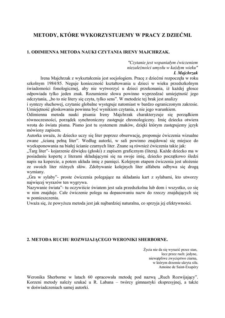 METODY, KTÓRE WYKORZYSTUJEMY W PRACY Z DZIEĆMI. 1. ODIMIENNA METODA NAUKI CZYTANIA IRENY MAJCHRZAK. "Czytanie jest wspaniałym ćwiczeniem niezależności umysłu w każdym wieku" I. Majchrzak Irena Majchrzak z wykształcenia jest socjologiem. Pracę z dziećmi rozpoczęła w roku szkolnym 1984/85. Neguje konieczność kształtowania u dzieci w wieku przedszkolnym świadomości fonologicznej, aby nie wytworzyć u dzieci przekonania, iż każdej głosce odpowiada tylko jeden znak. Rozumienie słowa powinno wyprzedzać umiejętność jego odczytania, „bo to nie litery się czyta, tylko sens”. W metodzie tej brak jest analizy i syntezy słuchowej, czytanie globalne występuje natomiast w bardzo ograniczonym zakresie. Umiejętność głoskowania powinna być wynikiem czytania, a nie jego warunkiem. Odimienna metoda nauki pisania Ireny Majchrzak charakteryzuje się porządkiem równoczesności, porządek synchroniczny zastępuje chronologiczny. Imię dziecka otwiera wrota do świata pisma. Pismo jest tu systemem znaków, dzięki którym zastępujemy język mówiony zapisem. Autorka uważa, że dziecko uczy się liter poprzez obserwację, proponuje ćwiczenia wizualne zwane „ścianą pełną liter”. Według autorki, w sali powinno znajdować się miejsce do wyeksponowania na białej ścianie czarnych liter. Znane są również ćwiczenia takie jak: „Targ liter”- kojarzenie dźwięku (głoski) z zapisem graficznym (literą). Każde dziecko ma w posiadaniu kopertę z literami składającymi się na swoje imię, dziecko początkowo śledzi napis na kopercie, a potem układa imię z pamięci. Kolejnym etapem ćwiczenia jest ułożenie ze swoich liter różnych słów. Zdobywanie kolejnych liter alfabetu odbywa się drogą wymiany. „Gra w sylaby”- proste ćwiczenia polegające na składaniu kart z sylabami, kto utworzy najwięcej wyrazów ten wygrywa. Nazywanie świata”- tu oczywiście światem jest sala przedszkolna lub dom i wszystko, co się w nim znajduje. Całe ćwiczenie polega na dopasowaniu nazw do rzeczy znajdujących się w pomieszczeniu. Uważa się, że powyższa metoda jest jak najbardziej naturalna, co sprzyja jej efektywności. 2. METODA RUCHU ROZWIJAJĄCEGO WERONIKI SHERBORNE. Życia nie da się wyrazić przez stan, lecz przez ruch: jedyne, niewątpliwe zwycięstwo ziarna, w którym drzemie ukryta siła. Antoine de Saint-Exupéry Weronika Sherborne w latach 60 opracowała metodę pod nazwą „Ruch Rozwijający”. Korzeni metody należy szukać u R. Labana – twórcy gimnastyki ekspresyjnej, a także w doświadczeniach samej autorki. Stosowanie tej metody przynosi duże korzyści dla dzieci. Nie tylko wspomaga rozwój, wyrównuje również opóźnienia w sferze emocjonalnej i społecznej. Zdaniem autorki „wszystkie dzieci mają dwie podstawowe potrzeby: pragną czuć się dobrze we własnym ciele (jak w domu), czyli umieć w pełni nad nim zapanować, po drugie odczuwają potrzebę nawiązywania kontaktów z innymi. Zaspokojenie tych potrzeb - dobry kontakt z samym sobą i z innymi ludźmi- jest możliwy dzięki dobremu nauczaniu ruchu”. Cechą charakterystyczną metody jest rozwijanie przez ruch: świadomości własnego ciała i usprawniania ruchowego, świadomości przestrzeni i działania w niej oraz dzielenia przestrzeni z innymi ludźmi i nawiązywania z nimi kontaktu. W metodzie tej wyróżnia się cztery główne grupy ćwiczeń: - ćwiczenia prowadzące do poznania własnego ciała, - ćwiczenia pomagające zdobyć pewność siebie, - ćwiczenia ułatwiające nawiązanie kontaktu i współpracy z partnerami grupy, - ćwiczenia twórcze. Ze względu na typ ruchu związki międzyludzkie klasyfikuje się jako: ruch „z”, ruch „przeciwko” i „razem”. Ruch „z” to takie ćwiczenia ruchowe, w których jeden partner jest bierny, drugi zaś aktywny i opiekuńczy względem niego. Wymaga to ze strony aktywnego partnera zrozumienia potrzeb i możliwości drugiej osoby, a ze strony partnera pasywnego – całkowitego zaufania do osoby aktywnej. Ruch „przeciwko” to ćwiczenia ruchowe, których celem jest uświadomienie uczestnikom ich własnej siły przy współdziałaniu z partnerem. Mają one charakter zabaw pseudoagresywnych, umożliwiają dzieciom poznanie własnych i cudzych sposobów reagowania, uczą radzenia sobie w sytuacji konfliktu, uświadamiają emocje. Korzystnie oddziałuje tu wprowadzenie reguł zachowania, np. jestem silny, ale delikatny, nie obrażam się, gdy przegram, nie śmieję się z pokonanego, nie zawsze muszę być lepszy itp. Ruch „razem” to takie ćwiczenia ruchowe, które wymagają jednakowego zaangażowania partnerów. Udział w nich wymaga wzajemnego zaufania, zrozumienia, współpracy i równego wkładu wysiłku fizycznego. Idealnie do metody Weroniki Sherborne pasuje stara prawda o terapii „to co najbardziej może pomóc drugiemu człowiekowi jest w nas”. 3. TWÓRCZA METODA ORFFA Muzyka uspokaja umysł, ułatwia wzlot myśli, a gdy trzeba pobudza do walki. Agrippa von Nettesheim Karol Orff (niemiecki kompozytor, pedagog i dyrygent) wyszedł z założenia, iż kulturę fizyczną dziecka należy rozwijać w ścisłej korelacji z kulturą rytmiczno- muzyczną oraz z kulturą słowa. Dlatego nawiązuje on do tradycyjnych form zabaw, ćwiczeń, tańców, muzyki, porzekadeł, legend, baśni i poezji. Głównym celem i zadaniem jest wyzwolenie u dzieci tendencji do samoekspresji i rozwijania inwencji twórczej. Powiązanie muzyki z ruchem stanowi bardzo charakterystyczny rys metody. Szeroko rozbudowany repertuar ćwiczeń i zabaw daje dzieciom możliwość rozwijania inwencji. W zależności od wyboru ćwiczeń dominuje w nich jeden z wymienionych elementów, natomiast inne spełniają rolę podrzędną. Przedstawiciel metody proponuje następujące formy ruchu: - gimnastyka oparta na ruchu naturalnym, bez komenderowania; - ćwiczenia „sensoryczne” z zamkniętymi oczami, wyostrzające zmysły i rozwijające