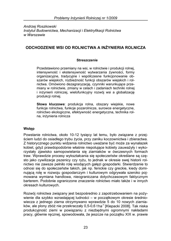 Problemy Inżynierii Rolniczej nr 1/2009 Andrzej Roszkowski Instytut Budownictwa, Mechanizacji i Elektryfikacji Rolnictwa w Warszawie ODCHODZENIE WSI OD ROLNICTWA A INŻYNIERIA ROLNICZA Streszczenie Przedstawiono przemiany na wsi, w rolnictwie i produkcji rolnej, intensywność i ekstensywność wytwarzania żywności, formy organizacyjne, tradycyjne i współczesne funkcjonowanie obszarów wiejskich, rozbieżność funkcji obszarów wiejskich i rolnictwa. Omówiono dezagraryzację, czynniki warunkujące przemiany w rolnictwie, zmiany w celach i zadaniach techniki rolnej i inżynierii rolniczej, wielofunkcyjny rozwój wsi a globalizację produkcji rolnej. Słowa kluczowe: produkcja rolna, obszary wiejskie, nowe funkcje rolnictwa, funkcje pozarolnicze, surowce energetyczne, rolnictwo ekologiczne, efektywność energetyczna, technika rolna, inżynieria rolnicza Wstęp Powstanie rolnictwa, około 10-12 tysięcy lat temu, było związane z przejściem ludzi do osiadłego trybu życia, przy zaniku koczownictwa i zbieractwa. Z historycznego punktu widzenia rolnictwo uważane być może za wynalazek kobiet, gdyż prawdopodobnie właśnie niepolujące kobiety zauważyły i wykorzystały zjawisko samopowielania się ziarniaków w ówczesnych formach traw. Wprawdzie procesy wykształcania się społeczeństw określane są często jako cywilizacje pszenicy czy ryżu, to jednak w okresie swej historii rolnictwo nie zawsze pełniło rolę wiodących gałęzi gospodarki. Stwierdzenie to odnosi się do społeczeństw takich, jak np. fenickie czy greckie, kiedy dominującą rolę w rozwoju gospodarczym i kulturowym odgrywała szeroko pojmowana wymiana handlowa, nieograniczana dotychczasowym faktycznym barterem. Podobnie ograniczone znaczenie rolnictwo miało także i w innych okresach kulturowych. Rozwój rolnictwa związany jest bezpośrednio z zapotrzebowaniem na pożywienie dla szybko wzrastającej ludności – w początkowym okresie średniowiecza z jednego ziarna otrzymywano wprawdzie 5 do 10 nowych ziarniaków, ale plony zbóż nie przekraczały 0,5-0,6 t.ha-1 [Klepacki 2008]. Tak niska produkcyjność ziemi w powiązaniu z niezbędnymi ogromnymi nakładami pracy, głównie ręcznej, spowodowała, że jeszcze na początku XIX w. prawie 23 Andrzej Roszkowski cała populacja ludzka zajmowała się produkcją rolną [Roszkowski 2007, 2008]. Wszechstronny rozwój nauk rolniczych (hodowla i nasiennictwo, odżywianie roślin i zwierząt, technologie produkcji, np. trójpolówka i zmianowanie), a przede wszystkim względna łatwość dostępu do różnych postaci energii (nawozy, ciągniki, energia elektryczna) spowodował ogromny wzrost produkcyjności rolnictwa. W powiązaniu z zapotrzebowaniem przemysłu na siłę roboczą procesy te spowodowały istotny rozwój i wzrost znaczenia techniki rolniczej, uważanej za siłę sprawczą rozwoju przemysłowego w XX w. [Haman 2006]. W rezultacie, pod koniec ubiegłego wieku, w krajach rozwiniętych wystąpiły zjawiska nadprodukcji rolnej równolegle z obszarami endemicznego niedożywienia w krajach tzw. trzeciego świata [Rural...2007], powodowanymi głównie przyczynami ekonomicznymi i społecznymi. Immanentną cechą technologii produkcji rolniczych są typ (rodzaj) produkcji i jej organizacja. Początek historii rolnictwa charakteryzował się ekstensywną produkcją i organizacją, w następnym okresie obserwuje się intensywność organizacji (pańszczyzna, niewolnictwo) i ekstensywność produkcji (np. wypalanie lasów) i wreszcie intensywna organizacja i produkcja [Klepacki 2008], co odpowiada kategorii czy pojęciom rolnictwa przemysłowego, a chyba nawet i precyzyjnego. Obecnie wydaje się, że mamy do czynienia z powrotem do poglądu o celowości ekstensywnej produkcji rolnej i ekstensywnej organizacji, z ta różnicą, że elementami czy czynnikami przewodnimi są w obu przypadkach względy środowiskowe i ekologiczne, a nie ekonomiczne, jak miało to miejsce w poprzednich etapach historii rolnictwa. Przemiany w funkcjach wsi i rolnictwa Działalność ludzka od zawsze związana była z przestrzenią – na znacznych obszarach dominowało rolnictwo i leśnictwo, ale bardziej zaawansowane formy działalności rozwijały się w miastach, powiązanych ze sobą siecią różnorodnych powiązań. Osadnictwo powstające na obszarach działalności rolniczej tworzyło osiedla (wsie), co doprowadziło do powstania obszarów wiejskich. Niezbywalnym celem produkcji rolnej pozostaje dostarczanie produktów żywnościowych o różnym stopniu przetworzenia w warunkach niedoborów powierzchni gruntów uprawnych, niedostatków wody przydatnej rolnictwu, niekorzystnych zmian klimatycznych, wzrastającego zanieczyszczenia środowiska w tym i powietrza, przy jednoczesnym wzroście wymagań jakościowych i ilościowych (Chiny, Indie) i realnie ograniczonych zasobach energetycznych [Ministerstwo...2007]. Zmieniające się w czasie rzeczywistości „ekonomiczna” i społeczna warunkujące produkcję rolną nie powodują zmian w jej zasadniczym celu, ale w sposób istotny zmieniają cechy wsi jako podstawowego miejsca realizacji produkcji rolnej. Niektórzy autorzy [Szczurowska i in. 2005] uważają wprost, że drogi rozwoju rolnictwa i wsi rozchodzą się. 24 Odchodzenie wsi od... Wieś zatraca swój charakter rolniczy, a rolnictwo coraz bardziej nabiera charakteru otwartego, podatnego na czynniki zewnętrzne, zwłaszcza makroekonomiczne. Zmiana poglądów na rolę obszarów wiejskich, rozumianych dotychczas przez tylko przez pryzmat gospodarczego znaczenia sektora rolniczego, nastąpiła w ostatnich latach ubiegłego wieku. W krajach UE dodatkowym impulsem były ograniczenia skuteczności dotychczasowej Wspólnej Polityki Rolnej (CAP) polegającej na wieloletnich wysokich subsydiach budżetowych dla podtrzymania cen i opłacalności produkcji rolnej. W Polsce udział dopłat bezpośrednich w dochodach rolniczych stanowił około 50%, przy czym połowa z tych środ