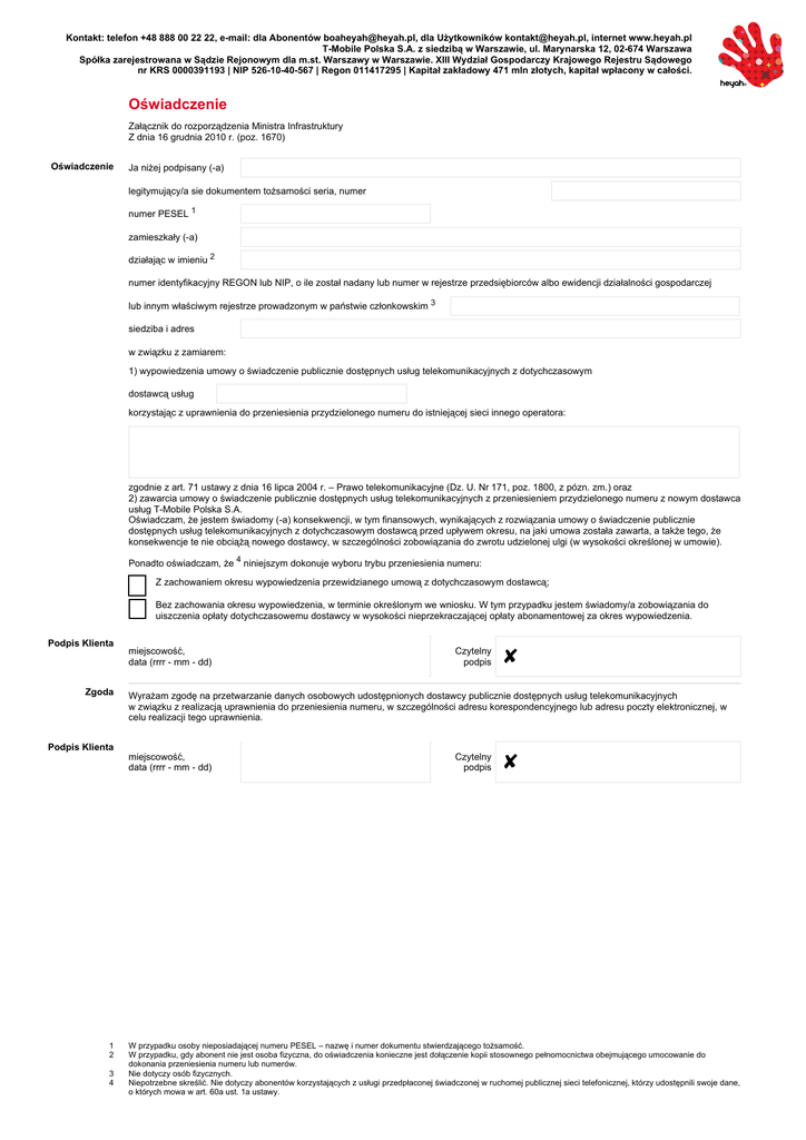 Kontakt: telefon +48 888 00 22 22, e-mail: dla Abonentów [email protected], dla Użytkowników [email protected], internet www.heyah.pl T-Mobile Polska S.A. z siedzibą w Warszawie, ul. Marynarska 12, 02-674 Warszawa Spółka zarejestrowana w Sądzie Rejonowym dla m.st. Warszawy w Warszawie. XIII Wydział Gospodarczy Krajowego Rejestru Sądowego nr KRS 0000391193 | NIP 526-10-40-567 | Regon 011417295 | Kapitał zakładowy 471 mln złotych, kapitał wpłacony w całości. Oświadczenie Załącznik do rozporządzenia Ministra Infrastruktury Z dnia 16 grudnia 2010 r. (poz. 1670) Oświadczenie Ja niżej podpisany (-a) legitymujący/a sie dokumentem tożsamości seria, numer numer PESEL 1 zamieszkały (-a) działając w imieniu 2 numer identyfikacyjny REGON lub NIP, o ile został nadany lub numer w rejestrze przedsiębiorców albo ewidencji działalności gospodarczej lub innym właściwym rejestrze prowadzonym w państwie członkowskim 3 siedziba i adres w związku z zamiarem: 1) wypowiedzenia umowy o świadczenie publicznie dostępnych usług telekomunikacyjnych z dotychczasowym dostawcą usług korzystając z uprawnienia do przeniesienia przydzielonego numeru do istniejącej sieci innego operatora: zgodnie z art. 71 ustawy z dnia 16 lipca 2004 r. – Prawo telekomunikacyjne (Dz. U. Nr 171, poz. 1800, z pózn. zm.) oraz 2) zawarcia umowy o świadczenie publicznie dostępnych usług telekomunikacyjnych z przeniesieniem przydzielonego numeru z nowym dostawca usług T-Mobile Polska S.A. Oświadczam, że jestem świadomy (-a) konsekwencji, w tym finansowych, wynikających z rozwiązania umowy o świadczenie publicznie dostępnych usług telekomunikacyjnych z dotychczasowym dostawcą przed upływem okresu, na jaki umowa została zawarta, a także tego, że konsekwencje te nie obciążą nowego dostawcy, w szczególności zobowiązania do zwrotu udzielonej ulgi (w wysokości określonej w umowie). Ponadto oświadczam, że 4 niniejszym dokonuje wyboru trybu przeniesienia numeru: Z zachowaniem okresu wypowiedzenia przewidzianego umową z dotychczasowym dostawcą; Bez zachowania okresu wypowiedzenia, w terminie określonym we wniosku. W tym przypadku jestem świadomy/a zobowiązania do uiszczenia opłaty dotychczasowemu dostawcy w wysokości nieprzekraczającej opłaty abonamentowej za okres wypowiedzenia. Podpis Klienta Zgoda miejscowość, data (rrrr - mm - dd) Czytelny podpis Wyrażam zgodę na przetwarzanie danych osobowych udostępnionych dostawcy publicznie dostępnych usług telekomunikacyjnych w związku z realizacją uprawnienia do przeniesienia numeru, w szczególności adresu korespondencyjnego lub adresu poczty elektronicznej, w celu realizacji tego uprawnienia. Podpis Klienta miejscowość, data (rrrr - mm - dd) 1 2 3 4 Czytelny podpis W przypadku osoby nieposiadającej numeru PESEL – nazwę i numer dokumentu stwierdzającego tożsamość. W przypadku, gdy abonent nie jest osoba fizyczna, do oświadczenia konieczne jest dołączenie kopii stosownego pełnomocnictwa obejmującego umocowanie do dokonania przeniesienia numeru lub numerów. Nie dotyczy osób fizycznych. Niepotrzebne skreślić. Nie dotyczy abonentów korzystających z usługi przedpłaconej świadczonej w ruchomej publicznej sieci telefonicznej, którzy udostępnili swoje dane, o których mowa w art. 60a ust. 1a ustawy.