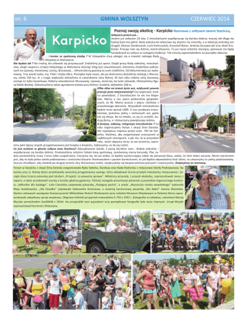 str. 6 GMINA WOLSZTYN CZERWIEC 2014 Poznaj swoją okolicę - Karpicko Rozmowa z sołtysem Janem Stachurą. Sołtysem jestem już... Jestem już sołtysem 24 lata. Z mieszkańcami współpracuje się bardzo dobrze, inaczej tak długo tej funkcji bym nie pełnił. Rada sołecka też właściwie się zbytnio nie zmieniła, a w skład jej wchodzą Jan Grygiel, Marian Zembrowski, Lech Komczyński, Krzysztof Bocer, Andrzej Szczepaniak oraz Józef Grubinski. Pracuje nam się dobrze, konstruktywnie. To już nasze ostatnie miesiące, ponieważ nie będę kandydował na sołtysa w następnej kadencji. Tak zresztą zapowiedziałem na początku obecnej. … i koniec ze społeczną służbą ? W listopadzie chcę ubiegać się o mandat radnego Rady Miejskiej w Wolsztynie. Nie będzie żal ? No trochę, bo człowiek się przyzwyczaił. Zrobiliśmy już sporo. Dzięki pracy Rady sołeckiej, mieszkańców, dzięki wsparciu Urzędu Miejskiego w Wolsztynie dziesięć dróg jest utwardzonych, kilometry chodników położonych na Lipowej, Kwiatowej, Leśnej, Brzozowej... Infrastrukturę gazową to sami zrobiliśmy. Od dokumentacji po wykonawcę. Trzy wioski tylko, my, Tłoki i chyba Obra. Pieniądze były nasze, ale po skończeniu dostaliśmy dotację z Warszawy, około 150 tys. zł, z czego większość włożyliśmy w utwardzenie ulicy Rolnej. W tym roku robimy ulicę Sosnową, zostaje mi tylko Świerkowa. Robimy odwodnienie Wczasowej, Lipowej, Jeziornej, bo ludzi zalewało. Odnowiliśmy figurę Matki Boskiej. Dokończyliśmy także ogrodzenie boiska przy Rolnej i chodnik, dokładnie 160 m. Kilka słów na temat życia wsi, większość pewnie pracuje poza miejscowością? Czy większość, trudno powiedzieć. Z bezrobociem to nie ma kłopotów. Mamy u nas sporo podmiotów gospodarczych, ze 40. Mamy jeszcze z pięciu rolników z prawdziwego zdarzenia. Wszystkich mieszkańców będzie teraz ponad 1400. U nas przybywa mieszkańców, jesteśmy jedną z nielicznych wsi, gdzie tak się dzieje. Bo to młodzi, co się tu urodzili, budują domy, a i dziewczyny powiększają rodziny. A festyny, zabawy, integracja mieszkańców ? Co roku organizujemy festyn z okazji Dnia Dziecka. Ale największa impreza przed nami. 750 lat Karpicka. Myślimy, aby zorganizować uroczystość w najbliższych miesiącach, a jak nie, to w przyszłym roku. Jeżeli zdążymy teraz, to we wrześniu, zaprosimy jakiś lepszy zespół, przygotowywana jest książka o Karpicku. Zobaczymy, co da się zrobić. Co jest oczkiem w głowie sołtysa Jana Stachury? Zdecydowanie Szkoła. Z panią Dyrektor nam - Radzie sołeckiej – współpracuje się bardzo dobrze. Przekazaliśmy ostatnio Szkole kosę spalinową, zamówioną mamy karuzelę. Plac zabaw postawiliśmy nowy i teraz tylko uzupełniamy. Cieszymy się, bo już widać, że będzie wystarczający nabór do pierwszej klasy, widać, że ilość dzieci wzrasta. Moim marzeniem jest, aby to była pełna szkoła podstawowa z sześcioma klasami. Rozmawiałem z panem burmistrzem, że jak będzie odpowiednia ilość dzieci, to utworzymy tu pełną podstawówkę. Jeszcze chciałbym, aby chodnik po drugiej stronie ulicy Wczasowej zrobić, zwiększyłoby się bezpieczeństwo pieszych i rowerzystów. Dziękujemy za rozmowę. Festyn w Karpicku z okazji Dnia Dziecka zorganizowała Rada Sołecka, Dyrekcja oraz Rada Rodziców z miejscowej Szkoły Podstawowej. Na boisku przy ul. Rolnej dzieci przedstawiły wcześniej przygotowany występ, który oklaskiwali licznie przybyli mieszkańcy miejscowości. Zaczęła klasa trzecia piosenką pod tytułem „Przyjaźń, to poważna sprawa”. Miłośnicy przyrody, i przyszli ekolodzy, zaprezentowali taniec z lupami, a także przedstawili scenkę o bardzo głodnej gąsienicy. Później nastąpiła prezentacja piosenek uczestników tegorocznego konkursu „Mikrofon dla każdego”. Julia Ciesielska zaśpiewała piosenkę „Pożegnaj pecha”, a utwór „Wycieczka smoka wawelskiego" wykonała Maja Goździewska. „Dla Dziadka” zaśpiewała Aleksandra Kostrzewa, a ostatnią konkursową piosenkę „Dla Babci” Joanna Zboralska. Oprócz ciekawych występów Stowarzyszenie Miłośników Historii Woskowości przy Lubskim Muzeum Wojskowym w Zielonej Górze zaprezentowało zabytkowy sprzęt wojskowy. Zbigniew Heliński przyjechał motocyklem K-750 z 1952 r. (fotografia na okładce), natomiast Maciej Myczka samochodem Gaz69AM z 1954r. Na przejażdżki tymi pojazdami oraz pamiątkowe fotografie było dużo chętnych. Urząd Miejski reprezentował burmistrz Wolsztyna.