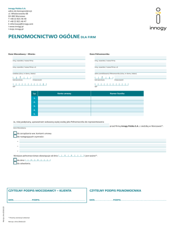 innogy Polska S.A. adres do korespondencji: ul. Włodarzewska 68 02-384 Warszawa T +48 22 821 46 40 F +48 22 821 46 47 E [email protected] I www.innogy.pl I moje.innogy.pl PEŁNOMOCNICTWO OGÓLNE DLA FIRM Dane Mocodawcy – Klienta: Dane Pełnomocnika: imię, nazwisko / nazwa firmy imię, nazwisko / nazwa firmy imię, nazwisko / nazwa firmy c.d. imię, nazwisko / nazwa firmy c.d. siedziba (ulica, nr domu, lokalu) adres zameldowania Pełnomocnika (ulica, nr domu, lokalu) kod pocztowy kod pocztowy miejscowość NIP miejscowość NIP l.p. Konto umowy Numer licznika 1. 2. 3. 4. 5. Ja, niżej podpisany, upoważniam wskazaną wyżej osobę jako Pełnomocnika do reprezentowania przed firmą innogy Polska S.A. z siedzibą w Warszawie*: dane Mocodawcy do zarządzania ww. kontami umowy do następujących czynności: ---Niniejsze pełnomocnictwo obowiązuje od dnia i jest ważne*: Wersja z dnia 20161123 do dnia do odwołania. CZYTELNY PODPIS MOCODAWCY – KLIENTA CZYTELNY PODPIS PEŁNOMOCNIKA DATA. . . . . . . . . . . . . . . . . PODPIS. . . . . . . . . . . . . . . . . . . . . . . . . . . . . . . . . . . . . . . . . . DATA. . . . . . . . . . . . . . . . . PODPIS. . . . . . . . . . . . . . . . . . . . . . . . . . . . . . . . . . . . . . . . . . * Prosimy zaznaczyć właściwe Wersja z dnia 20161123