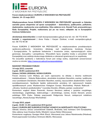 Forum międzynarodowe | EUROPA Z WIDOKIEM NA PRZYSZŁOŚĆ Gdańsk, 14–15 maja 2015 Międzynarodowe forum EUROPA Z WIDOKIEM NA PRZYSZŁOŚĆ zgromadzi w Gdańsku szerokie grono ekspertów od spraw europejskich – dziennikarzy, publicystów, polityków, dyplomatów, naukowców oraz analityków. Głos zabierze m.in. Donald Tusk, przewodniczący Rady Europejskiej. Projekt, realizowany już po raz trzeci, odbędzie się w Europejskim Centrum Solidarności. akredytacje dziennikarskie | e-mail: [email protected] oraz tel.: tel.: 58 772 40 05 kontakt z organizatorami | Anna Fedas i Kacper Dziekan, e-mail: [email protected], tel.: 58 772 40 38 Forum EUROPA Z WIDOKIEM NA PRZYSZŁOŚĆ to międzynarodowe przedsięwzięcie społeczno-polityczne. Uczestnicy debatują nad współczesną kondycją Europy i Europejczyków. To spotkanie bohaterów i kreatorów zmian, reprezentujących różne generacje, dyscypliny i perspektywy. Wszystkich łączy wspólna troska o przyszłość Unii Europejskiej oraz ambicja skutecznego działania w obszarach graniczących ze wspólnotą. Na wszystkie spotkania z kalendarza forum jest wstęp wolny, wejściówki zarezerwować można na stronie: http://www.ecs.gda.pl/europazwidokiem RAMOWY PROGRAM FORUM 14 maja 2015, czwartek ● godz. 18.00 | audytorium ECS Debata | NOWA UKRAINA, NOWA EUROPA Forum otworzy Lech Wałęsa, po czym zapraszamy na debatę z dwoma wybitnymi intelektualistami – Mykołą Riabczukiem, ukraińskim krytykiem literackim, eseistą i publicystą oraz Leonidasem Donskisem, litewskim filozofem, eseistą, nauczycielem akademickim i byłym eurodeputowanym. Spotkanie będzie jednocześnie premierą ich najnowszych książek, opublikowanych przez Wydawnictwo Kolegium Europy Wschodniej: Mykoła Riabczuk – „Ukraina. Syndrom postkolonialny” i Leonidas Donskis „Władza, pamięć, wyobraźnia”. Komentarz wygłosi Adam Pomorski, tłumacz literatury pięknej z języków rosyjskiego, niemieckiego, angielskiego, białoruskiego i ukraińskiego, eseista, krytyk literacki, prezes polskiego PEN Clubu. Debatę poprowadzi Małgorzata Nocuń, zastępczyni redaktora naczelnego „Nowej Europy Wschodniej”. 15 maja 2015, piątek ● godz. 10.00–11.30 | audytorium ECS (parter) Panel I | EUROPA BEZ EUROPEJCZYKÓW? KONDYCJA WSPÓLNOTY POLITYCZNEJ Obrady otworzy Janusz Lewandowski (Gdańsk, Bruksela), były komisarz Unii Europejskiej. Głos zabiorą: Iwan Krastew (Sofia, Wiedeń) i Janusz Reiter (Warszawa). Komentarze wygłoszą: Georges Mink (Paryż, Warszawa) oraz Jelena Niemirowska (Moskwa). Panel poprowadzi Corneliusz Ochmann (Berlin, Warszawa). ● godz. 12.00–13.30 | audytorium ECS (parter) Panel II | EUROPA W CZASACH WOJNY NA WSCHODZIE. CZEGO UCZY UKRAIŃSKA REWOLUCJA? Głos zabiorą: Piotr Andrusieczko (Poznań, Kijów), Wiktor Jerofiejew (Moskwa) oraz Andrij Portnow (Lwów, Dnietropietrowsk). Komentarze wygłoszą: Iryna Bekeszkina (Kijów), John C. Kornblum (Waszyngton, Berlin) oraz Olaf Osica (Warszawa). Panel poprowadzi Maria Przełomiec (Kraków). ● godz. 14.30 | wystawa stała ECS (parter) Zwiedzanie wystawy stałej ECS | NARODZINY NOWEGO ŁADU EUROPY Zbigniew Janas, dawny działacz opozycyjny, przedsiębiorca i polityk, oprowadzi uczestników forum po wystawie stałej ECS. ● godz. 15.30–17.00, biblioteka ECS (I piętro) Konwersatorium | LIBERALNA DEMOKRACJA W POLSCE – PRÓBA DIAGNOZY Konwersatorium, którego przesłanką będą dwa tytuły: antologia „Przeglądu Politycznego” – „Liberalizm polski” pod red. Ireneusza Krzemińskiego oraz monografii Konrada Knocha – „Pisma liberalne drugiego obiegu w Polsce w latach 1979–1990”. Głos zabiorą: Dariusz Filar, Janusz Lewandowski, Piotr Kapczyński, Konrad Knoch oraz Ireneusz Krzemiński. Spotkanie poprowadzi Wojciech Duda, historyk, wydawca, redaktor naczelny „Przeglądu Politycznego”. ● godz. 17.00, audytorium ECS (parter) Ogłoszenie wyników konkursu | AMBASADOR NOWEJ EUROPY 2015 Ogłoszenie wyników trzeciej edycji konkursu „Ambasador Nowej Europy” oraz uroczyste wręczenie nagrody za najlepszą książkę poruszającą tematy europejskie, wydaną w 2014 roku. Galę poprowadzi Jolanta Darczewska, przewodnicząca jury. Nagroda ufundowały współpracujące ze sobą Europejskiego Centrum Solidarności i Kolegium Europy Wschodniej. ● godz. 18.30, audytorium ECS (parter) Wystąpienie | EUROPA Z WIDOKIEM NA PRZYSZŁOŚĆ Głos zabierze Donald Tusk, przewodniczący Rady Europejskiej, po czym nastąpi dyskusja z udziałem wszystkich uczestników forum. Moderatorem będzie Basil Kerski, dyrektor ECS. PANELIŚCI Piotr Andrusieczko, Polska | politolog, publicysta i dziennikarz, relacjonujący konflikt na Ukrainie Iryna Bekeszkina, Ukraina | socjolog, filozof, dyrektor Fundacji Inicjatyw Demokratycznych w Kijowie Leonidas Donskis, Litwa | filozof, eseista, były eurodeputowany Wojciech Duda, Polska | historyk, publicysta, wydawca, redaktor naczelny „Przeglądu Politycznego” Dariusz Filar, Polska | ekonomista, naukowiec, publicysta, były członek Rady Polityki Pieniężnej Zbigniew Janas, Polska | polityk, przedsiębiorca, dawny działacz opozycji Wiktor Jerofiejew, Rosja | pisarz, publicysta, krytyk literacki Piotr Kapczyński, Polska | ekonomista, przedsiębiorca, działacz Solidarności Basil Kerski, Polska | politolog, publicysta, dyrektor Europejskiego Centrum Solidarności Konrad Knoch, Polska | historyk, publicysta, badacz opozycji PRL, kierownik Działu Badań Historycznych Europejskiego Centrum Solidarności John C. Kornblum, Stany Zjednoczone | dyplomata, publicysta, przedsiębiorca Paweł Kowal, Polska | doktor nauk politycznych, historyk, polityk, były deputowany do Parlamentu Europejskiego Iwan Krastew, Bułgaria | politolog, analityk, publicysta, szef Centrum Strategii Liberalnych w Sofii Ireneusz Krzemiński, Polska | socjolog, badacz, nauczyciel akademicki, publicysta Janusz Lewandowski, Polska | ekonomista, polityk, przewodniczący Rady Gospodarcz
