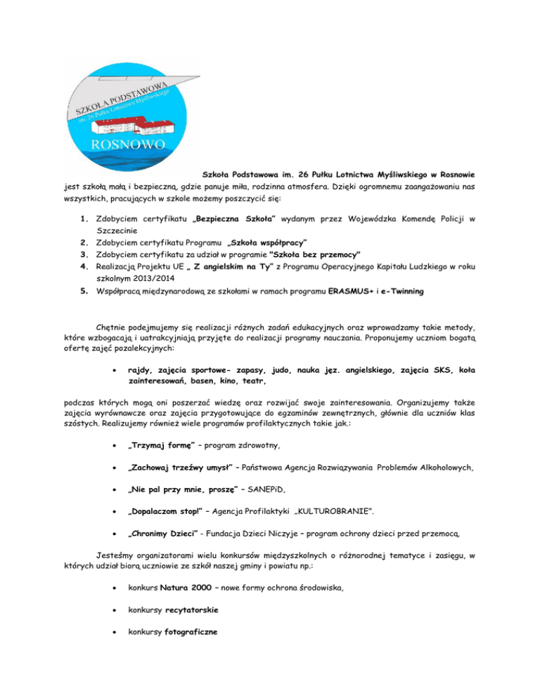 Szkoła Podstawowa im. 26 Pułku Lotnictwa Myśliwskiego w Rosnowie jest szkołą małą i bezpieczną, gdzie panuje miła, rodzinna atmosfera. Dzięki ogromnemu zaangażowaniu nas wszystkich, pracujących w szkole możemy poszczycić się: 1. Zdobyciem certyfikatu „Bezpieczna Szkoła” wydanym przez Wojewódzka Komendę Policji w Szczecinie 2. Zdobyciem certyfikatu Programu „Szkoła współpracy” 3. Zdobyciem certyfikatu za udział w programie "Szkoła bez przemocy" 4. Realizacją Projektu UE „ Z angielskim na Ty” z Programu Operacyjnego Kapitału Ludzkiego w roku szkolnym 2013/2014 5. Współpracą międzynarodową ze szkołami w ramach programu ERASMUS+ i e-Twinning Chętnie podejmujemy się realizacji różnych zadań edukacyjnych oraz wprowadzamy takie metody, które wzbogacają i uatrakcyjniają przyjęte do realizacji programy nauczania. Proponujemy uczniom bogatą ofertę zajęć pozalekcyjnych: rajdy, zajęcia sportowe- zapasy, judo, nauka jęz. angielskiego, zajęcia SKS, koła zainteresowań, basen, kino, teatr, podczas których mogą oni poszerzać wiedzę oraz rozwijać swoje zainteresowania. Organizujemy także zajęcia wyrównawcze oraz zajęcia przygotowujące do egzaminów zewnętrznych, głównie dla uczniów klas szóstych. Realizujemy również wiele programów profilaktycznych takie jak.: „Trzymaj formę” – program zdrowotny, „Zachowaj trzeźwy umysł” – Państwowa Agencja Rozwiązywania Problemów Alkoholowych, „Nie pal przy mnie, proszę” – SANEPiD, „Dopalaczom stop!” – Agencja Profilaktyki „KULTUROBRANIE”. „Chronimy Dzieci” - Fundacja Dzieci Niczyje – program ochrony dzieci przed przemocą. Jesteśmy organizatorami wielu konkursów międzyszkolnych o różnorodnej tematyce i zasięgu, w których udział biorą uczniowie ze szkół naszej gminy i powiatu np.: konkurs Natura 2000 – nowe formy ochrona środowiska, konkursy recytatorskie konkursy fotograficzne konkursy ortograficzne i literackie konkursy plastyczne zawody sportowe unihokej – drużyny dziewcząt i drużyny chłopców zawody sportowe siatkówka - drużyny dziewcząt i drużyny chłopców zawody sportowe piłka nożna - drużyny dziewcząt i drużyny chłopców zawody sportowe tenis stołowy- drużyny dziewcząt i drużyny chłopców Wyróżnia nas również szeroka działalność charytatywna w szkole działa Stowarzyszenie „Przyjazna Dłoń”. Współpracujemy ze środowiskiem lokalnym, podejmując wiele inicjatyw i pozyskując licznych sponsorów m.in.: Radę Rodziców, Radę Osiedla w Rosnowie, Radę Sołecką w Rosnowie, Nadleśnictwo w Manowie, Nadleśnictwo w Tychowie, Stowarzyszenie Ziemi Manowskiej, Ośrodek Postresocjalizacyjny w Darżewie, Fundację „Działaj Lokalnie”, Gminny Zespół Interdyscyplinarny ds. Przemocy w Rodzinie, a także lokalnych przedsiębiorców: Przewozy RUMCAJS, Przewozy BAŁTYK, a także gospoda U ZDZICHA. Joanna Margraf Dyrektor Szkoły Podstawowej im. 26 Pułku Lotnictwa Myśliwskiego w Rosnowie