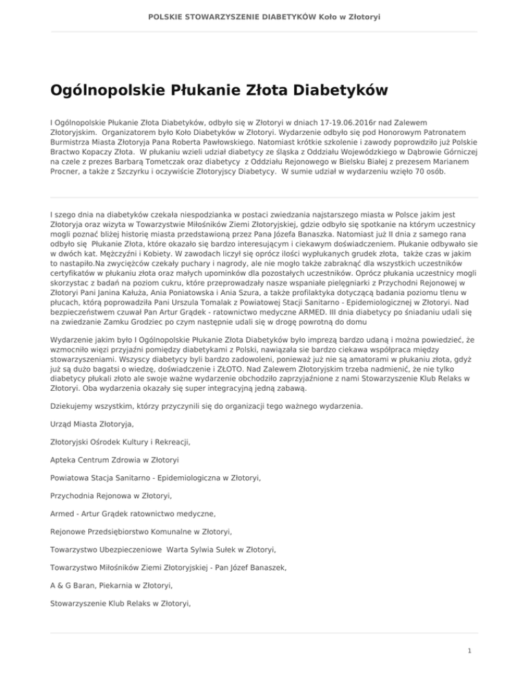 POLSKIE STOWARZYSZENIE DIABETYKÓW Koło w Złotoryi Ogólnopolskie Płukanie Złota Diabetyków I Ogólnopolskie Płukanie Złota Diabetyków, odbyło się w Złotoryi w dniach 17-19.06.2016r nad Zalewem Złotoryjskim. Organizatorem było Koło Diabetyków w Złotoryi. Wydarzenie odbyło się pod Honorowym Patronatem Burmistrza Miasta Złotoryja Pana Roberta Pawłowskiego. Natomiast krótkie szkolenie i zawody poprowdziło już Polskie Bractwo Kopaczy Złota. W płukaniu wzieli udział diabetycy ze śląska z Oddziału Wojewódzkiego w Dąbrowie Górniczej na czele z prezes Barbarą Tometczak oraz diabetycy z Oddziału Rejonowego w Bielsku Białej z prezesem Marianem Procner, a także z Szczyrku i oczywiście Złotoryjscy Diabetycy. W sumie udział w wydarzeniu wzięło 70 osób. I szego dnia na diabetyków czekała niespodzianka w postaci zwiedzania najstarszego miasta w Polsce jakim jest Złotoryja oraz wizyta w Towarzystwie Miłośników Ziemi Złotoryjskiej, gdzie odbyło się spotkanie na którym uczestnicy mogli poznać bliżej historię miasta przedstawioną przez Pana Józefa Banaszka. Natomiast już II dnia z samego rana odbyło się Płukanie Złota, które okazało się bardzo interesującym i ciekawym doświadczeniem. Płukanie odbywało sie w dwóch kat. Mężczyźni i Kobiety. W zawodach liczył się oprócz ilości wypłukanych grudek złota, także czas w jakim to nastapiło.Na zwyciężców czekały puchary i nagrody, ale nie mogło także zabraknąć dla wszystkich uczestników certyfikatów w płukaniu złota oraz małych upominków dla pozostałych uczestników. Oprócz płukania uczestnicy mogli skorzystac z badań na poziom cukru, które przeprowadzały nasze wspaniałe pielęgniarki z Przychodni Rejonowej w Złotoryi Pani Janina Kałuża, Ania Poniatowska i Ania Szura, a także profilaktyka dotyczącą badania poziomu tlenu w płucach, którą poprowadziła Pani Urszula Tomalak z Powiatowej Stacji Sanitarno - Epidemiologicznej w Złotoryi. Nad bezpieczeństwem czuwał Pan Artur Grądek - ratownictwo medyczne ARMED. III dnia diabetycy po śniadaniu udali się na zwiedzanie Zamku Grodziec po czym następnie udali się w drogę powrotną do domu Wydarzenie jakim było I Ogólnopolskie Płukanie Złota Diabetyków było imprezą bardzo udaną i można powiedzieć, że wzmocniło więzi przyjaźni pomiędzy diabetykami z Polski, nawiązała sie bardzo ciekawa współpraca między stowarzyszeniami. Wszyscy diabetycy byli bardzo zadowoleni, ponieważ już nie są amatorami w płukaniu złota, gdyż już są dużo bagatsi o wiedzę, doświadczenie i ZŁOTO. Nad Zalewem Złotoryjskim trzeba nadmienić, że nie tylko diabetycy płukali złoto ale swoje ważne wydarzenie obchodziło zaprzyjaźnione z nami Stowarzyszenie Klub Relaks w Złotoryi. Oba wydarzenia okazały się super integracyjną jedną zabawą. Dziekujemy wszystkim, którzy przyczynili się do organizacji tego ważnego wydarzenia. Urząd Miasta Złotoryja, Złotoryjski Ośrodek Kultury i Rekreacji, Apteka Centrum Zdrowia w Złotoryi Powiatowa Stacja Sanitarno - Epidemiologiczna w Złotoryi, Przychodnia Rejonowa w Złotoryi, Armed - Artur Grądek ratownictwo medyczne, Rejonowe Przedsiębiorstwo Komunalne w Złotoryi, Towarzystwo Ubezpieczeniowe Warta Sylwia Sułek w Złotoryi, Towarzystwo Miłośników Ziemi Złotoryjskiej - Pan Józef Banaszek, A & G Baran, Piekarnia w Złotoryi, Stowarzyszenie Klub Relaks w Złotoryi, 1 POLSKIE STOWARZYSZENIE DIABETYKÓW Koło w Złotoryi Centrum Informacji Turystycznej w Złotoryi. Przedwszystkim dziękujemy wszystkim wolontariuszom z koła diabetyków uczestniczącym w wydarzeniu oraz przybyłym gościom biorącym udział w wydarzeniu. Zarząd Koła Diabetyków w Złotoryi 2