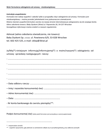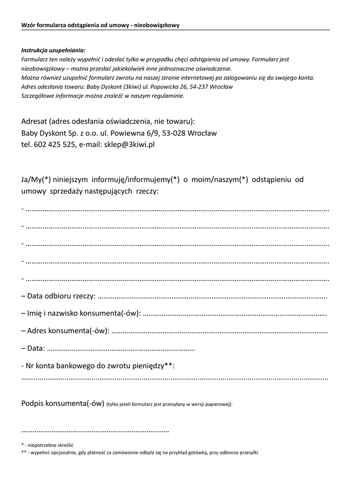 Wzór formularza odstąpienia od umowy - nieobowiązkowy Instrukcja uzupełniania: Formularz ten należy wypełnić i odesłać tylko w przypadku chęci odstąpienia od umowy. Formularz jest nieobowiązkowy – można przesłać jakiekolwiek inne jednoznaczne oświadczenie. Można również uzupełnić formularz zwrotu na naszej stronie internetowej po zalogowaniu się do swojego konta. Adres odesłania towaru: Baby Dyskont (3kiwi) ul. Popowicka 26, 54-237 Wrocław Szczegółowe informacje można znaleźć w naszym regulaminie. Adresat (adres odesłania oświadczenia, nie towaru): Baby Dyskont Sp. z o.o. ul. Powiewna 6/9, 53-028 Wrocław tel. 602 425 525, e-mail: [email protected] Ja/My(*) niniejszym informuję/informujemy(*) o moim/naszym(*) odstąpieniu od umowy sprzedaży następujących rzeczy: - ……………………………………………………………………………………………………………………………………………. - ……………………………………………………………………………………………………………………………………………. - ……………………………………………………………………………………………………………………………………………. - ……………………………………………………………………………………………………………………………………………. - ……………………………………………………………………………………………………………………………………………. – Data odbioru rzeczy: …………………………………………………………………………………………………………. – Imię i nazwisko konsumenta(-ów): ……………………………………………………………………………………. – Adres konsumenta(-ów): …………………………………………………………………………………………………… – Data: …………………………………………………………………… - Nr konta bankowego do zwrotu pieniędzy**: …................................................................................................................................................. Podpis konsumenta(-ów) (tylko jeżeli formularz jest przesyłany w wersji papierowej): …………………………………………………………………… * - niepotrzebne skreślić ** - wypełnić opcjonalnie, gdy płatność za zamówienie odbyła się na przykład gotówką, przy odbiorze przesyłki
