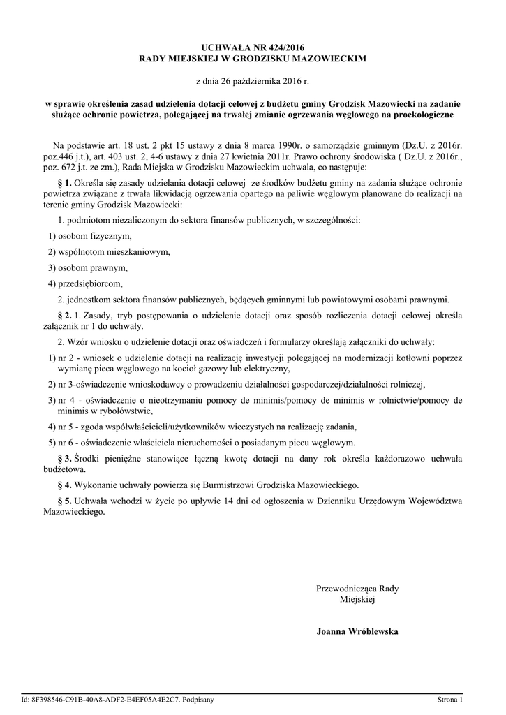 UCHWAŁA NR 424/2016 RADY MIEJSKIEJ W GRODZISKU MAZOWIECKIM z dnia 26 października 2016 r. w sprawie określenia zasad udzielenia dotacji celowej z budżetu gminy Grodzisk Mazowiecki na zadanie służące ochronie powietrza, polegającej na trwałej zmianie ogrzewania węglowego na proekologiczne Na podstawie art. 18 ust. 2 pkt 15 ustawy z dnia 8 marca 1990r. o samorządzie gminnym (Dz.U. z 2016r. poz.446 j.t.), art. 403 ust. 2, 4-6 ustawy z dnia 27 kwietnia 2011r. Prawo ochrony środowiska ( Dz.U. z 2016r., poz. 672 j.t. ze zm.), Rada Miejska w Grodzisku Mazowieckim uchwala, co następuje: § 1. Określa się zasady udzielania dotacji celowej ze środków budżetu gminy na zadania służące ochronie powietrza związane z trwała likwidacją ogrzewania opartego na paliwie węglowym planowane do realizacji na terenie gminy Grodzisk Mazowiecki: 1. podmiotom niezaliczonym do sektora finansów publicznych, w szczególności: 1) osobom fizycznym, 2) wspólnotom mieszkaniowym, 3) osobom prawnym, 4) przedsiębiorcom, 2. jednostkom sektora finansów publicznych, będących gminnymi lub powiatowymi osobami prawnymi. § 2. 1. Zasady, tryb postępowania o udzielenie dotacji oraz sposób rozliczenia dotacji celowej określa załącznik nr 1 do uchwały. 2. Wzór wniosku o udzielenie dotacji oraz oświadczeń i formularzy określają załączniki do uchwały: 1) nr 2 - wniosek o udzielenie dotacji na realizację inwestycji polegającej na modernizacji kotłowni poprzez wymianę pieca węglowego na kocioł gazowy lub elektryczny, 2) nr 3-oświadczenie wnioskodawcy o prowadzeniu działalności gospodarczej/działalności rolniczej, 3) nr 4 - oświadczenie o nieotrzymaniu pomocy de minimis/pomocy de minimis w rolnictwie/pomocy de minimis w rybołówstwie, 4) nr 5 - zgoda współwłaścicieli/użytkowników wieczystych na realizację zadania, 5) nr 6 - oświadczenie właściciela nieruchomości o posiadanym piecu węglowym. § 3. Środki pieniężne stanowiące łączną kwotę dotacji na dany rok określa każdorazowo uchwała budżetowa. § 4. Wykonanie uchwały powierza się Burmistrzowi Grodziska Mazowieckiego. § 5. Uchwała wchodzi w życie po upływie 14 dni od ogłoszenia w Dzienniku Urzędowym Województwa Mazowieckiego. Przewodnicząca Rady Miejskiej Joanna Wróblewska Id: 8F398546-C91B-40A8-ADF2-E4EF05A4E2C7. Podpisany Strona 1 Id: 8F398546-C91B-40A8-ADF2-E4EF05A4E2C7. Podpisany Strona 2 Załącznik Nr 1 do Uchwały Nr 424/2016 Rady Miejskiej w Grodzisku Mazowieckim z dnia 26 października 2016 r. Rozdział 1. Zasady udzielania dotacji celowej § 1. O dotację celową mogą się ubiegać: 1. podmioty niezaliczone do sektora finansów publicznych, w szczególności: 1) osoby fizyczne, 2) wspólnoty mieszkaniowe, 3) osoby prawne, 4) przedsiębiorcy, 2. jednostki sektora finansów publicznych, będących gminnymi lub powiatowymi osobami prawnymi. § 2. Dotacje celowe dla podmiotów prowadzących działalność gospodarczą stanowią pomoc de minimis lub pomoc de minimis w rolnictwie lub rybołówstwie, o której mowa w ustawie z dnia 30 kwietnia 2004r. o postępowaniu w sprawach dotyczących pomocy publicznej (t.j. Dz. U. z 2007r., nr 59, poz. 404 z późn. zm.), a jej udzielenie następuje z uwzględnieniem warunków dopuszczalności tej pomocy określonych w przepisach prawa Unii Europejskiej, a w szczególności do jej udzielenia stosuje się przepisy: 1) rozporządzenia Komisji (UE) nr 1407/2013 z dnia 18 grudnia 2013r. w sprawie stosowania art. 107 i 108 Traktatu o funkcjonowaniu Unii Europejskiej do pomocy de minimis (Dz. U. UE. L 2013.352.1), 2) rozporządzenia Komisji (UE) Nr 1408/2013 z 18 grudnia 2013r. w sprawie stosowania art. 107 i 108 Traktatu o funkcjonowaniu Unii Europejskiej do pomocy de minimis w sektorze rolnym (Dz. U. UE L,2013.352.9), 3) rozporządzenie Komisji (UE) nr 717/2014 z dnia 27 czerwca 2014r. w sprawie stosowania art. 107 i 108 Traktatu o funkcjonowaniu Unii Europejskiej do pomocy de minimis w sektorze rybołówstwa i akwakultury (Dz.U. UE L. 2014.190.45). § 3. 1. Dotacja celowa może być udzielona na dofinansowanie zadania w zakresie modernizacji kotłowni poprzez wymianę pieca węglowego na kocioł gazowy lub elektryczny. 2. Dofinansowanie odbywa się w formie refundacji poniesionych na terenie Gminy Grodzisk Mazowiecki kosztów związanych z realizacją zadań, o których mowa w ust. 1 powyżej. Wypłata dotacji następuje na podstawie przedłożonych przez wnioskodawcę dokumentów wymaganych zapisami zawartej umowy. § 4. Do ubiegania się o dotację uprawnione są podmioty, o których mowa w § 1, które posiadają tytuł prawny (prawo własności lub prawo użytkowania wieczystego) do nieruchomości zlokalizowanej na terenie Gminy Grodzisk Mazowiecki, na której ma być realizowane zadanie. § 5. 1. Przyznanie dotacji uzależnione jest od możliwości finansowych Gminy Grodzisk Mazowiecki w danym roku budżetowym. 2. Dotacja przydzielana będzie w wysokości 70% poniesionych kosztów ale nie więcej niż 6000 zł. 3. Przyznanie dotacji dla zadania, o którym mowa w § 3 ust. 1 następuje pod łącznie spełnionymi warunkami: 1) dofinansowanie przysługuje tylko i wyłącznie na zakup nowego kotła gazowego lub elektrycznego przy czym urządzenie musi być fabrycznie nowe (nieużywane), posiadające atesty dopuszczające go do powszechnego użytku z przyznaną gwarancją, 2) piec węglowy ulegnie trwałej likwidacji, 3) wnioskodawca o dofinansowanie na wymianę pieca węglowego poprzez zakup nowego kotła gazowego lub elektrycznego może ubiegać się tylko raz na jeden lokal mieszkalny. Id: 8F398546-C91B-40A8-ADF2-E4EF05A4E2C7. Podpisany Strona 1 § 6. W zakresie, w jakim niniejsza uchwała przewiduje udzielenie dotacji stanowiących pomoc de minimis, pomoc de minimis w rolnictwie lub rybołówstwie i akwakulturze, przepisy uchwały mają zastosowanie do dnia 31 grudnia 2020r. Rozdział 2. Kryteria wyboru inwestycji lub zadania oraz tryb postępowania w 