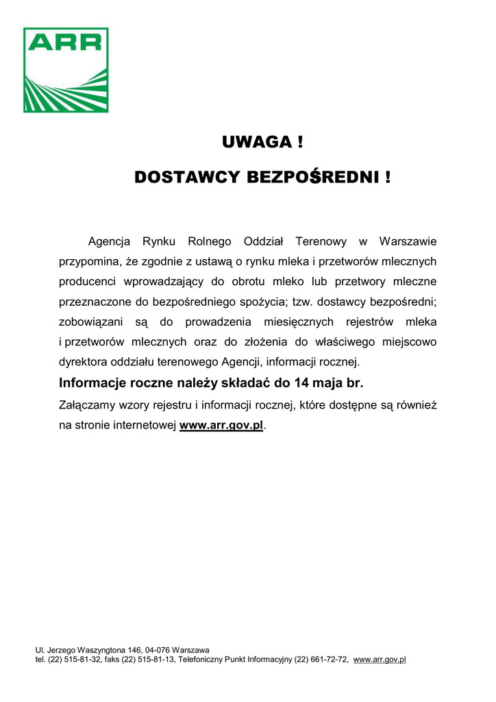 UWAGA ! DOSTAWCY BEZPOŚREDNI ! Agencja Rynku Rolnego Oddział Terenowy w Warszawie przypomina, że zgodnie z ustawą o rynku mleka i przetworów mlecznych producenci wprowadzający do obrotu mleko lub przetwory mleczne przeznaczone do bezpośredniego spożycia; tzw. dostawcy bezpośredni; zobowiązani są do prowadzenia miesięcznych rejestrów mleka i przetworów mlecznych oraz do złożenia do właściwego miejscowo dyrektora oddziału terenowego Agencji, informacji rocznej. Informacje roczne należy składać do 14 maja br. Załączamy wzory rejestru i informacji rocznej, które dostępne są również na stronie internetowej www.arr.gov.pl. Ul. Jerzego Waszyngtona 146, 04-076 Warszawa tel. (22) 515-81-32, faks (22) 515-81-13, Telefoniczny Punkt Informacyjny (22) 661-72-72, www.arr.gov.pl