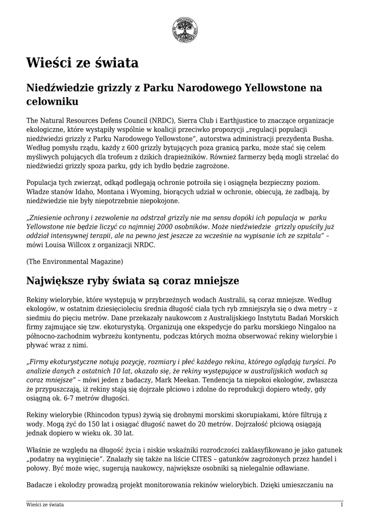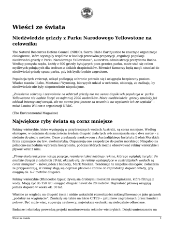 Wieści ze świata Niedźwiedzie grizzly z Parku Narodowego Yellowstone na celowniku The Natural Resources Defens Council (NRDC), Sierra Club i Earthjustice to znaczące organizacje ekologiczne, które wystąpiły wspólnie w koalicji przeciwko propozycji „regulacji populacji niedźwiedzi grizzly z Parku Narodowego Yellowstone”, autorstwa administracji prezydenta Busha. Według pomysłu rządu, każdy z 600 grizzly bytujących poza granicą parku, może stać się celem myśliwych polujących dla trofeum z dzikich drapieżników. Również farmerzy będą mogli strzelać do niedźwiedzi grizzly spoza parku, gdy ich bydło będzie zagrożone. Populacja tych zwierząt, odkąd podlegają ochronie potroiła się i osiągnęła bezpieczny poziom. Władze stanów Idaho, Montana i Wyoming, biorących udział w ochronie, obiecują, że zadbają, by niedźwiedzie nie były niepotrzebnie niepokojone. „Zniesienie ochrony i zezwolenie na odstrzał grizzly nie ma sensu dopóki ich populacja w parku Yellowstone nie będzie liczyć co najmniej 2000 osobników. Może niedźwiedzie grizzly opuściły już oddział intensywnej terapii, ale na pewno jest jeszcze za wcześnie na wypisanie ich ze szpitala” – mówi Louisa Willcox z organizacji NRDC. (The Environmental Magazine) Największe ryby świata są coraz mniejsze Rekiny wielorybie, które występują w przybrzeżnych wodach Australii, są coraz mniejsze. Według ekologów, w ostatnim dziesięcioleciu średnia długość ciała tych ryb zmniejszyła się o dwa metry – z siedmiu do pięciu metrów. Dane przekazały naukowcom z Australijskiego Instytutu Badań Morskich firmy zajmujące się tzw. ekoturystyką. Organizują one ekspedycje do parku morskiego Ningaloo na północno-zachodnim wybrzeżu kontynentu, podczas których można obserwować rekiny wielorybie i pływać wraz z nimi. „Firmy ekoturystyczne notują pozycję, rozmiary i płeć każdego rekina, którego oglądają turyści. Po analizie danych z ostatnich 10 lat, okazało się, że rekiny występujące w australijskich wodach są coraz mniejsze” – mówi jeden z badaczy, Mark Meekan. Tendencja ta niepokoi ekologów, zwłaszcza że przypuszczają, iż rekiny stają się dojrzałe płciowo i zdolne do reprodukcji dopiero wtedy, gdy osiągną ok. 6-7 metrów długości. Rekiny wielorybie (Rhincodon typus) żywią się drobnymi morskimi skorupiakami, które filtrują z wody. Mogą żyć do 150 lat i osiągać długość nawet do 20 metrów. Dojrzałość płciową osiągają jednak dopiero w wieku ok. 30 lat. Właśnie ze względu na długość życia i niskie wskaźniki rozrodczości zaklasyfikowano je jako gatunek „podatny na wyginięcie”. Znalazły się także na liście CITES – gatunków zagrożonych przez handel i połowy. Być może więc, sugerują naukowcy, największe osobniki są nielegalnie odławiane. Badacze i ekolodzy prowadzą projekt monitorowania rekinów wielorybich. Dzięki umieszczaniu na Wieści ze świata 1 nich miniaturowych nadajników chcą poznać dokładne szlaki migracyjne ryb między Australią, Azją i wschodnim wybrzeżem Afryki. Umożliwiłoby to namierzenie tych miejsc, w których ryby „znikają”, czyli najprawdopodobniej dostają się w sieci. Rekiny są cennym łupem dla rybaków, gdyż ich mięso jest przysmakiem w niektórych restauracjach, chrząstkę zaś wykorzystuje się w tradycyjnej medycynie chińskiej. Życie rekinów wielorybich wciąż kryje przed naukowcami wiele tajemnic. Najbardziej zagadkowe są kwestie rozmnażania i chowania młodych. Samice i samce tych ryb żyją bowiem w odseparowanych społecznościach, które jednak muszą się jakoś spotykać. Niezwykle rzadko zdarzało się też dotąd zaobserwować młode rekiny. (PAP) Dziesiątki nowych gatunków odkryto na Nowej Gwinei W trudnodostępnych górach Foja na zachodzie Nowej Gwinei naukowcy odkryli m.in. nowy gatunek ptaka jedzącego miód, nieznane wcześniej żaby oraz nadrzewnego kangura. Spowite mgłą dżungle gór Foja na zachodzie Nowej Gwinei, badane w grudniu przez zespół naukowców z Australii, Indonezji i USA, okazały się „zagubionym światem”, pełnym wielkich kwiatów i nieznanych gatunków zwierząt. Wyprawa zorganizowana m.in. przez organizację Conservation International odkryła nieznany gatunek rododendronu o piętnastocentymetrowych kwiatach, pięć nowych palm, 20 nowych gatunków żab i 4 gatunki motyli oraz jedzącego miód ptaka o pomarańczowej głowie – pierwszy nowy gatunek ptaka odkryty na Nowej Gwinei od ponad 60 lat. Udało się sfotografować po raz pierwszy znanego głównie z wypchanych okazów samca rajskiego ptaka z gatunku Parotia berlepschi oraz zaobserwować jego taniec godowy, a także odkryć nowe miejsce występowania nadrzewnego kangura Dendrolagus pulcherrimus (czyli po polsku „bardzo piękny drzewny zając”). Miejscowa ludność z plemion Kwerba i Papasena chętnie pomagała naukowcom w badaniach. Liczące ponad milion hektarów lasy Foja są największym w Azji obszarem leśnym nienaruszonym przez człowieka. (PAP) Japończycy karmią psy mięsem wielorybów Zajmująca się ochroną wielorybów brytyjska organizacja ekologiczna zarzuciła Japonii, że nagromadzone w ramach tzw. połowów naukowych zapasy mięsa tych ssaków rozprzedaje na pokarm dla psów. Towarzystwo Ochrony Wielorybów i Delfinów (Whale and Dolphin Conservation Society – WDCS) poinformowało, iż japońskie zapasy wielorybiego mięsa w ubiegłym roku szacowano na 4800 ton, podczas gdy w marcu 1998 r. było to tylko 673 tony. Według WCDS, na jednej z japońskich stron internetowych pojawiło się ogłoszenie o sprzedaży Wieści ze świata 2 wielorybiego mięsa na pokarm dla psów; dla podkreślenia jego walorów zaznaczono, iż jest „bezpieczne i zdrowe” oraz „organiczne”. – „Połów wielorybów to okrutny proceder, a fakt, że Japonia zabija te wyjątkowe zwierzęta na pokarm dla psów, jest szokujący” – powiedzi