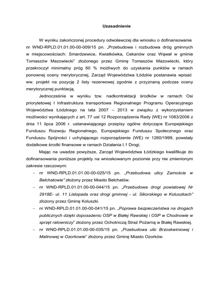 Uzasadnienie W wyniku zakończonej procedury odwoławczej dla wniosku o dofinansowanie nr WND-RPLD.01.01.00-00-009/15 pn. „Przebudowa i rozbudowa dróg gminnych w miejscowościach: Smardzewice, Kwiatkówka, Cekanów oraz Wąwał w gminie Tomaszów Mazowiecki” złożonego przez Gminę Tomaszów Mazowiecki, który przekroczył minimalny próg 60 % możliwych do uzyskania punktów w ramach ponownej oceny merytorycznej, Zarząd Województwa Łódzkie postanawia wpisać ww. projekt na pozycję 2 listy rezerwowej zgodnie z przyznaną podczas oceny merytorycznej punktacją. Jednocześnie w wyniku tzw. nadkontraktacji środków w ramach Osi priorytetowej I Infrastruktura transportowa Regionalnego Programu Operacyjnego Województwa Łódzkiego na lata 2007 – 2013 w związku z wykorzystaniem możliwości wynikających z art. 77 ust 12 Rozporządzenia Rady (WE) nr 1083/2006 z dnia 11 lipca 2006 r. ustanawiającego przepisy ogólne dotyczące Europejskiego Funduszu Rozwoju Regionalnego, Europejskiego Funduszu Społecznego oraz Funduszu Spójności i uchylającego rozporządzenie (WE) nr 1260/1999, powstały dodatkowe środki finansowe w ramach Działania I.1 Drogi. Mając na uwadze powyższe, Zarząd Województwa Łódzkiego kwalifikuje do dofinansowania poniższe projekty na wnioskowanym poziomie przy nie zmienionym zakresie rzeczowym: nr WND-RPLD.01.01.00-00-025/15 pn. „Przebudowa ulicy Zamoście w Bełchatowie” złożony przez Miasto Bełchatów. nr WND-RPLD.01.01.00-00-044/15 pn. „Przebudowa drogi powiatowej Nr 2918E- ul. 11 Listopada oraz drogi gminnej - ul. Sikorskiego w Koluszkach” złożony przez Gminę Koluszki. nr WND-RPLD.01.01.00-00-041/15 pn. „Poprawa bezpieczeństwa na drogach publicznych dzięki doposażeniu OSP w Białej Rawskiej i OSP w Chodnowie w sprzęt ratowniczy” złożony przez Ochotniczą Straż Pożarną w Białej Rawskiej. nr WND-RPLD.01.01.00-00-035/15 pn. „Przebudowa ulic Brzoskwiniowej i Malinowej w Ozorkowie” złożony przez Gminę Miasto Ozorków. nr WND-RPLD.01.01.00-00-042/15 pn. „Poprawa bezpieczeństwa na drogach publicznych dzięki doposażeniu OSP w Głownie w sprzęt ratowniczy” złożony przez Ochotniczą Straż Pożarną w Głownie. nr WND-RPLD.01.01.00-00-048/15 pn. „Przebudowa odcinka drogi powiatowej nr 2930E w Gminie Tuszyn” złożony przez Powiat Łódzki Wschodni. nr WND-RPLD.01.01.00-00-045/15 pn. „Przebudowa ul. Raciborskiego, Kilińskiego, Kołłątaja oraz Topolowej w Radomsku” złożony przez Miasto Radomsko. nr WND-RPLD.01.01.00-00-023/15 pn. „Poprawa dostępności komunikacyjnej centrum Opoczna poprzez rozbudowę sieci dróg gminnych: ul. Skłodowskiej, ul. św. Marka oraz ul. Kwiatowej” złożony przez Gminę Opoczno. nr WND-RPLD.01.01.00-00-017/15 pn. „Przebudowa dróg gminnych na terenie miasta Łęczyca - ul. Wojska Polskiego” złożony przez Gminę Miasto Łęczyca. nr WND-RPLD.01.01.00-00-005/15 pn. „Poprawa bezpieczeństwa ruchu drogowego na drogach gminnych poprzez przebudowę drogi gminnej Nr 101256E Niedyszyna - Postękalice oraz utworzenie ciągu pieszo-rowerowego w m. Zdzieszulice Dolne” złożony przez Gminę Bełchatów. nr WND-RPLD.01.01.00-00-016/15 pn. „Przebudowa dróg gminnych - ul. Staromiejska” złożony przez Gminę Miasto Łęczyca. nr WND-RPLD.01.01.00-00-019/15 pn. „Dokończenie realizacji budowy i przebudowy układu komunikacyjnego gminy Poddębice” złożony przez Gminę Poddębice. nr WND-RPLD.01.01.00-00-034/15 pn. „Rozbudowa drogi powiatowej nr 3109E na odcinku granica Gminy Opoczno/Drzewica-Radzice Małe i drogi powiatowej nr 3111 E na odcinku Radzice Małe-Radzice Duże. Etap I odcinek Radzice Małe-Radzice Duże” złożony przez Powiat Opoczyński. nr WND-RPLD.01.01.00-00-040/15 pn. „Przebudowa dróg gminnych w Uniejowie” złożony przez Gminę Uniejów. nr WND-RPLD.01.01.00-00-047/15 pn. „Przebudowa dróg lokalnych w Konstantynowie Łódzkim - ul. Bechcice” złożony przez Gminę Konstantynów Łódzki. nr WND-RPLD.01.01.00-00-033/15 pn. „Rozwój infrastruktury drogowej na terenie Gminy Miasto Zgierz” złożony przez Gminę Miasto Zgierz. nr WND-RPLD.01.01.00-00-039/15 pn. „Termy Uniejów -Regionalny Markowy Produkt Turystyki Uzdrowiskowej - działanie I.1 Drogi - etap II” złożony przez Gminę Uniejów. nr WND-RPLD.01.01.00-00-001/15 pn. „Budowa drogi dojazdowej do ŁSSE podstrefy Aleksandrów” złożony przez Gminę Aleksandrów Łódzki. nr WND-RPLD.01.01.00-00-037/15 pn. „Modernizacja sieci dróg lokalnych na obszarze Gminy Głowno” złożony przez Gminę Głowno. Ponadto Zarząd Województwa Łódzkiego jako Instytucja Zarządzająca Regionalnym Programem Operacyjnym Województwa Łódzkiego na lata 2007 - 2013, podjął decyzję dotyczącą realokacji środków pochodzących z Budżetu Państwa do działania I.1 Drogi. W wyniku dokonanej realokacji, w/w środki przeznaczone zostają na zakwalifikowanie dwóch projektów znajdujących się na liście rezerwowej: - projekt nr WND-RPLD.01.01.00-00-012/15 pn. „Przebudowa ulicy Św. Teresy od Dzieciątka Jezus na odc. od linii kolejowej nr 15 relacji Łódź Kaliska-Bednary do ul. Szczecińskiej w Łodzi - odcinek od ul. Szczecińskiej do ul. Traktorowej” złożony przez Miasto Łódź w łącznej kwocie dofinansowania 10 213 665,91 PLN w tym kwota dofinansowania z EFRR 3 759 956,41 PLN. projekt nr WND-RPLD.01.01.00-00-006/15 pn. „Budowa drogi łączącej Rondo Solidarności z ul. Rawską w Skierniewicach” złożony przez Miasto Skierniewice w łącznej kwocie dofinansowania 12 368 930,01 PLN w tym kwota dofinansowania z EFRR 5 915 220,51 PLN. Zatem zmianie ulegają załącznik nr 1 oraz załącznik nr 2 do Uchwały Nr 50/16 Zarządu Województwa Łódzkiego z dnia 27 stycznia 2016 r. w sprawie: zakwalifikowania projektów do dofinansowania oraz utworzenia listy rezerwowej projektów do dofinansowania ze środków Europejskiego Funduszu Rozwoju Regionalnego w ramach Konkurs