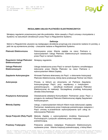 PayU S.A. ul. Grunwaldzka 182 60-166 Poznań Tel. +48 61 628 45 05 Email: [email protected] www.payu.pl REGULAMIN USŁUGI PŁATNOŚCI ELEKTRONICZNYCH Niniejszy regulamin przeznaczony jest dla podmiotów, które zawarły z PayU umowę o korzystanie z Systemu na warunkach określonych przez PayU w Regulaminie Systemu. Definicje Ilekroć w Regulaminie używane są następujące określenia przyjmują one znaczenie nadane im poniżej, a jeśli nie są wymienione poniżej – znaczenie nadane w Regulaminie Systemu: Płatność Elektroniczna Dokonywana przez Klienta zapłata na rzecz Partnera z wykorzystaniem Usługi Płatności Elektronicznych świadczonej przez PayU w ramach Systemu. Regulamin Usługi Płatności Elektronicznych Niniejszy regulamin. Usługa Płatności Elektronicznych Usługa świadczona przez PayU w ramach Systemu umożliwiająca dokonanie przez Klienta Płatności na rzecz Partnera z wykorzystaniem Metod Zapłaty. Zapytanie Autoryzacyjne Wniosek Partnera skierowany do PayU o dokonanie Autoryzacji Płatności Elektronicznej, której dane przekazuje Partner lub Klient. Autoryzacja Proces, w którym po otrzymaniu od Partnera Zapytania Autoryzacyjnego PayU, przy współpracy z Instytucjami pośredniczącymi, weryfikuje możliwość przyjęcia Płatności Elektronicznej do realizacji. Szczegółowy przebieg Autoryzacji określa Dokumentacja Pozytywna Autoryzacja Oświadczenie składane Komunikatem Partnerowi przez PayU o przyjęciu do realizacji Płatności Elektronicznej objętej Zapytaniem Autoryzacyjnym. Metody Zapłaty Usługi, z wykorzystaniem których Klient może dokonywać zapłaty Partnerowi, świadczone przez Instytucje pośredniczące związane z PayU umową w przedmiocie wykorzystywania tych usług do dokonywania Płatności. Opcja Pożyczki (Raty PayU) Metoda Zapłaty z wykorzystaniem środków finansowych Pochodzących z pożyczki udzielonej przez Instytucję pośredniczącą. Przelewy Tradycyjne Polecenia przelewu niebędące Przelewami Elektronicznymi, wydawane przez Klienta Instytucji pośredniczącej, z którą Klient PayU SA z siedzibą w Poznaniu, 60-166 Poznań, przy ul. Grunwaldzkiej 182, wpisana do rejestru przedsiębiorców prowadzonego przez Sąd Rejonowy w Poznaniu – Nowe Miasto i Wilda w Poznaniu, Wydział VIII Gospodarczy Krajowego Rejestru Sądowego pod numerem KRS 0000274399, o kapitale zakładowym w wysokości 4.944.000 PLN, w całości opłaconym, posiadająca numer identyfikacji podatkowej NIP: 779-23-08-495, REGON 300523444. PayU S.A. ul. Grunwaldzka 182 60-166 Poznań Tel. +48 61 628 45 05 Email: [email protected] www.payu.pl związany jest umową o wykonanie takiego polecenia przelewu. Płatności Pozostałe Zlecenia płatnicze inne niż Przelewy Elektroniczne, Przelewy Tradycyjne oraz Płatności Kartą Płatniczą, wydawane przez Klienta Instytucjom pośredniczącym w celu przekazania Partnerowi środków w ramach procedury realizacji Płatności Elektronicznej. Płatność Kartą Płatniczą Dokonywana przez Klienta zapłata na rzecz Partnera z wykorzystaniem usługi Płatności Kartami Płatniczymi świadczonej przez PayU w ramach Systemu polegającej na umożliwieniu Klientowi zapłaty na rzecz Partnera dokonywanej z wykorzystaniem kart płatniczych wydanych pod auspicjami międzynarodowych organizacji płatniczych obsługiwanych przez PayU. § 1 PRZEDMIOT REGULAMINU Przedmiotem Regulaminu Płatności Elektronicznych jest określenie zasad współpracy PayU i Partnera przy przyjmowaniu przez Partnera zapłaty z wykorzystaniem Usługi Płatności Elektronicznych świadczonej przez PayU w ramach Systemu. § 2 POSTANOWIENIA OGÓLNE 1. PayU udostępnia Usługę Płatności Elektronicznych w Systemie w terminie 14 dni od wysłania przez PayU Komunikatu o akceptacji wniosku o zawarcie umowy świadczenia Usługi Płatności Elektronicznych (Umowa Produktowa). 2. PayU może zaakceptować wniosek Partnera o zawarcie umowy świadczenia Usługi Płatności Elektronicznych zarówno w całości, jak i w części poprzez udostępnienie Partnerowi jedynie wybranych przez PayU Metod Zapłaty, lub uzależnić udostępnienie pozostałych Metod Zapłaty od spełnienia przez Partnera dodatkowych warunków. 3. Opcja Pożyczki jest udostępniana przez PayU w Serwisie w przypadku gdy PayU zawarła z Instytucją pośredniczącą umowę o współpracy w zakresie oferowania Opcji Pożyczki. 4. Udostępnienie Opcji Pożyczki podlega postanowieniom umowy, o której mowa w ust. 3, przez okres jej obowiązywania. W przypadku rozwiązania powyższej umowy: a. z zachowaniem terminu wypowiedzenia, PayU zawiadomi Partnera w terminie 7 dni od złożenia lub otrzymania oświadczenia o wypowiedzeniu umowy, b. ze skutkiem natychmiastowym, PayU zawiadomi Partnera o złożeniu lub otrzymaniu takiego wypowiedzenia w tym samym dniu. 5. PayU może odmówić, zawiesić lub wyłączyć Opcję Pożyczki w Serwisie Partnera na żądanie Instytucji pośredniczącej. 6. Wynagrodzenie PayU za świadczenie Usługi Płatności Elektronicznych, zostało określone we wniosku o zawarcie Umowy Produktowej. Zapłata następuje w trybie określonym w §13 Regulaminu Systemu. PayU SA z siedzibą w Poznaniu, 60-166 Poznań, przy ul. Grunwaldzkiej 182, wpisana do rejestru przedsiębiorców prowadzonego przez Sąd Rejonowy w Poznaniu – Nowe Miasto i Wilda w Poznaniu, Wydział VIII Gospodarczy Krajowego Rejestru Sądowego pod numerem KRS 0000274399, o kapitale zakładowym w wysokości 4.944.000 PLN, w całości opłaconym, posiadająca numer identyfikacji podatkowej NIP: 779-23-08-495, REGON 300523444. PayU S.A. ul. Grunwaldzka 182 60-166 Poznań Tel. +48 61 628 45 05 Email: [email protected] www.payu.pl 7. PayU nie zapewnia ciągłej dostępności Usługi Płatności Elektronicznych co do wszystkich Metod Zapłaty. Metody Zapłaty udostępniane są w Systemie jedynie w godzinach, w których usługi te udostępniane są przez świadczące je Instytucje pośredniczące. 8. Partner zobowiązuje s