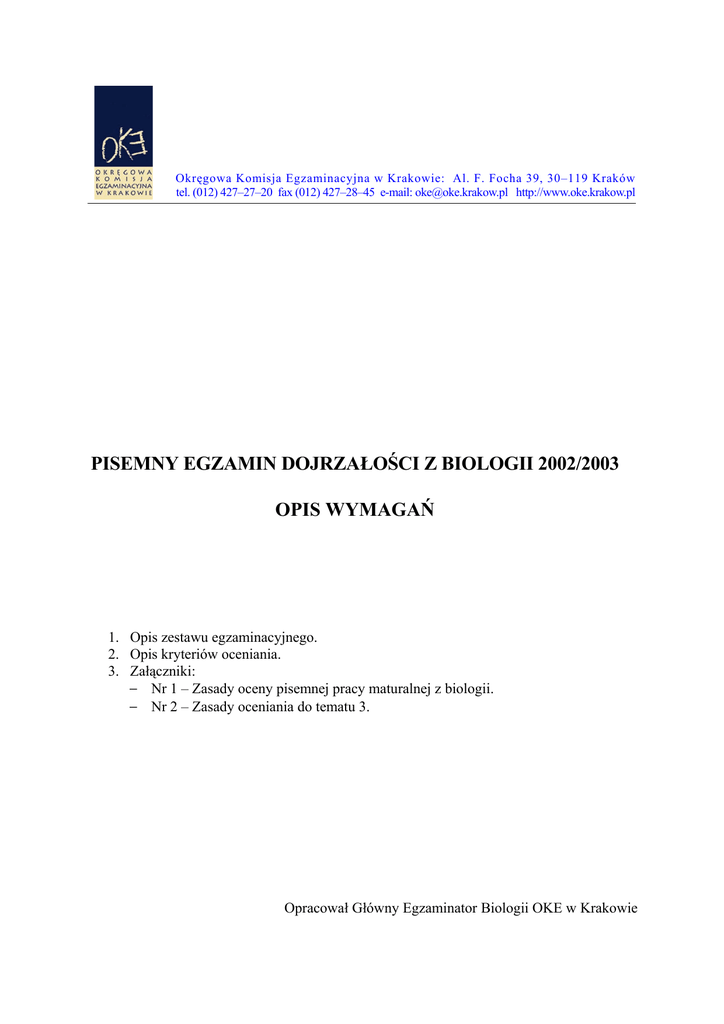 Okręgowa Komisja Egzaminacyjna w Krakowie: Al. F. Focha 39, 30–119 Kraków tel. (012) 427–27–20 fax (012) 427–28–45 e-mail: [email protected] http://www.oke.krakow.pl PISEMNY EGZAMIN DOJRZAŁOŚCI Z BIOLOGII 2002/2003 OPIS WYMAGAŃ 1. Opis zestawu egzaminacyjnego. 2. Opis kryteriów oceniania. 3. Załączniki: − Nr 1 – Zasady oceny pisemnej pracy maturalnej z biologii. − Nr 2 – Zasady oceniania do tematu 3. Opracował Główny Egzaminator Biologii OKE w Krakowie PISEMNY EGZAMIN DOJRZAŁOŚCI Z BIOLOGII 2002/2003 OPIS WYMAGAŃ OPIS ZESTAWU EGZAMINACYJNEGO: Zestawy tematów egzaminacyjnych z biologii są przygotowane zgodnie z obowiązującym Rozporządzeniem MEN, które określa zasady przeprowadzania pisemnego egzaminu dojrzałości z biologii. Oznacza to czas trwania egzaminu wynoszący 5 godzin zegarowych i możliwość wyboru przez abiturienta jednego spośród trzech podanych tematów (Zał. nr 1 do Rozp. MEN z dnia 21 marca 2001 r. poz. 323 – Dz. U. z 6 kwietnia 2001 r. nr 29; Rozp. MENiS z 6 listopada 2001 r. – Dz. U. Nr 128, poz. 1419). Przygotowane są dwa zestawy tematów egzaminacyjnych: • dla młodzieży (w klasach o profilu ogólnym, pedagogicznym i innych profilach realizowanych w liceum ogólnokształcącym, liceum technicznym, wszystkich typach średnich szkół zawodowych dla młodzieży, oraz w klasach o profilu biologiczno-chemicznym) – wspólny zestaw zawierający wymagania dla wszystkich typów szkół nazywanych dalej wymaganiami dla profilu ogólnego oraz wyróżnione wymagania dla profilu biologiczno-chemicznego, • dla dorosłych (we wszystkich typach szkół dla dorosłych) – zestaw zawierający wymagania jak dla profilu ogólnego. 1. W każdym zestawie egzaminacyjnym dwa pierwsze tematy mają charakter tradycyjnego wypracowania (esseju): A. W zestawie dla młodzieży są jednakowo sformułowane zarówno dla profilu ogólnego, jak i biologiczno-chemicznego, a różnicują je jedynie szczegółowe kryteria oceniania, które są inne w obu przypadkach dla wymagań na ocenę bardzo dobrą. B. W zestawie dla dorosłych są sformułowane podobnie jak dla zestawu dla młodzieży z kryteriami wymagań dla profilu ogólnego. C. W obu zestawach wymagany zakres treści dla obu tematów wzajemnie się uzupełnia obejmując maksymalnie szeroki zakres treści programowych (ze wszystkich działów biologii zawartych w Podstawie programowej – Rozporządzenie MEN z 30 czerwca 1999 r., Dz. U. Nr 60 z 1999r., poz. 642). D. Każdy z tematów pozwala zdającemu na wykazanie się: • znajomością i rozumieniem wielu pojęć, praw, zjawisk i procesów biologicznych; • samodzielnością w formułowaniu i uzasadnianiu opinii i sądów na podstawie posiadanych informacji oraz • umiejętnością integrowania wiedzy z nauk przyrodniczych i humanistycznych oraz wewnątrzprzedmiotowej wiedzy z różnych działów biologii. 2. Temat trzeci w obu zestawach jest przygotowany w formie pakietu zadań . A. Brzmienie tego tematu jest traktowane symbolicznie i stanowi jedynie ukierunkowanie dla tematyki większości zadań. Oznacza to, że zamieszczone w pakiecie zadania z założenia obejmują bardzo szeroki zakres treści z wszystkich działów Podstawy Programowej (Dz. U. Nr 60 z 1999r., poz. 642) Treści 1. Struktura organizmu: − komórki, ich budowa i pełnione funkcje; − komórki bakteryjne, znaczenie bakterii w przyrodzie i życiu człowieka, choroby bakteryjne; − wirusy, bakterii roślin i zwierząt, choroby wirusowe człowieka; − tkanki i organy, ich budowa i pełnione funkcje (na wybranych przykładach). 2 PISEMNY EGZAMIN DOJRZAŁOŚCI Z BIOLOGII 2002/2003 OPIS WYMAGAŃ 2. Fizjologia organizmów roślinnych i zwierzęcych: 1) odżywianie: − potrzeby pokarmowe i sposoby odżywiania się organizmów; − układ pokarmowy i przebieg procesów trawiennych u człowieka; − zasady racjonalnego odżywiania; 2) oddychanie i wymiana gazowa: − oddychanie tlenowe i beztlenowe; − wymiana gazowa u roślin i zwierząt; − układ oddechowy człowieka i jego schorzenia; 3) transport substancji i płyny ustrojowe: − transport substancji u roślin, płyny ustrojowe u zwierząt; − funkcje homeostatyczne i obronne u człowieka pełnione przez krew; − choroby układu krążenia; 4) wydalanie: − zbędne i szkodliwe produkty przemiany materii i sposoby ich usuwania przez rośliny i zwierzęta; − układ wydalniczy u człowieka i jego schorzenia; 5) rozmnażanie i rozwój organizmów: − rozmnażanie bezpłciowe i płciowe; − wzrost i rozwój roślin i zwierząt; − biologia rozmnażania się i rozwój człowieka; 6) regulacja i koordynacja procesów życiowych: − regulacja hormonalna u roślin; − regulacja hormonalna u człowieka i jej zaburzenia; − budowa, funkcje i higiena układu nerwowego oraz wybranych narządów zmysłów człowieka. 3. Elementy cytologii i genetyki: − ultrastruktura komórki, organelle, błony biologiczne, cytoszkielet; − budowa DNA, kod genetyczny, synteza białek; − mutacje, czynniki mutagenne; − choroby dziedziczne; − zasady inżynierii genetycznej, zastosowania biotechnologii. 4. Elementy ewolucjonizmu: − pojęcie gatunku; − mutacje i ich konsekwencje, dobór naturalny; − zasady klasyfikacji naturalnej, drzewa filogenetyczne roślin i zwierząt; − ewolucja naczelnych. 5. Ekologia i ochrona środowiska przyrodniczego: − populacja i parametry ją charakteryzujące; − ekosystem, główne typy ekosystemów Ziemi, struktura troficzna ekosystemu, przepływ energii i krążenie materii w ekosystemie, sukcesja ekologiczna; − antropopresja, przyczyny i skutki zmniejszania różnorodności biologicznej; − chemiczne zanieczyszczenie powietrza, wody, gleby, nadmierne odwadnianie i erozja gleb, eutrofizacja wód; − zasoby odnawialne i nieodnawialne, racjonalna gospodarka zasobami; − zasada zrównoważonego rozwoju. 3 PISEMNY EGZAMIN DOJRZAŁOŚCI Z BIOLOGII 2002/2003 OPIS WYMAGAŃ B. Zamieszczone