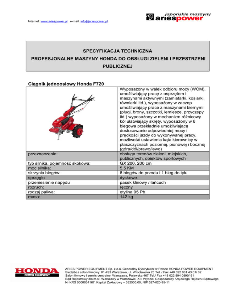 Internet: www.ariespower.pl e-mail: [email protected] SPECYFIKACJA TECHNICZNA PROFESJONALNE MASZYNY HONDA DO OBSŁUGI ZIELENI I PRZESTRZENI PUBLICZNEJ Ciągnik jednoosiowy Honda F720 przeznaczenie: typ silnika, pojemność skokowa: moc silnika: skrzynia biegów: sprzęgło przeniesienie napędu rozruch: rodzaj paliwa: masa: Wyposażony w wałek odbioru mocy (WOM), umożliwiający pracę z osprzętem i maszynami aktywnymi (zamiatarki, kosiarki, równiarki itd.), wyposażony w zaczep umożliwiający prace z maszynami biernymi (pługi, brony, szczotki, lemiesze, przyczepy itd.) wyposażony w mechanizm różnicowy kół ułatwiający skręty, wyposażony w 6 biegowa przekładnie umożliwiającą dostosowanie odpowiedniej mocy i prędkości jazdy do wykonywanej pracy, możliwość ustawienia kąta kierownicy w płaszczyznach poziomej, pionowej i bocznej (góra/dół/prawo/lewo) obsługa terenów zieleni, miejskich, publicznych, obiektów sportowych GX 200, 200 cm 5,5 KM 6 biegów do przodu i 1 bieg do tyłu dyskowe pasek klinowy / łańcuch ręczny etylina 95 Pb 142 kg ARIES POWER EQUIPMENT Sp. z o.o. Generalny Dystrybutor w Polsce HONDA POWER EQUIPMENT Siedziba i salon firmowy: 01-493 Warszawa, ul. Wrocławska 25 Tel. / Fax +48 022 861 43 01/ 02 Salon firmowy i serwis centralny: Warszawa, Puławska 467 Tel./ Fax +48 022 894 0890/ 91 Sąd Rejestrowy dla m.st. Warszawy w Warszawie, XIII Wydział Gospodarczy Krajowego Rejestru Sądowego Nr KRS 0000034167; Kapitał Zakładowy – 382500,00; NIP 527-020-95-11 Internet: www.ariespower.pl e-mail: [email protected] Zamiatarka z pojemnikiem (przesiew granulatu) FBZ 120 zamiatarka przystosowana do współpracy z ciągnikiem jednoosiowym Honda F720, dwie prędkości obrotowe walca szczotki możliwość zainstalowania szczotek o różnej gęstości i twardości, przystosowana do współpracy z dwoma rodzajami pojemników: przesiewającym granulat i zbierającym zanieczyszczenia. przeznaczenie: szerokość robocza: wymiary (dł. x szer. x wys.): masa: usuwanie zanieczyszczeń, śniegu z powierzchni boisk, dróg, placów, chodników 120 cm 166/126/65 cm 103 kg Przyczepa transportowa HV 350 Przyczepa z siedziskiem dla operatora umożliwia transport ładunków o do 350 kg. Jest niezastąpiona do transportu, śmieci, liści, skoszonej trawy. Przydatna podczas wykonywania wszelkich prac pielęgnacyjno porządkowych, mocna skrzynia ładunkowa wyposażona jest w demontowaną bez dodatkowych narzędzi tylną burtę oraz możliwość przechyłu skrzyni ułatwiający rozładunek. Wyposażona w hamulec postojowy i hamulec nożny. przeznaczenie: ładowność wymiary (dł. x szer. x wys.): sprzątanie terenów zieloni, miejskich, sportowych 350 kg 140/121/30 cm ARIES POWER EQUIPMENT Sp. z o.o. Generalny Dystrybutor w Polsce HONDA POWER EQUIPMENT Siedziba i salon firmowy: 01-493 Warszawa, ul. Wrocławska 25 Tel. / Fax +48 022 861 43 01/ 02 Salon firmowy i serwis centralny: Warszawa, Puławska 467 Tel./ Fax +48 022 894 0890/ 91 Sąd Rejestrowy dla m.st. Warszawy w Warszawie, XIII Wydział Gospodarczy Krajowego Rejestru Sądowego Nr KRS 0000034167; Kapitał Zakładowy – 382500,00; NIP 527-020-95-11 Internet: www.ariespower.pl e-mail: [email protected] Lemiesz odśnieżający przeznaczenie: szerokość robocza: wymiary (dł. x szer. x wys.): masa: przystosowany do współpracy z ciągnikiem jednoosiowym Honda F720, dwustronna odkładnica do zgarniania śniegu z regulacją kąta natarcia i regulacją wysokości. Gumowa listwa zabezpiecza nawierzchnię przed uszkodzeniami mechanicznymi podczas płużenia oraz pozwala na dokładne uprzątnięcie nawet mokrego śniegu podczas roztopów. Usuwanie śniegu lub błota pośniegowego z powierzchni boisk, parkingów, chodników, podjazdów 118 cm 118/50 38 kg Noże glebogryzarki Szerokość 760 mm, średnica 365 mm, 2X4 sekcje, tarcze ochronne, układ 8-gwiezdny, wał okrągły wzmocniony. przeznaczenie obsługa terenów zieleni, miejskich, publicznych, obiektów sportowych ARIES POWER EQUIPMENT Sp. z o.o. Generalny Dystrybutor w Polsce HONDA POWER EQUIPMENT Siedziba i salon firmowy: 01-493 Warszawa, ul. Wrocławska 25 Tel. / Fax +48 022 861 43 01/ 02 Salon firmowy i serwis centralny: Warszawa, Puławska 467 Tel./ Fax +48 022 894 0890/ 91 Sąd Rejestrowy dla m.st. Warszawy w Warszawie, XIII Wydział Gospodarczy Krajowego Rejestru Sądowego Nr KRS 0000034167; Kapitał Zakładowy – 382500,00; NIP 527-020-95-11 Internet: www.ariespower.pl e-mail: [email protected] Glebogryzarka FJ 500 DER przeznaczenie: typ silnika, pojemność skokowa: moc silnika: skrzynia biegów: rozruch: rodzaj paliwa: masa: Przeznaczona do prac w ciągach zieleni miejskiej, ogrodach, szkółkach, sadach. Maszyna dzięki swojej konstrukcji przeznaczona do pracy w ciężkich warunkach, wyposażona w 2 biegową przekładnie przód/tył, możliwość ustawienia kierownicy w płaszczyznach góra/dół, możliwość regulacji szerokości zespołu noży roboczych. prace w ciągach zieleni miejskiej/komunalne GX 160, 160 cm 4,8 KM 1 bieg do przodu i 1 bieg do tyłu ręczny etylina 95 Pb 57 kg Glebogryzarka FG 315 E2 Przeznaczona do prac na terenach zieleni miejskiej, ogrodach, szkółkach, sadach. Wyposażona w 2 biegową przekładnie przód/tył, możliwość ustawienia kierownicy w płaszczyznach góra/dół, możliwość regulacji szerokości zespołu noży roboczych. przeznaczenie: typ silnika, pojemność skokowa: moc silnika: skrzynia biegów: rozruch: rodzaj paliwa: masa: prace w ciągach zieleni miejskiej GC 160, 160 cm 4,8 KM 1 bieg do przodu i 1 bieg do tyłu ręczny etylina 95 Pb 53 kg ARIES POWER EQUIPMENT Sp. z o.o. Generalny Dystrybutor w Polsce HONDA POWER EQUIPMENT Siedziba i salon firmowy: 01-493 Warszawa, ul. Wrocławska 25 Tel. / Fax +48 022 861 43 01/ 02 Salon firmowy i serwis centralny: Warszawa, Puławska 467 Tel./ Fax +48 022 894 0890/ 91 Sąd Rejestrowy dla m.st. Warszawy w Warszawie, XIII Wydział Gospodarczy Krajowego Rejestru Sądowego Nr 