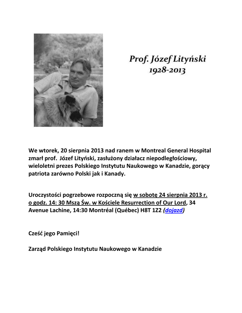 We wtorek, 20 sierpnia 2013 nad ranem w Montreal General Hospital zmarł prof. Józef Lityński, zasłużony działacz niepodległościowy, wieloletni prezes Polskiego Instytutu Naukowego w Kanadzie, gorący patriota zarówno Polski jak i Kanady. Uroczystości pogrzebowe rozpoczną się w sobotę 24 sierpnia 2013 r. o godz. 14: 30 Mszą Św. w Kościele Resurrection of Our Lord, 34 Avenue Lachine, 14:30 Montréal (Québec) H8T 1Z2 (dojazd) Cześć jego Pamięci! Zarząd Polskiego Instytutu Naukowego w Kanadzie Józef Lityński urodził się w 1928 roku w Warszawie. Studiował geofizykę, doktorat z nauk o Ziemi - specjalność: meteorologia - obronił na Uniwersytecie Warszawskim. Pracował w Państwowym Instytucie Hydrologiczno-Meteorologicznym, był kierownikiem Zakładu Prognoz Długoterminowych i adiunktem w Instytucie Matematyki Politechniki Warszawskiej. W latach 1969-1993 profesor na Wydziale Geografii Universite du Ouebec a Trois-Rivieres. Jako ekspert Światowej Organizacji Meteorologicznej (OMM) pracował m.in. w Kongu, na Madagaskarze i w Gabonie. Prowadził badania klimatu wysp Południowego Pacyfiku - Polinezja, Nowa Kaledonia. Jest autorem licznych prac z meteorologii i klimatologii. W ostatnich latach zajmował się zmianami klimatycznymi i rolą dwutlenku węgla jako gazu cieplarnianego. Pasjonował się historią wojskowości, zwłaszcza historią kampanii wrześniowej, w której jego ojciec brał aktywny udział jako szef sztabu i której Józef Lityński poświęcił kilka rozpraw historyczno-naukowych. W druku znajduje się jego książka pt. Rok 1939. W latach 1987-1990 był delegatem Rządu RP na Uchodźstwie na Kanadę, a w 1985-2009 pełnił funkcję prezesa Polskiego Instytutu Naukowego w Montrealu. W „Wielkiej wygranej” opisał swoje niezwykle ciekawe losy, począwszy od dzieciństwa, które przypadło na lata wojny, w tym Powstanie Warszawskie, przez trudne komunistyczne czasy, po okres kanadyjski walki o znalezienie nowego miejsca w życiu. Jego praca zawodowa wiązała się z licznymi wyjazdami - nierzadko do bardzo odległych, egzotycznych zakątków świata. Dzięki temu mógł realizować swoje dwie pasje: podróże i fotografię.