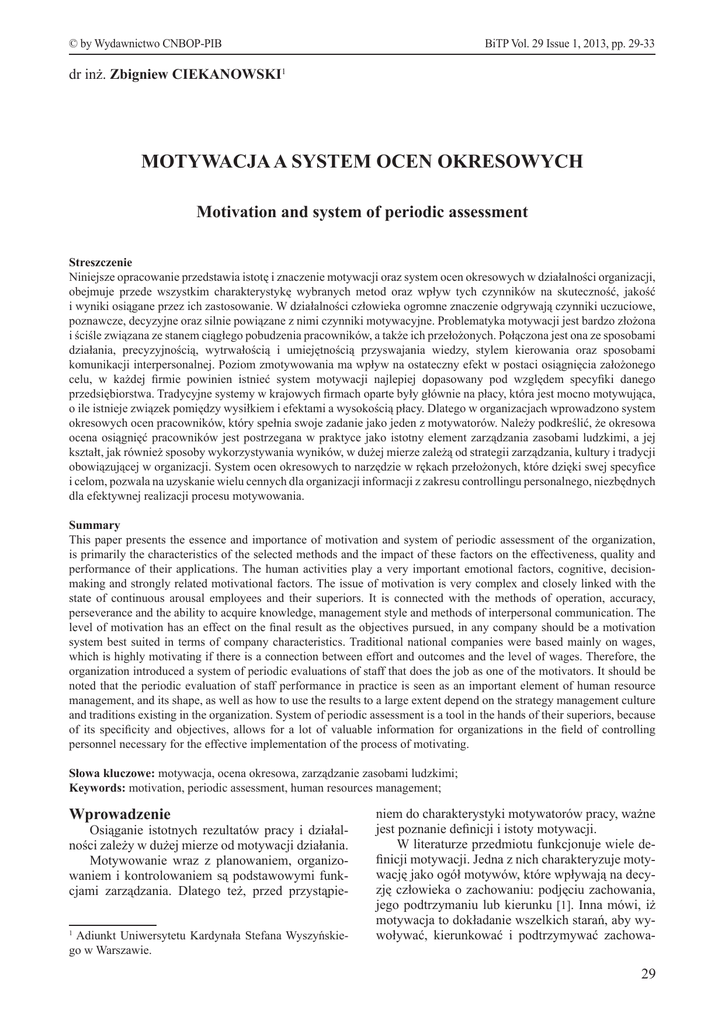 © by Wydawnictwo CNBOP-PIB BiTP Vol. 29 Issue 1, 2013, pp. 29-33 dr inż. Zbigniew CIEKANOWSKI1 MOTYWACJA A SYSTEM OCEN OKRESOWYCH Motivation and system of periodic assessment Streszczenie Niniejsze opracowanie przedstawia istotę i znaczenie motywacji oraz system ocen okresowych w działalności organizacji, obejmuje przede wszystkim charakterystykę wybranych metod oraz wpływ tych czynników na skuteczność, jakość i wyniki osiągane przez ich zastosowanie. W działalności człowieka ogromne znaczenie odgrywają czynniki uczuciowe, poznawcze, decyzyjne oraz silnie powiązane z nimi czynniki motywacyjne. Problematyka motywacji jest bardzo złożona i ściśle związana ze stanem ciągłego pobudzenia pracowników, a także ich przełożonych. Połączona jest ona ze sposobami działania, precyzyjnością, wytrwałością i umiejętnością przyswajania wiedzy, stylem kierowania oraz sposobami komunikacji interpersonalnej. Poziom zmotywowania ma wpływ na ostateczny efekt w postaci osiągnięcia założonego celu, w każdej firmie powinien istnieć system motywacji najlepiej dopasowany pod względem specyfiki danego przedsiębiorstwa. Tradycyjne systemy w krajowych firmach oparte były głównie na płacy, która jest mocno motywująca, o ile istnieje związek pomiędzy wysiłkiem i efektami a wysokością płacy. Dlatego w organizacjach wprowadzono system okresowych ocen pracowników, który spełnia swoje zadanie jako jeden z motywatorów. Należy podkreślić, że okresowa ocena osiągnięć pracowników jest postrzegana w praktyce jako istotny element zarządzania zasobami ludzkimi, a jej kształt, jak również sposoby wykorzystywania wyników, w dużej mierze zależą od strategii zarządzania, kultury i tradycji obowiązującej w organizacji. System ocen okresowych to narzędzie w rękach przełożonych, które dzięki swej specyfice i celom, pozwala na uzyskanie wielu cennych dla organizacji informacji z zakresu controllingu personalnego, niezbędnych dla efektywnej realizacji procesu motywowania. Summary This paper presents the essence and importance of motivation and system of periodic assessment of the organization, is primarily the characteristics of the selected methods and the impact of these factors on the effectiveness, quality and performance of their applications. The human activities play a very important emotional factors, cognitive, decisionmaking and strongly related motivational factors. The issue of motivation is very complex and closely linked with the state of continuous arousal employees and their superiors. It is connected with the methods of operation, accuracy, perseverance and the ability to acquire knowledge, management style and methods of interpersonal communication. The level of motivation has an effect on the final result as the objectives pursued, in any company should be a motivation system best suited in terms of company characteristics. Traditional national companies were based mainly on wages, which is highly motivating if there is a connection between effort and outcomes and the level of wages. Therefore, the organization introduced a system of periodic evaluations of staff that does the job as one of the motivators. It should be noted that the periodic evaluation of staff performance in practice is seen as an important element of human resource management, and its shape, as well as how to use the results to a large extent depend on the strategy management culture and traditions existing in the organization. System of periodic assessment is a tool in the hands of their superiors, because of its specificity and objectives, allows for a lot of valuable information for organizations in the field of controlling personnel necessary for the effective implementation of the process of motivating. Słowa kluczowe: motywacja, ocena okresowa, zarządzanie zasobami ludzkimi; Keywords: motivation, periodic assessment, human resources management; Wprowadzenie1 Osiąganie istotnych rezultatów pracy i działalności zależy w dużej mierze od motywacji działania. Motywowanie wraz z planowaniem, organizowaniem i kontrolowaniem są podstawowymi funkcjami zarządzania. Dlatego też, przed przystąpieAdiunkt Uniwersytetu Kardynała Stefana Wyszyńskiego w Warszawie. 1 niem do charakterystyki motywatorów pracy, ważne jest poznanie definicji i istoty motywacji. W literaturze przedmiotu funkcjonuje wiele definicji motywacji. Jedna z nich charakteryzuje motywację jako ogół motywów, które wpływają na decyzję człowieka o zachowaniu: podjęciu zachowania, jego podtrzymaniu lub kierunku [1]. Inna mówi, iż motywacja to dokładanie wszelkich starań, aby wywoływać, kierunkować i podtrzymywać zachowa- 29 NAUKI HUMANISTYCZNE I SPOŁECZNE NA RZECZ BEZPIECZEŃSTWA nia ludzi dla osiągnięcia zamierzonych celów [2] lub wewnętrzny stan (potrzeba), który aktywuje ludzkie zachowania i nadaje im kierunek [3]. Motywacja rozumiana jest także zarówno jako pewien stan psychiczny, jak i cecha osobowości. W pierwszym znaczeniu motywację utożsamia się ze stanem wewnętrznego napięcia, które wywołuje zachowania zmierzające do jego redukcji. W drugim motywacja to pewna względnie stała właściwość, która nadaje jednostkowym zachowaniom cechę względnie stałego ukierunkowania i wyrazistości [4]. Motywowanie przedstawiane bywa również jako proces oddziaływania przez rozmaite formy i środki na pracowników tak, aby ich zachowania były zgodne z wolą kierującego, aby zmierzały do zrealizowania postawionych przed nimi zadań [5]. W teorii kierowania zespołami ludzkimi formułuje się tezę, że przydatność zawodowa pracownika, mierzona tym, co wnosi on w rozwój organizacji, jest funkcją jego kwalifikacji i motywacji. Wielu stawia sobie pytanie, co właściwie motywuje pracowników do działania, jakie czynniki wpływają na motywację ludzi i wreszcie, czym jest motywacja pracowników. 1. Istota motywacji Motywacja to ogół motywów, a moty