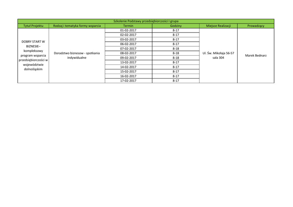 Tytuł Projektu Rodzaj i tematyka formy wsparcia DOBRY START W BIZNESIE– kompleksowy program wsparcia przedsiębiorczości w województwie dolnośląskim Doradztwo biznesow - spotkania indywidualne Szkolenie Podstawy przedsiębiorczości I grupa Termin Godziny 01-02-2017 8-17 02-02-2017 8-17 03-02-2017 8-17 06-02-2017 8-17 07-02-2017 8-18 08-02-2017 8-18 09-02-2017 8-18 13-02-2017 8-17 14-02-2017 8-17 15-02-2017 8-17 16-02-2017 8-17 17-02-2017 8-17 Miejsce Realizacji Prowadzący Ul. Św. Mikołaja 56-57 sala 304 Marek Bednarz
