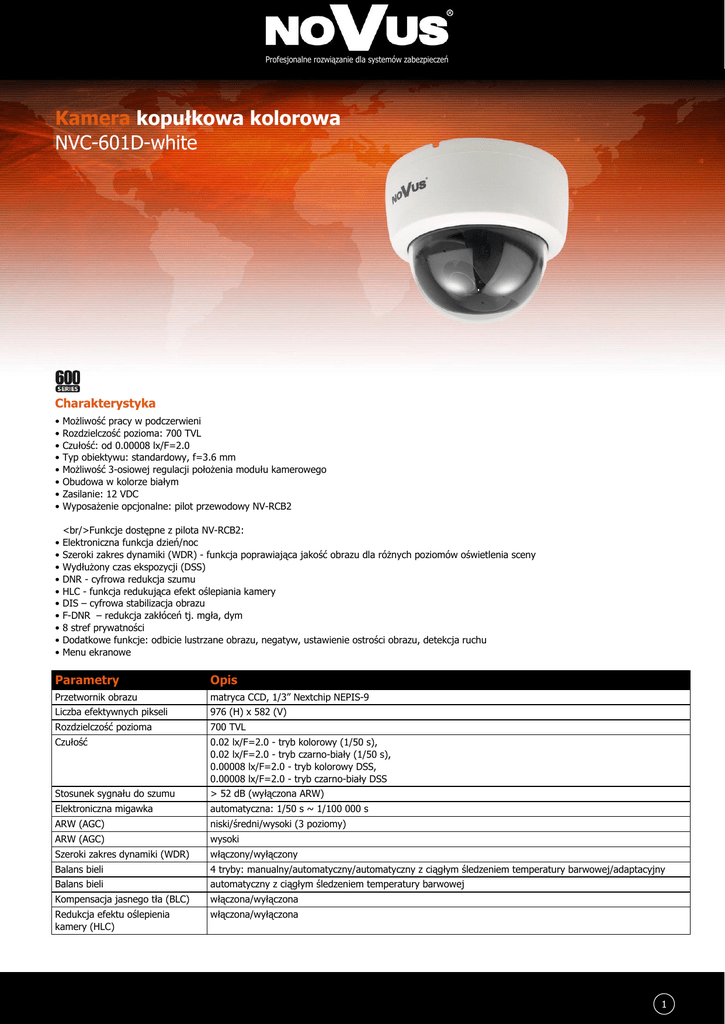 Profesjonalne rozwiązanie dla systemów zabezpieczeń Kamera kopułkowa kolorowa NVC-601D-white Charakterystyka • • • • • • • • Możliwość pracy w podczerwieni Rozdzielczość pozioma: 700 TVL Czułość: od 0.00008 lx/F=2.0 Typ obiektywu: standardowy, f=3.6 mm Możliwość 3-osiowej regulacji położenia modułu kamerowego Obudowa w kolorze białym Zasilanie: 12 VDC Wyposażenie opcjonalne: pilot przewodowy NV-RCB2 • • • • • • • • • • <br/>Funkcje dostępne z pilota NV-RCB2: Elektroniczna funkcja dzień/noc Szeroki zakres dynamiki (WDR) - funkcja poprawiająca jakość obrazu dla różnych poziomów oświetlenia sceny Wydłużony czas ekspozycji (DSS) DNR - cyfrowa redukcja szumu HLC - funkcja redukująca efekt oślepiania kamery DIS – cyfrowa stabilizacja obrazu F-DNR – redukcja zakłóceń tj. mgła, dym 8 stref prywatności Dodatkowe funkcje: odbicie lustrzane obrazu, negatyw, ustawienie ostrości obrazu, detekcja ruchu Menu ekranowe Parametry Opis Przetwornik obrazu matryca CCD, 1/3” Nextchip NEPIS-9 Liczba efektywnych pikseli 976 (H) x 582 (V) Rozdzielczość pozioma 700 TVL Czułość 0.02 lx/F=2.0 - tryb kolorowy (1/50 s), 0.02 lx/F=2.0 - tryb czarno-biały (1/50 s), 0.00008 lx/F=2.0 - tryb kolorowy DSS, 0.00008 lx/F=2.0 - tryb czarno-biały DSS Stosunek sygnału do szumu > 52 dB (wyłączona ARW) Elektroniczna migawka automatyczna: 1/50 s ~ 1/100 000 s ARW (AGC) niski/średni/wysoki (3 poziomy) ARW (AGC) wysoki Szeroki zakres dynamiki (WDR) włączony/wyłączony Balans bieli 4 tryby: manualny/automatyczny/automatyczny z ciągłym śledzeniem temperatury barwowej/adaptacyjny Balans bieli automatyczny z ciągłym śledzeniem temperatury barwowej Kompensacja jasnego tła (BLC) włączona/wyłączona Redukcja efektu oślepienia kamery (HLC) włączona/wyłączona 1 Profesjonalne rozwiązanie dla systemów zabezpieczeń Parametry Opis Synchronizacja wewnętrzna Tryb przełączania dzień/noc automatyczny/manualny Typ obiektywu standardowy, f=3.6 mm Poziomy kąt widzenia obiektywu 73° Redukcja migotania włączona/wyłączona Wyjście sygnału wideo BNC, 1.0 Vp-p, 75 Ohm Menu kamery wyświetlane na ekranie monitora Strefy prywatności 8 Dodatkowe funkcje DNR - cyfrowa redukcja szumu, F-DNR – redukcja zakłóceń tj. mgła, dym DIS – cyfrowa stabilizacja obrazu Zoom cyfrowy detekcja ruchu, tworzenie efektów: odbicie lustrzane obrazu, negatyw ustawienie ostrości obrazu Zasilanie 12 VDC Pobór mocy 1,3 W Temperatura pracy -10°C ~ 50°C Wilgotność względna 0% ~ 80% (bez kondensacji) Wymiary (mm) 112 (Ø) x 87 (wys) Masa 210 g XXXXXXXXXXXX Funkcje dostępne z opcjonalnego pilota NV-RCB2 2