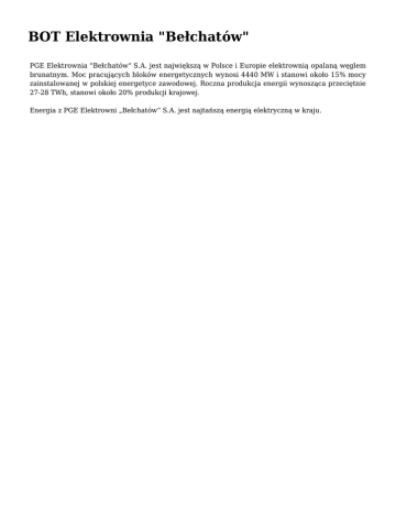 BOT Elektrownia "Bełchatów" PGE Elektrownia "Bełchatów" S.A. jest największą w Polsce i Europie elektrownią opalaną węglem brunatnym. Moc pracujących bloków energetycznych wynosi 4440 MW i stanowi około 15% mocy zainstalowanej w polskiej energetyce zawodowej. Roczna produkcja energii wynosząca przeciętnie 27-28 TWh, stanowi około 20% produkcji krajowej. Energia z PGE Elektrowni „Bełchatów” S.A. jest najtańszą energią elektryczną w kraju.