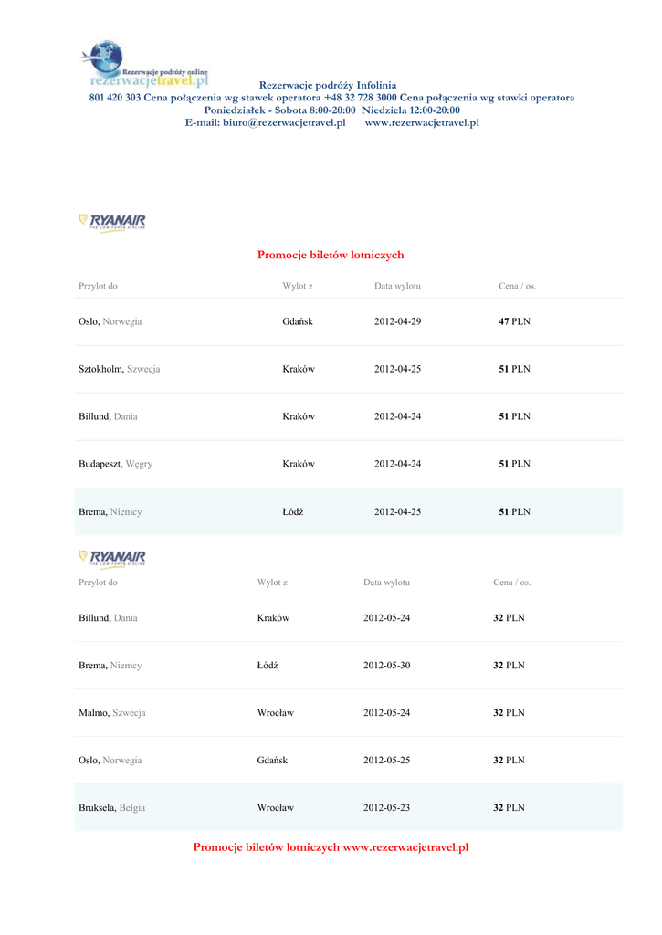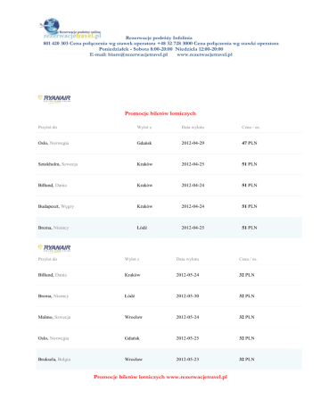 Rezerwacje podróży Infolinia 801 420 303 Cena połączenia wg stawek operatora +48 32 728 3000 Cena połączenia wg stawki operatora Poniedziałek - Sobota 8:00-20:00 Niedziela 12:00-20:00 E-mail: [email protected] www.rezerwacjetravel.pl Promocje biletów lotniczych Przylot do Wylot z Data wylotu Cena / os. Oslo, Norwegia Gdańsk 2012-04-29 47 PLN Sztokholm, Szwecja Kraków 2012-04-25 51 PLN Billund, Dania Kraków 2012-04-24 51 PLN Budapeszt, Węgry Kraków 2012-04-24 51 PLN Brema, Niemcy Łódź 2012-04-25 51 PLN Przylot do Wylot z Data wylotu Cena / os. Billund, Dania Kraków 2012-05-24 32 PLN Brema, Niemcy Łódź 2012-05-30 32 PLN Malmo, Szwecja Wrocław 2012-05-24 32 PLN Oslo, Norwegia Gdańsk 2012-05-25 32 PLN Bruksela, Belgia Wrocław 2012-05-23 32 PLN Promocje biletów lotniczych www.rezerwacjetravel.pl Rezerwacje podróży Infolinia 801 420 303 Cena połączenia wg stawek operatora +48 32 728 3000 Cena połączenia wg stawki operatora Poniedziałek - Sobota 8:00-20:00 Niedziela 12:00-20:00 E-mail: [email protected] www.rezerwacjetravel.pl Przylot do Wylot z Data wylotu Cena / os. Brema, Niemcy Łódź 2012-06-13 50 PLN Budapeszt, Węgry Kraków 2012-06-02 51 PLN Billund, Dania Kraków 2012-06-07 51 PLN Bruksela, Belgia Wrocław 2012-06-06 51 PLN Oslo, Norwegia Wrocław 2012-06-01 51 PLN Przylot do Wylot z Data wylotu Cena / os. Bolonia, Włochy Kraków 2012-07-26 96 PLN Eindhoven, Holandia Kraków 2012-07-04 96 PLN Mediolan, Włochy Łódź 2012-07-23 96 PLN Oslo, Norwegia Kraków 2012-07-22 96 PLN Londyn, Wielka Brytania Warszawa 2012-07-27 96 PLN Promocje biletów lotniczych www.rezerwacjetravel.pl Wybierz Rezerwacje podróży Infolinia 801 420 303 Cena połączenia wg stawek operatora +48 32 728 3000 Cena połączenia wg stawki operatora Poniedziałek - Sobota 8:00-20:00 Niedziela 12:00-20:00 E-mail: [email protected] www.rezerwacjetravel.pl Wylot z Data wylotu Cena / os. Mediolan, Włochy Warszawa 2012-08-31 96 PLN Bruksela, Belgia Warszawa 2012-08-14 96 PLN Oslo, Norwegia Gdańsk 2012-08-08 96 PLN Eindhoven, Holandia Gdańsk 2012-08-04 97 PLN Sztokholm, Szwecja Kraków 2012-08-01 122 PLN Przylot do Wybierz Przylot do Wylot z Data wylotu Cena / os. Oslo, Norwegia Gdańsk 2012-04-25 5 PLN Promocje biletów lotniczych www.rezerwacjetravel.pl Rezerwacje podróży Infolinia 801 420 303 Cena połączenia wg stawek operatora +48 32 728 3000 Cena połączenia wg stawki operatora Poniedziałek - Sobota 8:00-20:00 Niedziela 12:00-20:00 E-mail: [email protected] www.rezerwacjetravel.pl Przylot do Wylot z Data wylotu Cena / os. Trondheim, Norwegia Gdańsk 2012-04-26 21 PLN Goteborg, Szwecja Gdańsk 2012-04-21 21 PLN Malmo, Szwecja Gdańsk 2012-04-25 21 PLN Sztokholm, Szwecja Gdańsk 2012-04-26 21 PLN Przylot do Wylot z Data wylotu Cena / os. Bergen, Norwegia Gdańsk 2012-05-31 5 PLN Goteborg, Szwecja Gdańsk 2012-05-22 5 PLN Hamburg, Niemcy Gdańsk 2012-05-30 5 PLN Malmo, Szwecja Gdańsk 2012-05-16 5 PLN Sztokholm, Szwecja Gdańsk 2012-05-31 5 PLN Przylot do Wylot z Data wylotu Cena / os. Bergen, Norwegia Gdańsk 2012-06-21 5 PLN Goteborg, Szwecja Gdańsk 2012-06-12 5 PLN Promocje biletów lotniczych www.rezerwacjetravel.pl Rezerwacje podróży Infolinia 801 420 303 Cena połączenia wg stawek operatora +48 32 728 3000 Cena połączenia wg stawki operatora Poniedziałek - Sobota 8:00-20:00 Niedziela 12:00-20:00 E-mail: [email protected] www.rezerwacjetravel.pl Przylot do Wylot z Data wylotu Cena / os. Dortmund, Niemcy Łódź 2012-06-19 5 PLN Hamburg, Niemcy Gdańsk 2012-06-22 5 PLN Malmo, Szwecja Katowice 2012-06-23 5 PLN Wybierz Przylot do Wylot z Data wylotu Cena / os. Dortmund, Niemcy Poznań 2012-07-13 5 PLN Malmo, Szwecja Katowice 2012-07-24 5 PLN Sztokholm, Szwecja Katowice 2012-07-03 5 PLN Oslo, Norwegia Katowice 2012-07-13 5 PLN Stavanger, Norwegia Gdańsk 2012-07-07 20 PLN Przylot do Wylot z Data wylotu Cena / os. Malmo, Szwecja Katowice 2012-08-04 5 PLN Sztokholm, Szwecja Poznań 2012-08-28 5 PLN Oslo, Norwegia Gdańsk 2012-08-21 5 PLN Promocje biletów lotniczych www.rezerwacjetravel.pl Rezerwacje podróży Infolinia 801 420 303 Cena połączenia wg stawek operatora +48 32 728 3000 Cena połączenia wg stawki operatora Poniedziałek - Sobota 8:00-20:00 Niedziela 12:00-20:00 E-mail: [email protected] www.rezerwacjetravel.pl Przylot do Wylot z Data wylotu Cena / os. Eindhoven, Holandia Katowice 2012-08-01 20 PLN Dortmund, Niemcy Katowice 2012-08-30 21 PLN Przylot do Wylot z Data wylotu Cena / os. Bergen, Norwegia Gdańsk 2012-09-06 5 PLN Sztokholm, Szwecja Poznań 2012-09-01 5 PLN Goteborg, Szwecja Gdańsk 2012-09-04 5 PLN Malmo, Szwecja Gdańsk 2012-09-28 5 PLN Turku, Finlandia Gdańsk 2012-09-03 5 PLN Przylot do Wylot z Data wylotu Cena / os. Liverpool, Wielka Brytania Kraków 2012-04-21 190 PLN Promocje biletów lotniczych www.rezerwacjetravel.pl Rezerwacje podróży Infolinia 801 420 303 Cena połączenia wg stawek operatora +48 32 728 3000 Cena połączenia wg stawki operatora Poniedziałek - Sobota 8:00-20:00 Niedziela 12:00-20:00 E-mail: [email protected] www.rezerwacjetravel.pl Przylot do Wylot z Data wylotu Cena / os. Belfast, Wielka Brytania Kraków 2012-04-26 216 PLN Bristol, Wielka Brytania Kraków 2012-04-19 237 PLN Edynburg, Wielka Brytania Kraków 2012-04-30 237 PLN Paryż, Francja Kraków 2012-04-24 295 PLN Przylot do Wylot z Data wylotu Cena / os. Liverpool, Wielka Brytania Kraków 2012-05-17 153 PLN Bristol, Wielka Brytania Kraków 2012-05-02 169 PLN Paryż, Francja Kraków 2012-05-10 169 PLN Londyn, Wielka Brytania Kraków 2012-05-10 237 PLN Edynburg, Wielka Brytania Kraków 2012-05-04 238 PLN Przylot do Wylot z Data wylotu Cena / os. Bristol, Wielka Brytania Kraków 2012-06-01 174 PLN Paryż, Francja Kraków 2012-06-11 190 PLN Promocje biletów lotniczych www.rezerwacjetravel.pl Rezerwacje podróży Infolinia 801 420 303 Cena połączenia wg stawek operatora +48 32 728 3000 Cena połączenia wg stawki operatora Poniedziałek - Sobota 8:00-20:00 Niedziel