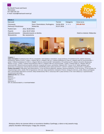My World Travel and Event Warszawa Tel: 530 516 715 E-mail: [email protected] Oferta 1 Kierunek Chorwacja Dalmacja Południowa Podróż tam: Powrót: Zakwaterowanie: Wyżywienie: Hotel Dom Z Kominkiem, Parkingiem, Makarska dnia: 26.06.2016 dnia: 02.07.2016 Zakwaterowanie w domku Bez wyżywienia Termin 26.06.2016 02.07.2016 Kategoria Cena za os. 875.00 PLN Hotel w mieście: Makarska Category: 3 Indoor description: 6-pokojowy dom 170 m2, od południa. Salon/jadalnia z kominkiem, wyspą kuchenną i TV (satelitarna) (TV z płaskim ekranem), klimatyzacją. Wyjście na taras. 1 pokój z 1 łóżkiem (90 cm, o długości 190 cm), 1 łóżkiem podwójnym (2 x 80 cm, o długości 200 cm), prysznicem/WC. 1 pokój z 1 łóżkiem podwójnym (2 x 90 cm, o długości 200 cm), prysznicem/WC. Salon/jadalnia z TV (satelitarna) (TV z płaskim ekranem), klimatyzacją. Wyjście na taras. 1 pokój z 1 łóżkiem dwuosobowym (160 cm, o długości 200 cm), prysznicem/WC. 1 pokój z 2 łóżkami (80 cm, o długości 200 cm), prysznicem/WC. Otwarta kuchnia (4 palniki, piekarnik, zmywarka do naczyń, zamrażarka). Oddzielne WC. 2 tarasy 10 m2. Meble ogrodowe, grill (przenośny). Do dyspozycji: Internet (bezprzewodowy LAN [WLAN], gratis). Każdy apartament z salonem / jadalnią, otwartą kuchnią i 2 sypialniami. Outdoor description: Veliko Brdo: Dom jednorodzinny. 2.5 km od centrum Makarska, spokojne, słoneczne położenie, 2.5 km od morza, 2.5 km od plaży. Do indywidualnego użytku: działka 700 m2 (ogrodzona). Grill, plac zabaw (zjeżdżalnia, huśtawka). W domu: dostęp do internetu, pralka. Miejsca parkingowe (dla 3 samochodów) obok domu na terenie. Sklep wielobranżowy 700 m, restauracja 100 m, plaża żwirowa 2.5 km. Dom składa się z 2 apartamentów, wynajmowane jako jeden. Additional info: Size: 170 m2. Rooms: 6 Bedrooms: 4 Toilets: 5 Bathrooms: 4 GPS: 43.31810122168372; 17.01976387940067 Niniejsza oferta nie stanowi oferty w rozumieniu Kodeksu Cywilnego, a dane w niej zawarte mają jedynie charakter informacyjny i mogą ulec zmianie. Strona 1/1 Powered by TCPDF (www.tcpdf.org)